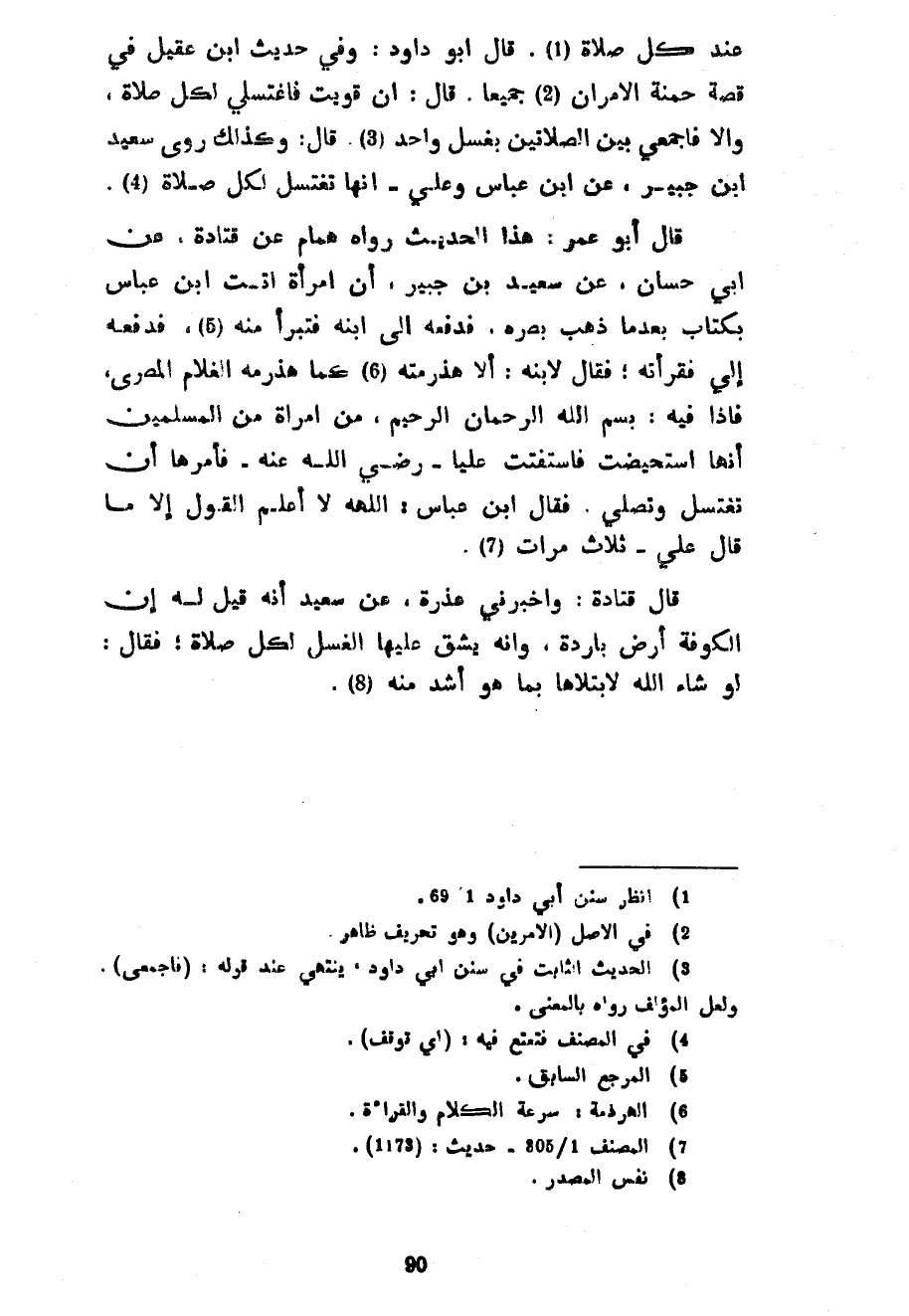 عِنْدَ كُلِّ صَلَاةٍ قَالَ أَبُو دَاوُدَ وَفِي حَدِيثِ ابْنِ عُقَيْلٍ فِي قِصَّةِ حَمْنَةَ الْأَمْرَانِ جَمِيعًا قَالَ إِنْ قَوِيتِ فَاغْتَسِلِي لِكُلِّ صَلَاةٍ وَإِلَّا فَاجْمَعِي بَيْنَ الصَّلَاتَيْنِ بِغُسْلٍ وَاحِدٍ قَالَ وَكَذَلِكَ رَوَى سَعِيدُ بْنُ جُبَيْرٍ عَنِ ابْنِ عَبَّاسٍ وَعَلِيٌّ أَنَّهَا تَغْتَسِلُ لِكُلِّ صَلَاةٍ قَالَ أَبُو عُمَرَ هَذَا الْحَدِيثُ رَوَاهُ هَمَّامٌ عَنْ قَتَادَةَ عَنْ أَبِي حَسَّانٍ عَنْ سَعِيدِ بْنِ جُبَيْرٍ أَنَّ امْرَأَةً أَتَتِ ابْنَ عَبَّاسٍ بِكِتَابٍ بَعْدَمَا ذَهَبَ بَصَرُهُ فَدَفَعَهُ إِلَى ابْنِهِ فَتَبَرَّأَ مِنْهُ فَدَفَعَهُ إِلَيَّ فَقَرَأْتُهُ فَقَالَ لِابْنِهِ أَلَا هَذْرَمْتَهُ كَمَا هَذْرَمَهُ الْغُلَامُ الْمِصْرِيُّ فَإِذَا فِيهِ بسم الله الرحمان الرَّحِيمِ مِنِ امْرَأَةٍ مِنَ الْمُسْلِمِينَ أَنَّهَا اسْتُحِيضَتْ فَاسْتَفْتَتْ عَلِيًّا رَضِيَ اللَّهُ عَنْهُ فَأَمَرَهَا أَنْ تَغْتَسِلَ وَتُصَلِّيَ فَقَالَ ابْنُ عَبَّاسٍ اللَّهُمَّ لَا أَعْلَمُ الْقَوْلَ إِلَّا مَا قَالَ عَلِيٌّ ثَلَاثَ مَرَّاتٍ قَالَ قَتَادَةُ وَأَخْبَرَنِي عُذْرَةُ عَنْ سَعِيدٍ أَنَّهُ قِيلَ لَهُ إِنَّ الْكُوفَةَ أَرْضٌ بَارِدَةٌ وَإِنَّهُ يَشُقُّ عَلَيْهَا الْغُسْلُ لِكُلِّ صَلَاةٍ فَقَالَ لَوْ شَاءَ اللَّهُ لَابْتَلَاهَا بِمَا هُوَ أَشَدُّ منه