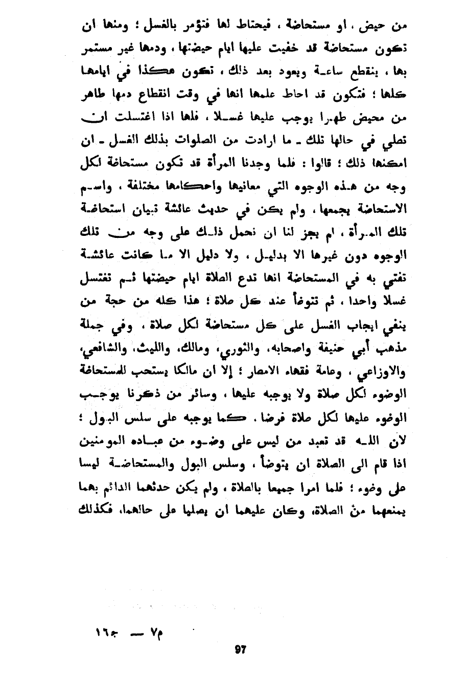 مِنْ حَيْضٍ أَوْ مُسْتَحَاضَةً فَيُحْتَاطُ لَهَا فَتُؤْمَرُ بِالْغُسْلِ وَمِنْهَا أَنْ تَكُونَ مُسْتَحَاضَةً قَدْ خَفِيَتْ عَلَيْهَا أَيَّامُ حَيْضَتِهَا وَدَمُهَا غَيْرُ مُسْتَمِرٍّ بِهَا يَنْقَطِعُ سَاعَةً وَيَعُودُ بَعْدَ ذَلِكَ تَكُونُ هَكَذَا فِي أَيَّامِهَا كُلِّهَا فَتَكُونُ قَدْ أَحَاطَ عِلْمُهَا أَنَّهَا فِي وَقْتِ انْقِطَاعِ دَمِهَا طَاهِرٌ مِنْ مَحِيضٍ طُهْرًا يُوجِبُ عَلَيْهَا غُسْلًا فَلَهَا إِذَا اغْتَسَلَتْ أَنْ تُصَلِّيَ فِي حَالِهَا تِلْكَ مَا أَرَادَتْ مِنَ الصَّلَوَاتِ بِذَلِكَ الْغُسْلِ إِنْ أَمْكَنَهَا ذَلِكَ قَالُوا فَلَمَّا وَجَدْنَا الْمَرْأَةَ قَدْ تَكُونُ مُسْتَحَاضَةً لِكُلِّ وَجْهٍ مِنْ هَذِهِ الْوُجُوهِ الَّتِي مَعَانِيهَا وَأَحْكَامُهَا مُخْتَلِفَةٌ وَاسْمُ الِاسْتِحَاضَةِ يَجْمَعُهَا وَلَمْ يَكُنْ فِي حَدِيثِ عَائِشَةَ تِبْيَانُ اسْتِحَاضَةِ تِلْكَ الْمَرْأَةِ لَمْ يَجُزْ لَنَا أَنْ نَحْمِلَ ذَلِكَ عَلَى وَجْهٍ مِنْ تِلْكَ الْوُجُوهِ دُونَ غَيْرِهَا إِلَّا بِدَلِيلٍ وَلَا دَلِيلَ إِلَّا مَا كَانَتْ عَائِشَةُ تُفْتِي بِهِ فِي الْمُسْتَحَاضَةِ أَنَّهَا تَدَعُ الصَّلَاةَ أَيَّامَ حَيْضَتِهَا ثُمَّ تَغْتَسِلُ غُسْلًا وَاحِدًا ثُمَّ تَتَوَضَّأُ عِنْدَ كُلِّ صَلَاةِ هَذَا كُلُّهُ مِنْ حُجَّةِ مَنْ يَنْفِي إِيجَابَ الْغُسْلِ عَلَى كُلِّ مُسْتَحَاضَةٍ لِكُلِّ صَلَاةٍ وَفِي جُمْلَةِ مَذْهَبِ أَبِي حَنِيفَةَ وَأَصْحَابِهِ وَالثَّوْرِيِّ وَمَالِكٍ وَاللَّيْثِ وَالشَّافِعِيِّ وَالْأَوْزَاعِيِّ وَعَامَّةِ فُقَهَاءِ الْأَمْصَارِ إِلَّا أَنَّ مَالِكًا يَسْتَحِبُّ لِلْمُسْتَحَاضَةِ الْوُضُوءَ لِكُلِّ صَلَاةٍ وَلَا يُوجِبُهُ عَلَيْهَا وَسَائِرُ مَنْ ذَكَرْنَا يُوجِبُ الْوُضُوءَ عَلَيْهَا لِكُلِّ صَلَاةٍ فَرْضًا كَمَا يُوجِبُهُ عَلَى سَلِسِ البول لأن الله قد تبعد مَنْ لَيْسَ عَلَى وُضُوءٍ مِنْ عِبَادِهِ الْمُؤْمِنِينَ إِذَا قَامَ إِلَى الصَّلَاةِ أَنْ يَتَوَضَّأَ وَسَلِسُ الْبَوْلِ وَالْمُسْتَحَاضَةُ لَيْسَا عَلَى وُضُوءٍ فَلَمَّا أُمِرَا جَمِيعًا بِالصَّلَاةِ وَلَمْ يَكُنْ حَدَثُهُمَا الدَّائِمُ بِهِمَا يَمْنَعُهُمَا مِنَ الصَّلَاةِ وَكَانَ عَلَيْهِمَا أَنْ يُصَلِّيَا عَلَى حَالِهِمَا فَكَذَلِكَ