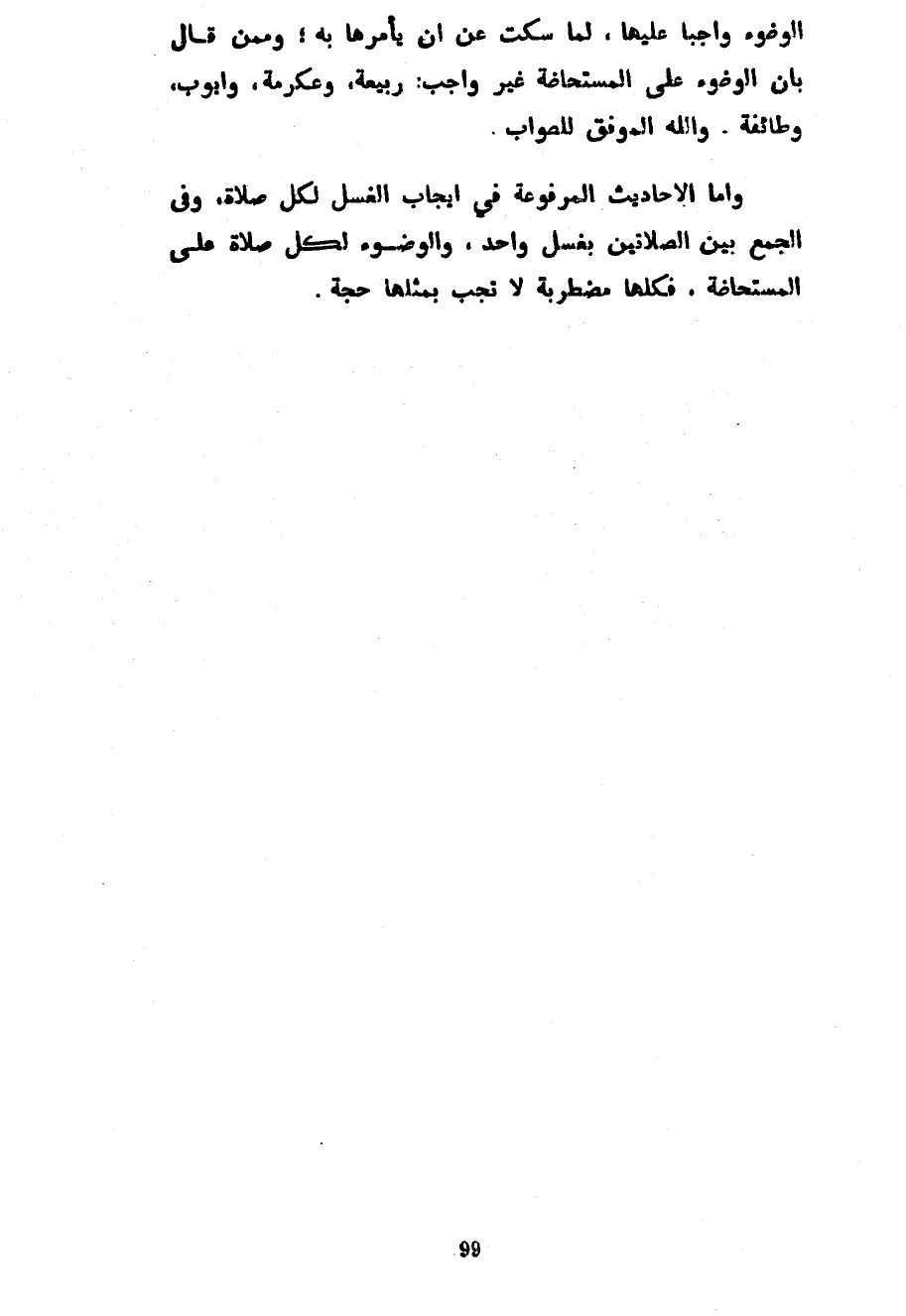 الْوُضُوءُ وَاجِبًا عَلَيْهَا لَمَا سَكَتَ عَنْ أَنْ يَأْمُرَهَا بِهِ وَمِمَّنْ قَالَ بِأَنَّ الْوُضُوءَ عَلَى المستحاضة غير وَاجِبٌ رَبِيعَةُ وَعِكْرِمَةُ وَأَيُّوبُ وَطَائِفَةٌ وَاللَّهُ الْمُوَفِّقُ لِلصَّوَابِ وَأَمَّا الْأَحَادِيثُ الْمَرْفُوعَةُ فِي إِيجَابِ الْغُسْلِ لِكُلِّ صَلَاةٍ وَفِي الْجَمْعِ بَيْنَ الصَّلَاتَيْنِ بِغُسْلٍ وَاحِدٍ وَالْوُضُوءِ لِكُلِّ صَلَاةٍ عَلَى الْمُسْتَحَاضَةِ فَكُلُّهَا مضطربة لا تجب بمثلها حجة