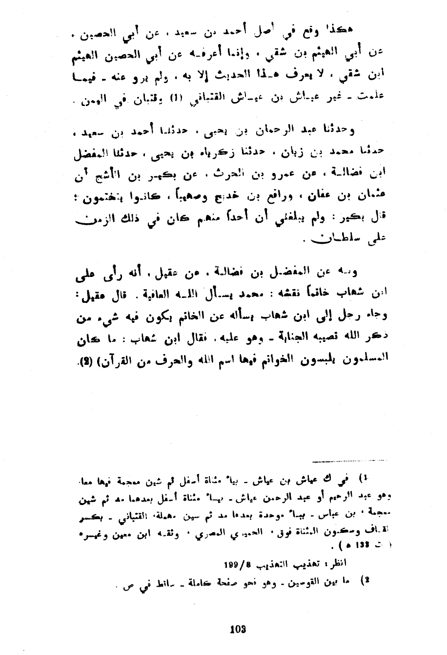 هَكَذَا وَقَعَ فِي أَصْلِ أَحْمَدَ بْنِ سَعِيدٍ عَنْ أَبِي الْحُصَيْنِ عَنْ أَبِي الْهَيْثَمِ بْنِ شُقَيٍّ وَإِنَّمَا أَعْرِفُهُ عَنْ أَبِي الْحُصَيْنِ الْهَيْثَمِ بْنِ شُقَيٍّ لَا يُعْرَفُ هَذَا الْحَدِيثُ إِلَّا بِهِ وَلَمْ يَرْوِ عَنْهُ فِيمَا عَلِمْتُ غَيْرُ عَيَّاشِ بْنِ عَيَّاشٍ الْقِتْبَانِيِّ وَقِتْبَانُ فِي الْيَمَنِ وحدثنا عبد الرحمان بْنُ يَحْيَى حَدَّثَنَا أَحْمَدُ بْنُ سَعِيدٍ حَدَّثَنَا محمد بن زيان حَدَّثَنَا زَكَرِيَّاءُ بْنُ يَحْيَى حَدَّثَنَا الْمُفَضَّلُ بْنُ فضالة عن عمرو بن الحرث عَنْ بُكَيْرِ بْنِ الْأَشَجِّ أَنَّ عُثْمَانَ بْنَ عَفَّانَ وَرَافِعَ بْنَ خَدِيجٍ وَصُهَيْبًا كَانُوا يَتَخَتَّمُونَ قَالَ بُكَيْرٌ وَلَمْ يَبْلُغْنِي أَنَّ أَحَدًا مِنْهُمْ كَانَ فِي ذَلِكَ الزَّمَنِ عَلَى سُلْطَانٍ وَبِهِ عَنِ الْمُفَضَّلِ بْنِ فَضَالَةَ عَنْ عُقَيْلٍ أَنَّهُ رَأَى عَلَى ابْنِ شِهَابٍ خَاتَمًا نَقْشُهُ مُحَمَّدٌ يَسْأَلُ اللَّهَ الْعَافِيَةَ قَالَ عُقَيْلٌ وَجَاءَ رَجُلٌ إِلَى ابْنِ شِهَابٍ يَسْأَلُهُ عَنِ الْخَاتَمِ يَكُونُ فِيهِ شَيْءٌ مِنْ ذِكْرِ اللَّهِ تُصِيبُهُ الْجَنَابَةُ وَهُوَ عَلَيْهِ فَقَالَ ابْنُ شِهَابٍ مَا كَانَ الْمُسْلِمُونَ يَلْبَسُونَ الْخَوَاتِمَ فِيهَا اسْمُ اللَّهِ وَالْحَرْفُ من القرآن)