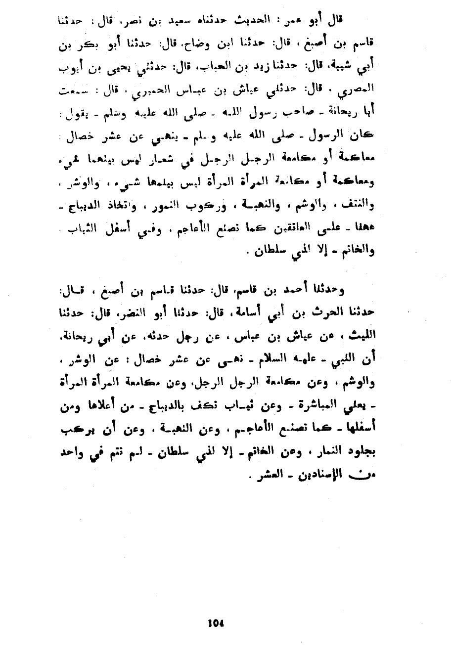 قَالَ أَبُو عُمَرَ الْحَدِيثُ حَدَّثَنَاهُ سَعِيدُ بْنُ نَصْرٍ قَالَ حَدَّثَنَا قَاسِمُ بْنُ أَصْبَغَ قَالَ حَدَّثَنَا ابْنُ وَضَّاحٍ قَالَ حَدَّثَنَا أَبُو بَكْرِ بْنُ أَبِي شَيْبَةَ قَالَ حَدَّثَنَا زَيْدُ بْنُ الْحُبَابِ قَالَ حَدَّثَنِي يَحْيَى بْنُ أَيُّوبَ الْمِصْرِيُّ قَالَ حَدَّثَنِي عَيَّاشُ بْنُ عَبَّاسٍ الْحِمْيَرِيُّ قَالَ سَمِعْتُ أَبَا رَيْحَانَةَ صَاحِبِ رَسُولِ اللَّهِ صَلَّى اللَّهُ عَلَيْهِ وَسَلَّمَ يَقُولُ كَانَ الرَّسُولُ صَلَّى الله عليه وسلم ينهى عن شعر خِصَالٍ مُعَاكَمَةِ أَوْ مُكَامَعَةِ الرَّجُلِ الرَّجُلَ فِي شِعَارٍ لَيْسَ بَيْنَهُمَا شَيْءٌ وَمُعَاكَمَةِ أَوْ مُكَامَعَةِ الْمَرْأَةِ الْمَرْأَةَ لَيْسَ بَيْنَهُمَا شَيْءٌ وَالْوَشْرِ وَالنَّتْفِ والوشم والنهبة وركوب النمور واتخاذ الديباج ههنا عَلَى الْعَاتِقِينَ كَمَا تَصْنَعُ الْأَعَاجِمُ وَفِي أَسْفَلِ الثِّيَابِ وَالْخَاتَمِ إِلَّا لِذِي سُلْطَانٍ وَحَدَّثَنَا أَحْمَدُ بْنُ قَاسِمٍ قَالَ حَدَّثَنَا قَاسِمُ بْنُ أَصْبَغَ قَالَ حَدَّثَنَا الْحَرْثُ بْنُ أَبِي أُسَامَةَ قَالَ حَدَّثَنَا أَبُو النَّضْرِ قَالَ حَدَّثَنَا اللَّيْثُ عَنْ عَيَّاشِ بْنِ عَبَّاسٍ عَنْ رَجُلٍ حَدَّثَهُ عَنْ أَبِي رَيْحَانَةَ أَنَّ النَّبِيَّ عَلَيْهِ السَّلَامُ نَهَى عَنْ عَشْرِ خِصَالٍ عَنِ الْوَشْرِ وَالْوَشْمِ وَعَنْ مُكَامَعَةِ الرَّجُلِ الرَّجُلَ وَعَنْ مُكَامَعَةِ الْمَرْأَةِ الْمَرْأَةَ يَعْنِي الْمُبَاشَرَةَ وَعَنْ ثِيَابٍ تُكَفُّ بِالدِّيبَاجِ مِنْ أَعْلَاهَا وَمِنْ أَسْفَلِهَا كَمَا تَصْنَعُ الْأَعَاجِمُ وَعَنِ النُّهْبَةِ وَعَنْ أَنْ يُرْكَبَ بِجُلُودِ النِّمَارِ وَعَنِ الْخَاتَمِ إِلَّا لِذِي سُلْطَانٍ لَمْ تَتِمَّ فِي وَاحِدٍ مِنَ الِإِسْنَادَيْنِ الْعَشْرُ