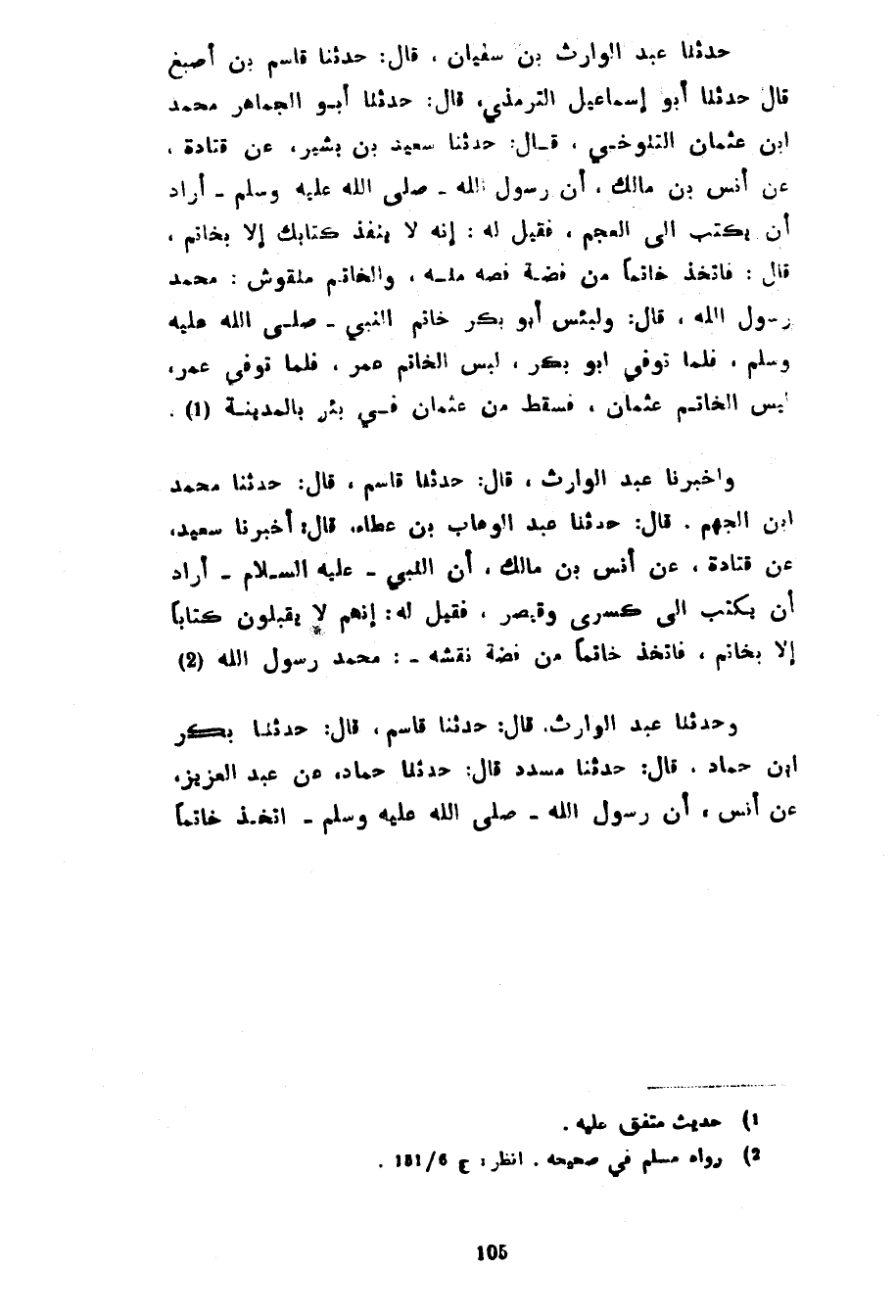 حَدَّثَنَا عَبْدُ الْوَارِثِ بْنُ سُفْيَانَ قَالَ حَدَّثَنَا قَاسِمُ بْنُ أَصْبَغَ قَالَ حَدَّثَنَا أَبُو إِسْمَاعِيلَ التِّرْمِذِيُّ قَالَ حَدَّثَنَا أَبُو الْجُمَاهِرِ مُحَمَّدُ بْنُ عُثْمَانَ التَّنُوخِيُّ قَالَ حَدَّثَنَا سَعِيدُ بْنُ بَشِيرٍ عَنْ قَتَادَةَ عَنْ أَنَسِ بْنِ مَالِكٍ أَنَّ رَسُولَ اللَّهِ صَلَّى اللَّهُ عليه وسلم أَرَادَ أَنْ يَكْتُبَ إِلَى الْعَجَمِ فَقِيلَ لَهُ إِنَّهُ لَا يَنْفُذُ كِتَابُكَ إِلَّا بِخَاتَمٍ قَالَ فَاتَّخَذَ خَاتَمًا مِنْ فِضَّةٍ فَصُّهُ مِنْهُ وَالْخَاتَمُ مَنْقُوشٌ مُحَمَّدٌ رَسُولُ اللَّهِ قَالَ وَلَبِسَ أَبُو بَكْرٍ خَاتَمَ النَّبِيِّ صَلَّى اللَّهُ عَلَيْهِ وَسَلَّمَ فَلَمَّا تُوُفِّيَ أَبُو بَكْرٍ لَبِسَ الْخَاتَمَ عُمَرُ فَلَمَّا تُوُفِّيَ عُمَرُ لَبِسَ الْخَاتَمَ عُثْمَانُ فَسَقَطَ مِنْ عُثْمَانَ فِي بِئْرٍ بِالْمَدِينَةِ وَأَخْبَرَنَا عَبْدُ الْوَارِثِ قَالَ حَدَّثَنَا قَاسِمٌ قَالَ حَدَّثَنَا مُحَمَّدُ بْنُ الْجَهْمِ قَالَ حَدَّثَنَا عَبْدُ الْوَهَّابِ بْنُ عَطَاءٍ قَالَ أَخْبَرَنَا سَعِيدٍ عَنْ قَتَادَةَ عَنْ أَنَسِ بْنِ مَالِكٍ أَنَّ النَّبِيَّ عَلَيْهِ السَّلَامُ أَرَادَ أَنْ يَكْتُبَ إِلَى كِسْرَى وَقَيْصَرَ فَقِيلَ لَهُ إِنَّهُمْ لَا يَقْبَلُونَ كِتَابًا إِلَّا بِخَاتَمٍ فَاتَّخَذَ خَاتَمًا مِنْ فِضَّةٍ نَقْشُهُ مُحَمَّدٌ رَسُولُ اللَّهِ وَحَدَّثَنَا عَبْدُ الْوَارِثِ قَالَ حَدَّثَنَا قَاسِمٌ قَالَ حدثا بَكْرُ بْنُ حَمَّادٍ قَالَ حَدَّثَنَا مُسَدَّدٌ قَالَ حَدَّثَنَا حَمَّادٌ عَنْ عَبْدِ الْعَزِيزِ عَنْ أَنَسٍ أَنَّ رَسُولَ اللَّهِ صَلَّى اللَّهُ عليه وسلم اتخذ خاتما