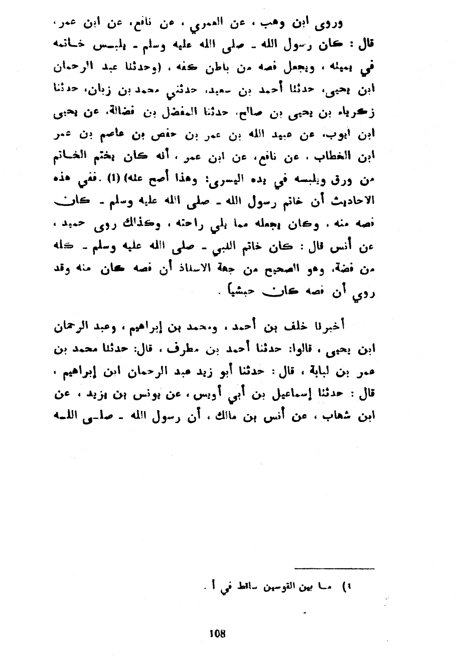 وَرَوَى ابْنُ وَهْبٍ عَنِ الْعُمَرِيِّ عَنْ نَافِعٍ عَنِ ابْنِ عُمَرَ قَالَ كَانَ رَسُولُ اللَّهِ صَلَّى اللَّهُ عَلَيْهِ وَسَلَّمَ يَلْبَسُ خَاتَمًا فِي يَمِينِهِ وَيَجْعَلُ فَصَّهُ مِنْ بَاطِنِ كَفِّهِ (وَحَدَّثَنَا عبد الرحمان بْنُ يَحْيَى حَدَّثَنَا أَحْمَدُ بْنُ سَعِيدٍ حَدَّثَنِي مُحَمَّدُ بْنُ زَبَّانَ حَدَّثَنَا زَكَرِيَّاءُ بْنُ يَحْيَى بْنِ صَالِحٍ حَدَّثَنَا الْمُفَضَّلُ بْنُ فَضَالَةَ عَنْ يَحْيَى بْنِ أَيُّوبَ عَنْ عُبَيْدُ اللَّهِ بْنُ عُمَرَ بْنِ حَفْصِ بْنِ عَاصِمِ بْنِ عُمَرَ بْنِ الْخَطَّابِ عَنْ نَافِعٍ عَنِ ابْنِ عُمَرَ أَنَّهُ كَانَ يَخْتِمُ الْخَاتَمَ مِنْ وَرِقٍ وَيَلْبَسُهُ فِي يَدِهِ الْيُسْرَى وَهَذَا أَصَحُّ عَنْهُ) فَفِي هَذِهِ الْأَحَادِيثِ أَنَّ خَاتَمَ رَسُولِ اللَّهِ صَلَّى اللَّهُ عَلَيْهِ وَسَلَّمَ كَانَ فَصُّهُ مِنْهُ وَكَانَ يَجْعَلُهُ مِمَّا يَلِي رَاحَتَهُ وَكَذَلِكَ رَوَى حُمَيْدٌ عَنْ أَنَسٍ قَالَ كَانَ خَاتَمُ النَّبِيِّ صَلَّى اللَّهُ عَلَيْهِ وَسَلَّمَ كُلُّهُ مِنْ فِضَّةٍ وَهُوَ الصَّحِيحُ مِنْ جِهَةِ الْإِسْنَادِ أَنَّ فَصَّهُ كَانَ مِنْهُ وَقَدْ رُوِيَ أَنَّ فَصَّهُ كَانَ حَبَشِيًّا أَخْبَرَنَا خَلَفُ بْنُ أَحْمَدَ وَمُحَمَّدُ بْنُ إِبْرَاهِيمَ وعبد الرحمان بْنُ يَحْيَى قَالُوا حَدَّثَنَا أَحْمَدُ بْنُ مُطَرِّفٍ قَالَ حَدَّثَنَا مُحَمَّدُ بْنُ عُمَرَ بْنِ لُبَابَةَ قال حدثنا أبو زيد عبد الرحمان بْنُ إِبْرَاهِيمَ قَالَ حَدَّثَنَا إِسْمَاعِيلُ بْنُ أَبِي أُوَيْسٍ عَنْ يُونُسَ بْنِ يَزِيدَ عَنِ ابْنِ شِهَابٍ عَنْ أَنَسِ بْنِ مَالِكٍ أَنَّ رَسُولَ اللَّهِ صَلَّى اللَّهُ عَلَيْهِ وَسَلَّمَ