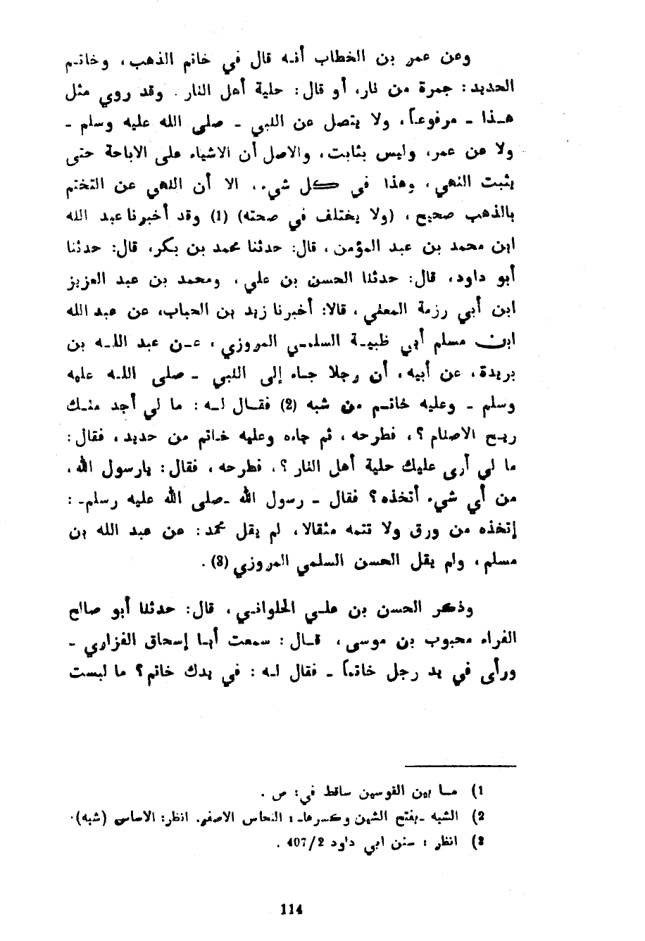 وَعَنْ عُمَرَ بْنِ الْخَطَّابِ أَنَّهُ قَالَ فِي خَاتَمِ الذَّهَبِ وَخَاتَمِ الْحَدِيدِ جَمْرَةٌ مِنْ نَارٍ أَوْ قَالَ حِلْيَةُ أَهْلِ النَّارِ وَقَدْ رُوِيَ مِثْلُ هَذَا مَرْفُوعًا وَلَا يَتَّصِلُ عَنِ النَّبِيِّ صَلَّى اللَّهُ عَلَيْهِ وَسَلَّمَ وَلَا عَنْ عُمَرَ وَلَيْسَ بِثَابِتٍ وَالْأَصْلُ أَنَّ الْأَشْيَاءَ عَلَى الْإِبَاحَةِ حَتَّى يَثْبُتَ النَّهْيُ وَهَذَا فِي كُلِّ شَيْءٍ إِلَّا أَنَّ النَّهْيَ عَنِ التَّخَتُّمِ بِالذَّهَبِ صَحِيحٌ (وَلَا يُخْتَلَفُ فِي صِحَّتِهِ) وَقَدْ أَخْبَرَنَا عَبْدُ اللَّهِ بْنُ مُحَمَّدِ بْنِ عَبْدِ الْمُؤْمِنِ قَالَ حَدَّثَنَا مُحَمَّدُ بْنُ بَكْرٍ قَالَ حَدَّثَنَا أَبُو دَاوُدَ قَالَ حَدَّثَنَا الْحَسَنُ بْنُ عَلِيٍّ وَمُحَمَّدُ بْنُ عَبْدِ الْعَزِيزِ بْنِ أَبِي رِزْمَةَ الْمَعْنَى قَالَا أَخْبَرَنَا زَيْدُ بْنُ الْحُبَابِ عَنْ عَبْدِ اللَّهِ بْنِ مُسْلِمٍ أَبِي ظَبْيَةَ السُّلَمِيِّ الْمَرْوَزِيِّ عَنْ عَبْدِ اللَّهِ بْنِ بُرَيْدَةَ عَنْ أَبِيهِ أَنَّ رجلا جَاءَ إِلَى النَّبِيِّ صَلَّى اللَّهُ عَلَيْهِ وَسَلَّمَ وَعَلَيْهِ خَاتَمٌ مِنْ شَبَهٍ فَقَالَ لَهُ مَا لِي أَجِدُ مِنْكَ رِيحَ الْأَصْنَامِ فَطَرَحَهُ ثُمَّ جَاءَهُ وَعَلَيْهِ خَاتَمٌ مِنْ حَدِيدٍ فَقَالَ مَا لِي أَرَى عَلَيْكَ حِلْيَةَ أَهْلِ النَّارِ فَطَرَحَهُ فَقَالَ يَا رَسُولَ اللَّهِ مِنْ أَيِّ شَيْءٍ أَتَّخِذُهُ فَقَالَ رَسُولُ اللَّهِ صَلَّى اللَّهُ عَلَيْهِ وَسَلَّمَ اتَّخِذْهُ مِنْ وَرِقٍ وَلَا تُتِمَّهُ مِثْقَالًا لَمْ يَقُلْ مُحَمَّدٌ عَنْ عَبْدِ اللَّهِ بْنِ مُسْلِمٍ وَلَمْ يَقُلِ الْحَسَنُ السُّلَمِيُّ الْمَرْوَزِيُّ وَذَكَرَ الْحَسَنُ بْنُ عَلِيٍّ الْحُلْوَانِيُّ قَالَ حَدَّثَنَا أَبُو صَالِحٍ الْفَرَّاءُ مَحْبُوبُ بْنُ مُوسَى قَالَ سَمِعْتُ أَبَا إِسْحَاقَ الْفَزَارِيَّ وَرَأَى فِي يَدِ رَجُلٍ خَاتَمًا فَقَالَ لَهُ فِي يَدِكَ خَاتَمٌ مَا لَبِسْتُ