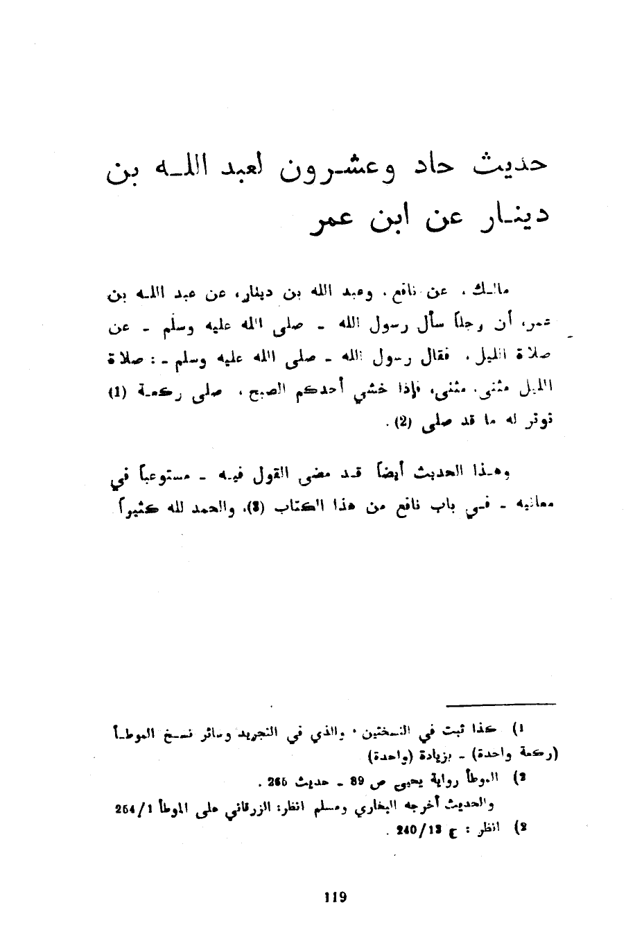 حَدِيثٌ حَادٍ وَعِشْرُونَ لِعَبْدِ اللَّهِ بْنِ دِينَارٍ عَنِ ابْنِ عُمَرَ مَالِكٌ عَنْ نَافِعٍ وَعَبْدِ اللَّهِ بْنِ دِينَارٍ عَنْ عَبْدِ اللَّهِ بْنِ عُمَرَ أَنَّ رَجُلًا سَأَلَ رَسُولَ اللَّهِ صَلَّى اللَّهُ عَلَيْهِ وَسَلَّمَ عَنْ صَلَاةِ اللَّيْلَ فَقَالَ رَسُولُ اللَّهِ صَلَّى اللَّهُ عَلَيْهِ وَسَلَّمَ صلاة اللَّيْلِ مَثْنَى مَثْنَى فَإِذَا خَشِيَ أَحَدُكُمُ الصُّبْحَ صَلَّى رَكْعَةً تُوتِرُ لَهُ مَا قَدْ صَلَّى وَهَذَا الْحَدِيثُ أَيْضًا قَدْ مَضَى الْقَوْلُ فِيهِ مُسْتَوْعَبًا فِي مَعَانِيهِ فِي بَابِ نَافِعٍ مِنْ هَذَا الْكِتَابِ وَالْحَمْدُ لِلَّهِ كَثِيرًا