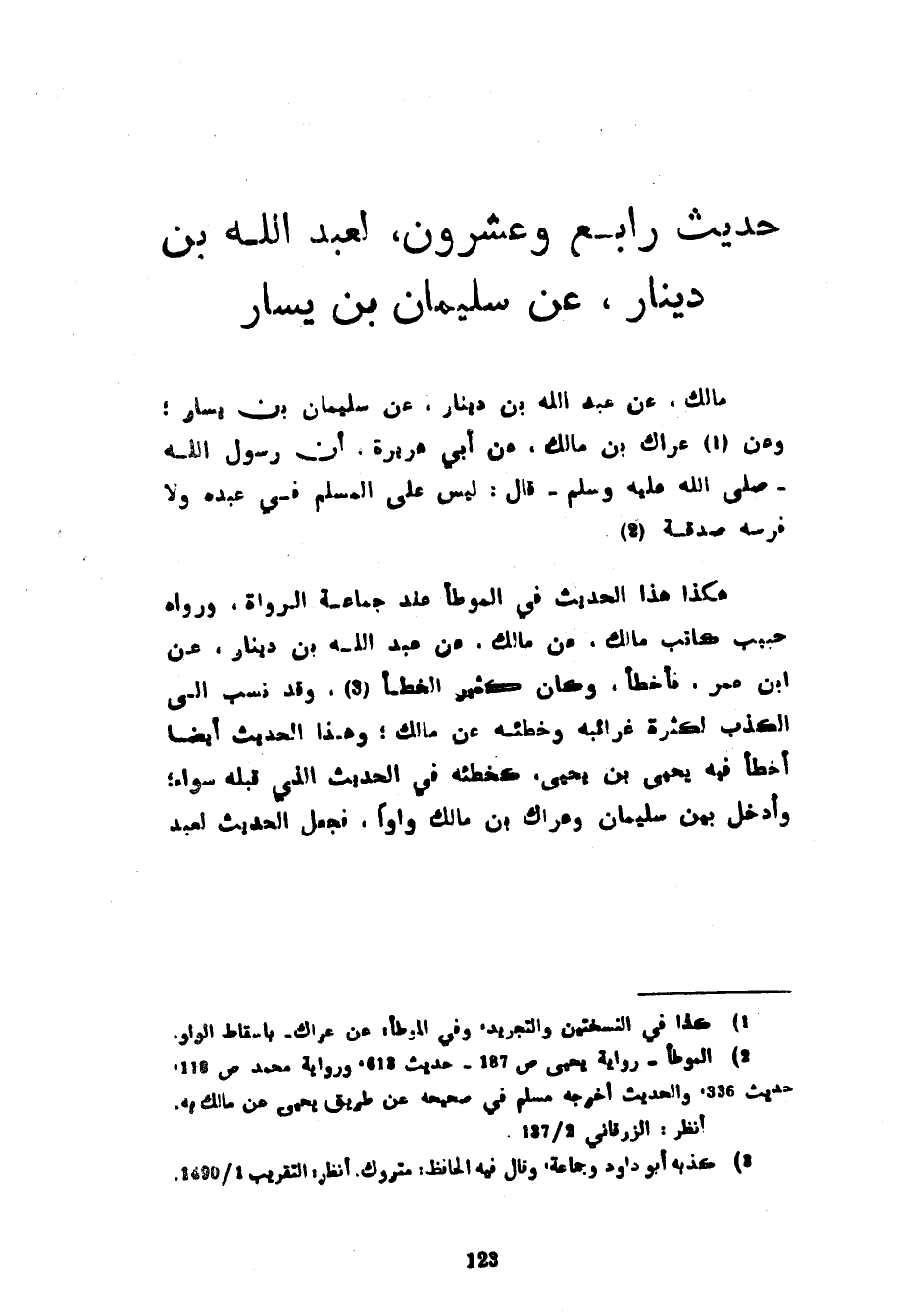 حَدِيثٌ رَابِعٌ وَعِشْرُونَ لِعَبْدِ اللَّهِ بْنِ دِينَارٍ عَنْ سُلَيْمَانَ بْنِ يَسَارٍ مَالِكٌ عَنْ عَبْدِ الله بن دينار عن سليمان بن يسار وَعَنْ عِرَاكِ بْنِ مَالِكٍ عَنْ أَبِي هُرَيْرَةَ أَنَّ رَسُولَ اللَّهِ صَلَّى الله عليه وسلم قَالَ لَيْسَ عَلَى الْمُسْلِمِ فِي عَبْدِهِ وَلَا فَرَسِهِ صَدَقَةٌ هَكَذَا هَذَا الْحَدِيثُ فِي الْمُوَطَّأِ عِنْدَ جَمَاعَةِ الرُّوَاةِ وَرَوَاهُ حَبِيبٌ كَاتِبُ مَالِكٍ عَنْ مَالِكٍ عَنْ عَبْدِ اللَّهِ بْنِ دِينَارٍ عَنِ ابْنِ عُمَرَ فَأَخْطَأَ وَكَانَ كَثِيرَ الْخَطَأِ وَقَدْ نُسِبَ إِلَى الْكَذِبِ لِكَثْرَةِ غَرَائِبِهِ وَخَطَئِهِ عَنْ مَالِكٍ وَهَذَا الْحَدِيثُ أَيْضًا أَخْطَأَ فِيهِ يَحْيَى بْنُ يَحْيَى كَخَطَئِهِ فِي الْحَدِيثِ الَّذِي قَبْلَهُ سَوَاءً وَأَدْخَلَ بَيْنَ سُلَيْمَانَ وَعِرَاكِ بْنِ مَالِكٍ وَاوًا فَجَعَلَ الْحَدِيثَ لِعَبْدِ