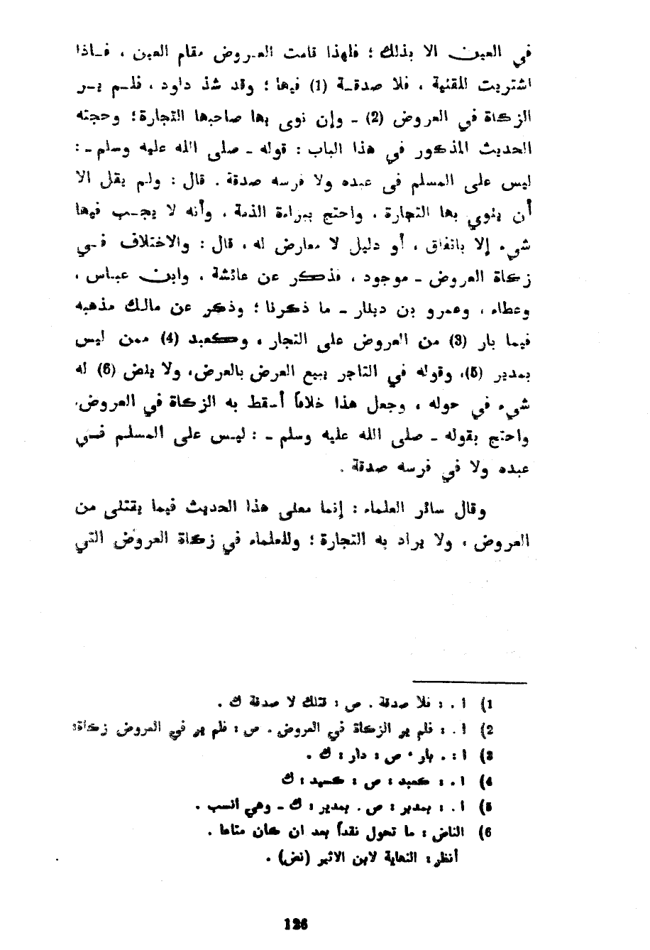فِي الْعَيْنِ إِلَّا بِذَلِكَ فَلِهَذَا قَامَتِ الْعُرُوضُ مَقَامَ الْعَيْنِ فَإِذَا اشْتُرِيَتْ لِلْقِنْيَةِ فَلَا صَدَقَةَ فِيهَا وَقَدْ شَذَّ دَاوُدُ فَلَمْ يَرَ الزَّكَاةَ فِي الْعُرُوضِ وَإِنْ نَوَى بِهَا صَاحِبُهَا التِّجَارَةَ وَحُجَّتُهُ الْحَدِيثِ الْمَذْكُورِ فِي هَذَا الْبَابِ قَوْلُهُ صَلَّى اللَّهُ عَلَيْهِ وَسَلَّمَ لَيْسَ عَلَى الْمُسْلِمِ فِي عَبْدِهِ وَلَا فَرَسِهِ صَدَقَةٌ قَالَ وَلَمْ يَقُلْ إِلَّا أَنْ يَنْوِيَ بِهَا التِّجَارَةَ وَاحْتَجَّ بِبَرَاءَةِ الذِّمَّةِ وَأَنَّهُ لَا يَجِبُ فِيهَا شَيْءٌ إِلَّا بِاتِّفَاقٍ أَوْ دَلِيلٍ لَا مَعَارِضَ لَهُ قَالَ وَالِاخْتِلَافُ فِي زَكَاةِ الْعُرُوضِ مَوْجُودٌ فَذَكَرَ عَنْ عَائِشَةَ وَابْنِ عَبَّاسٍ وَعَطَاءٍ وَعَمْرِو بْنِ دِينَارٍ مَا ذَكَرْنَا وَذَكَرَ عَنْ مَالِكٍ مَذْهَبَهُ فِيمَا بَارَ مِنَ الْعُرُوضِ عَلَى التُّجَّارِ وَكَعَبْدٍ ممن ليس بمدير وَقَوْلُهُ فِي التَّاجِرِ يَبِيعُ الْعَرَضَ بِالْعَرَضِ وَلَا يَنِضُّ لَهُ شَيْءٌ فِي حَوْلِهِ وَجَعَلَ هَذَا خِلَافًا أَسْقَطَ بِهِ الزَّكَاةَ فِي الْعُرُوضِ وَاحْتَجَّ بِقَوْلِهِ صَلَّى اللَّهُ عَلَيْهِ وَسَلَّمَ لَيْسَ عَلَى الْمُسْلِمِ فِي عَبْدِهِ وَلَا فِي فَرَسِهِ صَدَقَةٌ وَقَالَ سَائِرُ الْعُلَمَاءِ إِنَّمَا مَعْنَى هَذَا الْحَدِيثِ فِيمَا يُقْتَنَى مِنَ الْعُرُوضِ وَلَا يُرَادُ بِهِ التِّجَارَةُ وَلِلْعُلَمَاءِ فِي زَكَاةِ الْعُرُوضِ الَّتِي