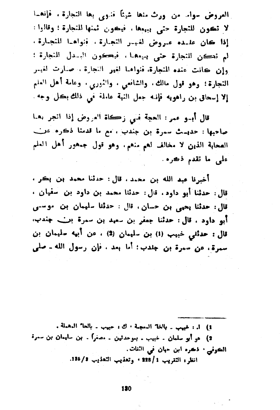 الْعُرُوضِ سَوَاءٌ مَنْ وَرِثَ مِنْهَا شَيْئًا فَنَوَى بِهَا التِّجَارَةَ فَإِنَّهَا لَا تَكُونُ لِلتِّجَارَةِ حَتَّى يَبِيعَهَا فَيَكُونَ ثَمَنُهَا لِلتِّجَارَةِ وَقَالُوا إِذَا كَانَ عِنْدَهُ عُرُوضٌ لِغَيْرِ التِّجَارَةِ فَنَوَاهَا لِلتِّجَارَةِ لَمْ تَكُنْ لِلتِّجَارَةِ حَتَّى يَبِيعَهَا فَيَكُونَ الْبَدَلُ لِلتِّجَارَةِ وَإِنْ كَانَتْ عِنْدَهُ لِلتِّجَارَةِ فَنَوَاهَا لِغَيْرِ التِّجَارَةِ صَارَتْ لِغَيْرِ التِّجَارَةِ وَهُوَ قَوْلُ مَالِكٍ وَالشَّافِعِيِّ والثوري وعامة أهل العلم إلا إسحاق بن رَاهَوَيْهِ فَإِنَّهُ جَعَلَ النِّيَّةَ عَامِلَةً فِي ذَلِكَ بِكُلِّ وَجْهٍ قَالَ أَبُو عُمَرَ الْحُجَّةُ فِي زَكَاةِ الْعُرُوضِ إِذَا اتَّجَرَ بِهَا صَاحَبُهَا حَدِيثُ سَمُرَةَ بْنِ جُنْدُبٍ مَعَ مَا قَدَّمْنَا ذِكْرَهُ عَنِ الصَّحَابَةِ الَّذِينَ لَا مُخَالِفَ لَهُمْ مِنْهُمْ وَهُوَ قَوْلُ جُمْهُورِ أَهْلِ الْعِلْمِ عَلَى مَا تَقَدَّمَ ذِكْرُهُ أَخْبَرَنَا عَبْدُ اللَّهِ بْنُ مُحَمَّدٍ قَالَ حَدَّثَنَا مُحَمَّدُ بْنُ بَكْرٍ قَالَ حَدَّثَنَا أَبُو دَاوُدَ قَالَ حَدَّثَنَا مُحَمَّدُ بْنُ دَاوُدَ بْنِ سُفْيَانَ قَالَ حَدَّثَنَا يَحْيَى بْنُ حَسَّانَ قَالَ حَدَّثَنَا سُلَيْمَانُ بْنُ مُوسَى أَبُو دَاوُدَ قَالَ حَدَّثَنَا جَعْفَرُ بْنُ سَعِيدِ بْنِ سَمُرَةَ بْنِ جُنْدُبٍ قَالَ حَدَّثَنِي خُبَيْبُ بْنُ سُلَيْمَانَ عَنْ أَبِيهِ سُلَيْمَانَ بْنِ سَمُرَةَ عَنْ سَمُرَةَ بْنِ جُنْدُبٍ أَمَّا بَعْدُ فَإِنَّ رَسُولَ اللَّهِ صَلَّى اللَّهُ عَلَيْهِ وَسَلَّمَ