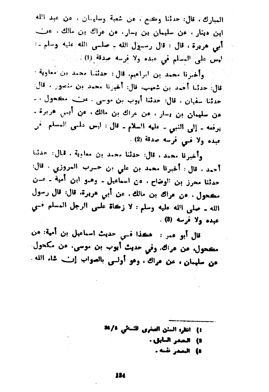 الْمُبَارَكِ قَالَ حَدَّثَنَا وَكِيعٌ عَنْ شُعْبَةَ وَسُلَيْمَانَ عَنْ عَبْدِ اللَّهِ بْنِ دِينَارٍ عَنْ سُلَيْمَانَ بْنِ يَسَارٍ عَنْ عِرَاكِ بْنِ مَالِكٍ عَنْ أَبِي هُرَيْرَةَ قَالَ قَالَ رَسُولُ اللَّهِ صَلَّى اللَّهُ عَلَيْهِ وَسَلَّمَ لَيْسَ عَلَى الْمُسْلِمِ فِي عَبْدِهِ وَلَا فَرَسِهِ صَدَقَةٌ وَأَخْبَرَنَا مُحَمَّدُ بْنُ إِبْرَاهِيمَ قَالَ حَدَّثَنَا مُحَمَّدُ بْنُ مُعَاوِيَةَ قَالَ حَدَّثَنَا أَحْمَدُ بْنُ شُعَيْبٍ قَالَ أَخْبَرَنَا مُحَمَّدُ بْنُ مَنْصُورٍ قَالَ حَدَّثَنَا سُفْيَانُ قَالَ حَدَّثَنَا أيوب بن موسى عن مكحول عن سليمان بْنِ يَسَارٍ عَنْ عِرَاكِ بْنِ مَالِكٍ عَنْ أَبِي هُرَيْرَةَ يَرْفَعُهُ إِلَى النَّبِيِّ عَلَيْهِ السَّلَامُ قَالَ لَيْسَ عَلَى الْمُسْلِمِ فِي عَبْدِهِ وَلَا فِي فَرَسِهِ صَدَقَةٌ وَأَخْبَرَنَا مُحَمَّدٍ قَالَ حَدَّثَنَا مُحَمَّدُ بْنُ مُعَاوِيَةَ قَالَ حَدَّثَنَا أَحْمَدُ قَالَ أَخْبَرَنَا مُحَمَّدُ بْنُ عَلِيِّ بْنِ حَرْبٍ الْمَرْوَزِيُّ قَالَ حَدَّثَنَا مُحْرِزُ بْنُ الْوَضَّاحِ عَنْ إِسْمَاعِيلَ وَهُوَ ابْنُ أُمَيَّةَ عَنْ مَكْحُولٍ عَنْ عِرَاكِ بْنِ مَالِكٍ عَنْ أَبِي هُرَيْرَةَ قَالَ قَالَ رَسُولُ اللَّهِ صلى الله عليه وسلم لا زَكَاةَ عَلَى الرَّجُلِ الْمُسْلِمِ فِي عَبْدِهِ وَلَا فَرَسِهِ قَالَ أَبُو عُمَرَ هَكَذَا فِي حَدِيثِ إِسْمَاعِيلَ بْنِ أُمَيَّةَ عَنْ مَكْحُولٍ عَنْ عِرَاكٍ وَفِي حَدِيثِ أَيُّوبَ بْنِ مُوسَى عَنْ مَكْحُولٍ عَنْ سُلَيْمَانَ عَنْ عِرَاكٍ وَهُوَ أَوْلَى بِالصَّوَابِ إِنْ شَاءَ اللَّهُ