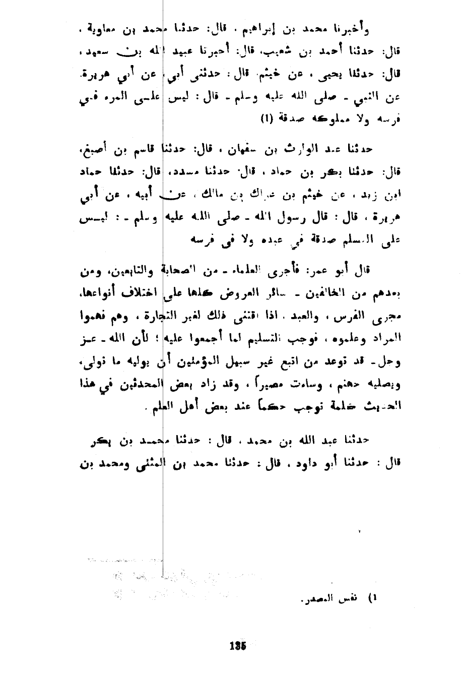 وَأَخْبَرَنَا مُحَمَّدُ بْنُ إِبْرَاهِيمَ قَالَ حَدَّثَنَا مُحَمَّدُ بْنُ مُعَاوِيَةَ قَالَ حَدَّثَنَا أَحْمَدُ بْنُ شُعَيْبٍ قَالَ أَخْبَرَنَا مُحَمَّدُ بْنُ عُبَيْدُ اللَّهِ بْنُ سَعِيدٍ قَالَ حَدَّثَنَا يَحْيَى عَنْ خَيْثَمٍ قَالَ حَدَّثَنِي أَبِي عَنْ أَبِي هُرَيْرَةَ عَنِ النَّبِيِّ صَلَّى اللَّهُ عَلَيْهِ وَسَلَّمَ قَالَ لَيْسَ عَلَى الْمَرْءِ فِي فَرَسِهِ وَلَا مَمْلُوكِهِ صَدَقَةَ حَدَّثَنَا عَبْدُ الْوَارِثِ بْنُ سُفْيَانَ قَالَ حَدَّثَنَا قَاسِمُ بْنُ أَصْبَغَ قَالَ حَدَّثَنَا بَكْرُ بْنُ حَمَّادٍ قَالَ حَدَّثَنَا مُسَدَّدٌ قَالَ حَدَّثَنَا حَمَّادُ بْنُ زَيْدٍ عَنْ خَيْثَمِ بْنِ عِرَاكِ بْنِ مَالِكٍ عَنْ أَبِيهِ عَنْ أَبِي هُرَيْرَةَ قَالَ قَالَ رَسُولُ اللَّهِ صَلَّى اللَّهُ عَلَيْهِ وَسَلَّمَ لَيْسَ عَلَى الْمُسْلِمِ صَدَقَةٌ فِي عَبْدِهِ وَلَا فِي فَرَسِهِ قَالَ أَبُو عُمَرَ فَأَجْرَى الْعُلَمَاءِ مِنَ الصَّحَابَةِ وَالتَّابِعِينَ وَمَنْ بَعْدَهُمْ مِنَ الْخَالِفِينَ سَائِرَ الْعُرُوضِ كُلِّهَا عَلَى اخْتِلَافِ أَنْوَاعِهَا مَجْرَى الْفَرَسِ وَالْعَبْدِ إِذَا اقْتَنَى ذَلِكَ لِغَيْرِ التِّجَارَةِ وَهُمْ فَهِمُوا الْمُرَادَ وَعَلِمُوهُ فَوَجَبَ التَّسْلِيمُ لِمَا أَجْمَعُوا عَلَيْهِ لِأَنَّ اللَّهَ عَزَّ وَجَلَّ قَدْ تَوَعَّدَ مَنِ اتَّبَعَ غَيْرَ سَبِيلِ الْمُؤْمِنِينَ أَنْ يُوَلِّيَهُ مَا تَوَلَّى وَيُصْلِيَهُ جَهَنَّمَ وَسَاءَتْ مَصِيرًا وَقَدْ زَادَ بَعْضُ الْمُحَدِّثِينَ فِي هَذَا الْحَدِيثِ كَلِمَةً تُوجِبُ حُكْمًا عِنْدَ بَعْضِ أَهْلِ الْعِلْمِ حَدَّثَنَا عَبْدُ اللَّهِ بْنُ مُحَمَّدٍ قَالَ حَدَّثَنَا مُحَمَّدُ بْنُ بَكْرٍ قَالَ حَدَّثَنَا أَبُو دَاوُدَ قَالَ حَدَّثَنَا مُحَمَّدُ بْنُ الْمُثَنَّى وَمُحَمَّدُ بْنُ