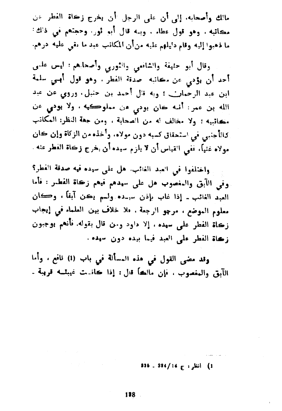 مَالِكٌ وَأَصْحَابُهُ إِلَى أَنَّ عَلَى الرَّجُلِ أَنْ يُخْرِجَ زَكَاةَ الْفِطْرِ عَنْ مَكَاتَبِهِ وَهُوَ قَوْلُ عَطَاءٍ وَبِهِ قَالَ أَبُو ثَوْرٍ وَحُجَّتُهُمْ فِي ذَلِكَ مَا ذَهَبُوا إِلَيْهِ وَقَامَ دَلِيلُهُمْ عَلَيْهِ مِنْ أَنَّ الْمَكَاتَبَ عَبْدٌ مَا بَقِيَ عَلَيْهِ دِرْهَمٌ وَقَالَ أَبُو حَنِيفَةَ وَالشَّافِعِيُّ وَالثَّوْرِيُّ وَأَصْحَابُهُمْ لَيْسَ عَلَى أَحَدٍ أَنْ يُؤَدِّيَ عَنْ مَكَاتَبِهِ صَدَقَةَ الْفِطْرِ وَهُوَ قَوْلُ أَبِي سَلَمَةَ بْنِ عبد الرحمان وَبِهِ قَالَ أَحْمَدُ بْنُ حَنْبَلٍ وَرُوِيَ عَنْ عَبْدِ اللَّهِ بْنِ عُمَرَ أَنَّهُ كَانَ يُؤَدِّي عَنْ مَمْلُوكِيهِ وَلَا يُؤَدِّي عَنْ مُكَاتَبِيهِ وَلَا مُخَالِفَ لَهُ مِنَ الصَّحَابَةِ وَمِنْ جِهَةِ النَّظَرِ الْمَكَاتَبُ كَالْأَجْنَبِيِّ فِي اسْتِحْقَاقِ كَسْبِهِ دُونَ مَوْلَاهُ وَأَخْذِهِ مِنَ الزَّكَاةِ وَإِنْ كَانَ مَوْلَاهُ غَنِيًّا فَفِي الْقِيَاسِ أَنْ لَا يَلْزَمَ سَيِّدَهُ أَنْ يُخْرِجَ زَكَاةَ الْفِطْرِ عَنْهُ وَاخْتَلَفُوا فِي الْعَبْدِ الْغَائِبِ هَلْ عَلَى سَيِّدِهِ فِيهِ صَدَقَةُ الْفِطْرِ وَفِي الْآبِقِ وَالْمَغْصُوبِ هَلْ عَلَى سَيِّدِهِمْ فِيهِمْ زَكَاةُ الْفِطْرِ فَأَمَّا الْعَبْدُ الْغَائِبُ إِذَا غَابَ بِإِذْنِ سَيِّدِهِ وَلَمْ يَكُنْ آبِقًا وَكَانَ مَعْلُومَ الْمَوْضِعِ مَرْجُوَّ الرَّجْعَةِ فَلَا خِلَافَ بَيْنِ الْعُلَمَاءِ فِي إِيجَابِ زَكَاةِ الْفِطْرِ عَلَى سَيِّدِهِ إِلَّا دَاوُدَ وَمَنْ قَالَ بِقَوْلِهِ فَإِنَّهُمْ يُوجِبُونَ زَكَاةَ الْفِطْرِ عَلَى الْعَبْدِ فِيمَا بِيَدِهِ دُونَ سَيِّدِهِ وَقَدْ مَضَى الْقَوْلُ فِي هَذِهِ الْمَسْأَلَةِ فِي بَابِ نَافِعٍ وَأَمَّا الْآبِقُ وَالْمَغْصُوبُ فَإِنَّ مَالِكًا قال إذا كان غيبته قريبة