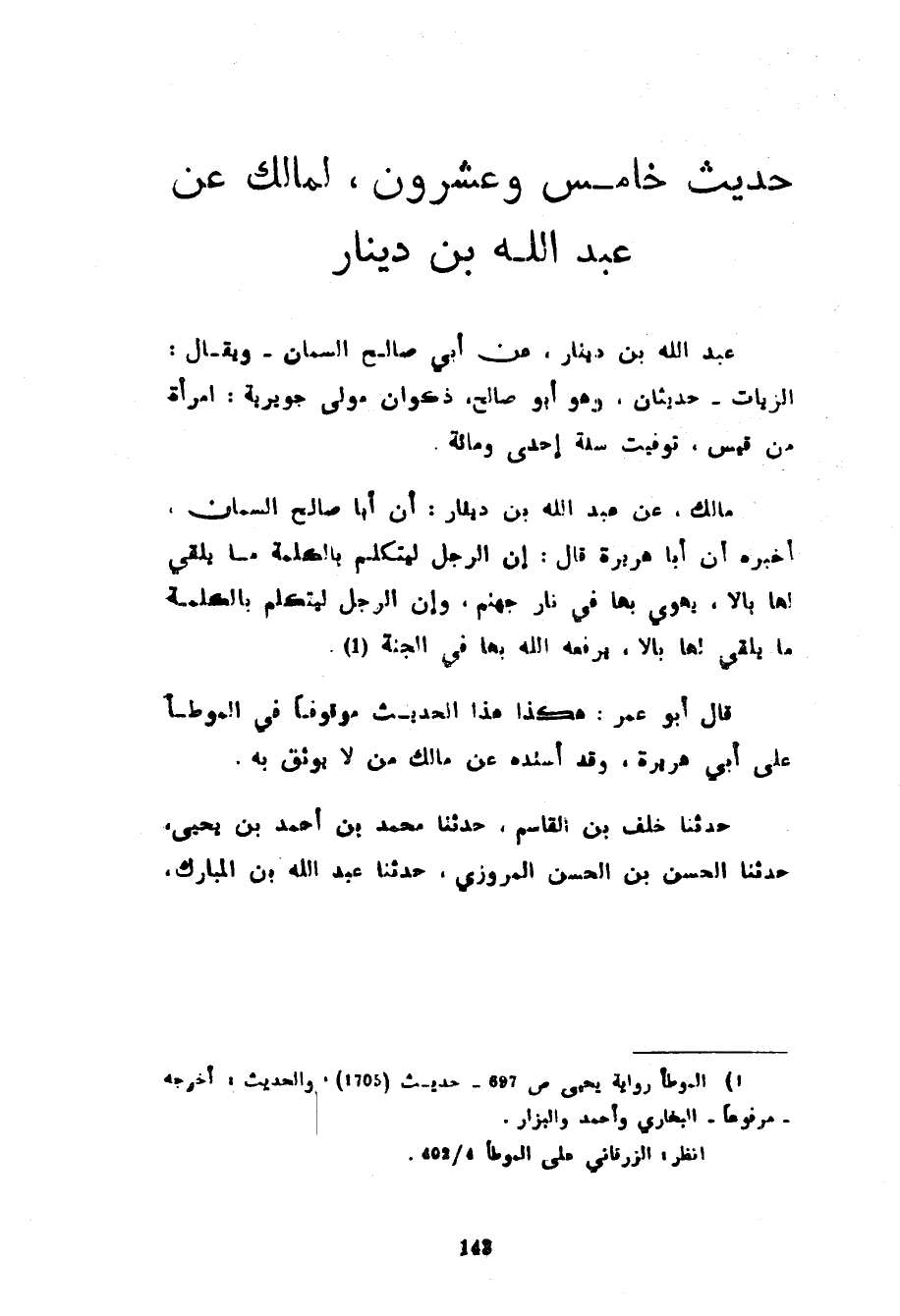 حَدِيثٌ خَامِسٌ وَعِشْرُونَ لِمَالِكٍ عَنْ عَبْدِ اللَّهِ بْنِ دِينَارٍ عَبْدِ اللَّهِ بْنِ دِينَارٍ عَنْ أَبِي صَالِحٍ السَّمَّانِ وَيُقَالُ الزَّيَّاتُ حَدِيثَانِ وَهُوَ أَبُو صَالِحٍ ذَكْوَانُ مَوْلَى جُوَيْرِيَةَ امْرَأَةٍ مِنْ قَيْسٍ تُوُفِّيَتْ سَنَةَ إِحْدَى وَمِائَةٍ مَالِكٌ عَنْ عَبْدِ اللَّهِ بْنِ دِينَارٍ أَنَّ أَبَا صَالِحٍ السَّمَّانَ أَخْبَرَهُ أَنَّ أَبَا هُرَيْرَةَ قَالَ إِنَّ الرَّجُلَ لَيَتَكَلَّمُ بِالْكَلِمَةِ مَا يُلْقِي لَهَا بَالًا يَهْوِي بِهَا فِي نَارِ جَهَنَّمَ وَإِنَّ الرَّجُلَ لَيَتَكَلَّمُ بِالْكَلِمَةِ مَا يُلْقِي لَهَا بَالًا يَرْفَعُهُ اللَّهُ بِهَا فِي الْجَنَّةِ قَالَ أَبُو عُمَرَ هَكَذَا هَذَا الْحَدِيثُ مَوْقُوفًا فِي الْمُوَطَّأِ عَلَى أَبِي هُرَيْرَةَ وَقَدْ أَسْنَدَهُ عَنْ مَالِكٌ مَنْ لَا يُوثَقُ بِهِ حَدَّثَنَا خَلَفُ بْنُ الْقَاسِمِ حَدَّثَنَا مُحَمَّدُ بْنُ أَحْمَدَ بْنِ يَحْيَى حَدَّثَنَا الْحَسَنُ بْنُ الْحَسَنِ الْمَرْوَزِيُّ حَدَّثَنَا عَبْدُ اللَّهِ بن المبارك