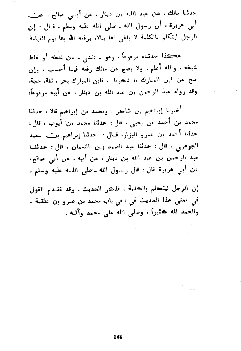 حَدَّثَنَا مَالِكٌ عَنْ عَبْدِ اللَّهِ بْنِ دِينَارٍ عَنْ أَبِي صَالِحٍ عَنْ أَبِي هُرَيْرَةَ أَنَّ رَسُولَ اللَّهِ صَلَّى اللَّهُ عَلَيْهِ وَسَلَّمَ قَالَ إِنَّ الرَّجُلَ لَيَتَكَلَّمُ بِالْكَلِمَةِ لَا يُلْقِي لَهَا بَالًا يَرْفَعُهُ اللَّهُ بِهَا يَوْمَ الْقِيَامَةِ هَكَذَا حَدَّثَنَاهُ مَرْفُوعًا وَهُوَ عِنْدِي مِنْ غَلَطِهِ أَوْ غَلَطِ شَيْخِهِ وَاللَّهُ أَعْلَمُ وَلَا يَصِحُّ عَنْ مَالِكٍ رَفْعُهُ فِيمَا أَحْسَبُ وَإِنْ صَحَّ عَنِ ابْنِ الْمُبَارَكِ مَا ذَكَرْنَا فَابْنُ الْمُبَارَكِ بَحْرٌ ثِقَةٌ حُجَّةٌ وَقَدْ رَوَاهُ عَبْدُ الرَّحْمَنِ بْنُ عَبْدِ اللَّهِ بْنِ دِينَارٍ عَنْ أَبِيهِ مَرْفُوعًا أَخْبَرَنَا إِبْرَاهِيمُ بْنُ شَاكِرٍ وَمُحَمَّدُ بْنُ إِبْرَاهِيمَ قَالَا حَدَّثَنَا مُحَمَّدُ بْنُ أَحْمَدَ بْنِ يَحْيَى قَالَ حَدَّثَنَا مُحَمَّدُ بْنُ أَيُّوبَ قَالَ حَدَّثَنَا أَحْمَدُ بْنُ عَمْرٍو الْبَزَّارُ قَالَ حَدَّثَنَا إِبْرَاهِيمُ بْنُ سَعِيدٍ الْجَوْهَرِيُّ قَالَ حَدَّثَنَا عَبْدُ الصَّمَدِ بْنُ النُّعْمَانِ قَالَ حَدَّثَنَا عَبْدُ الرَّحْمَنِ بْنُ عَبْدِ اللَّهِ بْنِ دِينَارٍ عَنْ أَبِيهِ عَنْ أَبِي صَالِحٍ عَنْ أَبِي هُرَيْرَةَ قَالَ قَالَ رَسُولُ اللَّهِ صَلَّى اللَّهُ عَلَيْهِ وَسَلَّمَ أن الرَّجُلَ لَيَتَكَلَّمُ بِالْكَلِمَةِ فَذَكَرَ الْحَدِيثَ وَقَدْ تَقَدَّمَ الْقَوْلُ فِي مَعْنَى هَذَا الْحَدِيثِ في فِي بَابِ مُحَمَّدِ بْنِ عَمْرِو بْنِ عَلْقَمَةَ وَالْحَمْدُ لِلَّهِ كَثِيرًا وَصَلَّى اللَّهُ عَلَى مُحَمَّدٍ وآله