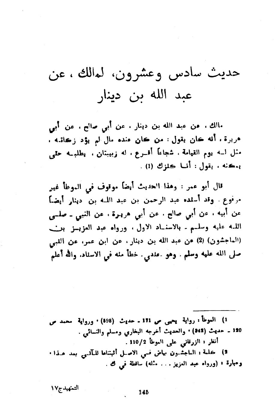 حَدِيثٌ سَادِسٌ وَعِشْرُونَ لِمَالِكٍ عَنْ عَبْدِ اللَّهِ بْنِ دِينَارٍ مَالِكٌ عَنْ عَبْدِ اللَّهِ بْنِ دِينَارٍ عَنْ أَبِي صَالِحٍ عَنْ أَبِي هُرَيْرَةَ أنه كان يقول من كان عنده مالم لَمْ يُؤَدِّ زَكَاتَهُ مُثِّلَ لَهُ يَوْمَ الْقِيَامَةِ شُجَاعًا أَقْرَعَ لَهُ زَبِيبَتَانِ يَطْلُبُهُ حَتَّى يُمْكِنَهُ يَقُولُ أَنَا كَنْزُكَ قَالَ أَبُو عُمَرَ وَهَذَا الْحَدِيثُ أَيْضًا مَوْقُوفٌ فِي الْمُوَطَّأِ غَيْرُ مَرْفُوعٍ وَقَدْ أَسْنَدَهُ عَبْدُ الرَّحْمَنِ بْنُ عَبْدِ اللَّهِ بْنِ دِينَارٍ أَيْضًا عَنْ أَبِيهِ عَنْ أَبِي صَالِحٍ عَنْ أَبِي هُرَيْرَةَ عَنِ النَّبِيِّ صَلَّى اللَّهُ عَلَيْهِ وَسَلَّمَ بِالْإِسْنَادِ الْأَوَّلِ وَرَوَاهُ عَبْدُ العزيز بن (الماجشون) عَنْ عَبْدِ اللَّهِ بْنِ دِينَارٍ عَنِ ابْنِ عُمَرَ عَنِ النَّبِيِّ صَلَّى اللَّهُ عَلَيْهِ وَسَلَّمَ وَهُوَ عِنْدِي خَطَأٌ مِنْهُ فِي الْإِسْنَادِ وَاللَّهُ أَعْلَمُ