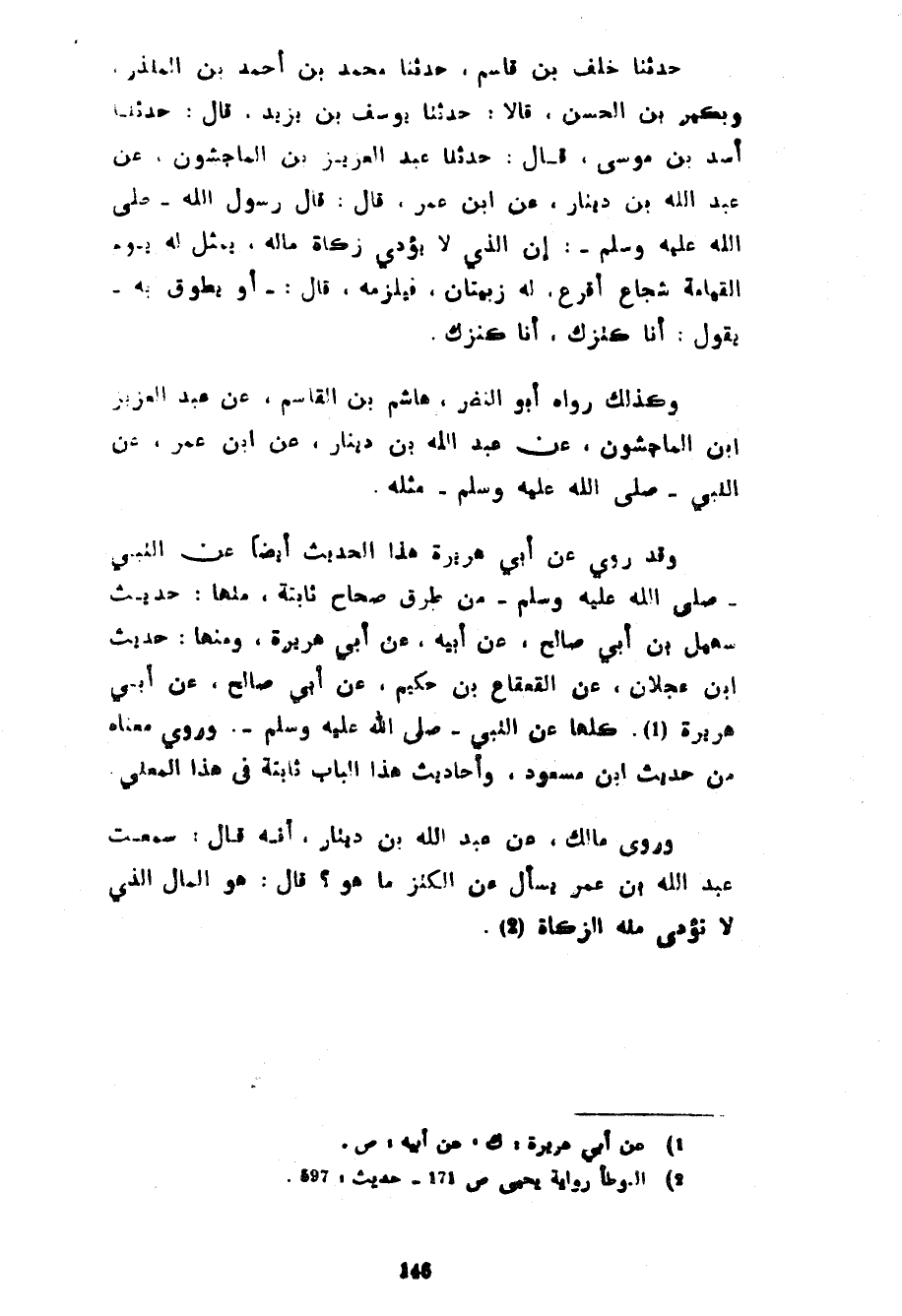 حَدَّثَنَا خَلَفُ بْنُ قَاسِمٍ حَدَّثَنَا مُحَمَّدُ بْنُ أَحْمَدَ بْنِ الْمُنْذِرِ وَبُكَيْرُ بْنُ الْحَسَنِ قَالَا حَدَّثَنَا يُوسُفُ بْنِ يَزِيدَ قَالَ حَدَّثَنَا أَسَدُ بْنُ مُوسَى قَالَ حَدَّثَنَا عَبْدُ الْعَزِيزِ بْنُ الماجشون عَنْ عَبْدِ اللَّهِ بْنِ دِينَارٍ عَنِ ابْنِ عُمَرَ قَالَ قَالَ رَسُولُ اللَّهِ صَلَّى اللَّهُ عَلَيْهِ وَسَلَّمَ إِنَّ الَّذِي لَا يُؤَدِّي زَكَاةَ مَالِهِ يُمَثَّلُ لَهُ يَوْمَ الْقِيَامَةِ شُجَاعٌ أَقْرَعُ لَهُ زَبِيبَتَانِ فَيَلْزَمُهُ قَالَ أَوْ يُطَوَّقُ بِهِ يَقُولُ أَنَا كَنْزُكَ أَنَا كَنْزُكَ وَكَذَلِكَ رَوَاهُ أَبُو النَّضْرِ هَاشِمُ بْنُ الْقَاسِمِ عَنْ عبد العزيز بن الماجشون عَنْ عَبْدِ اللَّهِ بْنِ دِينَارٍ عَنِ ابْنِ عُمَرَ عَنِ النَّبِيِّ صَلَّى اللَّهُ عَلَيْهِ وَسَلَّمَ مِثْلَهُ وَقَدْ رُوِيَ عَنْ أَبِي هُرَيْرَةَ هَذَا الْحَدِيثُ أَيْضًا عَنِ النَّبِيِّ صَلَّى اللَّهُ عَلَيْهِ وَسَلَّمَ مِنْ طُرُقٍ صِحَاحٍ ثَابِتَةٍ مِنْهَا حَدِيثُ سُهَيْلِ بْنِ أَبِي صَالِحٍ عَنْ أَبِيهِ عَنْ أَبِي هُرَيْرَةَ وَمِنْهَا حَدِيثُ ابْنُ عَجْلَانَ عَنِ الْقَعْقَاعِ بْنِ حَكِيمٍ عَنْ أَبِي صَالِحٍ عَنْ أَبِي هُرَيْرَةَ كُلُّهَا عَنِ النَّبِيِّ صَلَّى اللَّهُ عَلَيْهِ وَسَلَّمَ وروى مَعْنَاهُ مِنْ حَدِيثِ ابْنِ مَسْعُودٍ وَأَحَادِيثُ هَذَا الْبَابِ ثَابِتَةٌ فِي هَذَا الْمَعْنَى وَرَوَى مَالِكٌ عَنْ عَبْدِ اللَّهِ بْنِ دِينَارٍ أَنَّهُ قَالَ سَمِعْتُ عَبْدَ اللَّهِ بْنَ عُمَرَ يَسْأَلُ عَنِ الْكَنْزِ مَا هُوَ قَالَ هُوَ الْمَالُ الَّذِي لَا تُؤَدَّى مِنْهُ الزَّكَاةُ