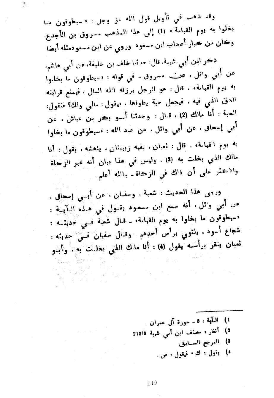 وَقَدْ ذَهَبَ فِي تَأْوِيلِ قَوْلِ اللَّهِ عَزَّ وَجَلَّ سَيُطَوَّقُونَ مَا بَخِلُوا بِهِ يَوْمَ الْقِيَامَةِ إِلَى هَذَا الْمَذْهَبِ مَسْرُوقُ بْنُ الْأَجْدَعِ وَكَانَ مِنْ كِبَارِ أَصْحَابِ ابْنِ مَسْعُودٍ وَرُوِيَ عَنِ ابْنِ مَسْعُودٍ مِثْلُهُ أَيْضًا ذَكَرَ ابْنُ أَبِي شَيْبَةَ قَالَ حَدَّثَنَا خَلَفُ بْنُ خَلِيفَةَ عَنْ أَبِي هَاشِمٍ عَنْ أَبِي وَائِلٍ عَنْ مَسْرُوقٍ في قوله سيطوقون مابخلوا به يوم القيامة قال هوالرجل يَرْزُقُهُ اللَّهُ الْمَالَ فَيَمْنَعُ قَرَابَتَهُ الْحَقَّ الَّذِي فيه فيجعل حية يطوقها فيقول مالي وَلَكِ فَتَقُولُ الْحَيَّةُ أَنَا مَالُكُ قَالَ وَحَدَّثَنَا أَبُو بَكْرِ بْنُ عَيَّاشٍ عَنْ أَبِي إِسْحَاقَ عَنْ أَبِي وَائِلٍ عَنْ عَبْدِ اللَّهِ سَيُطَوَّقُونَ مَا بَخِلُوا بِهِ يَوْمَ الْقِيَامَةِ قَالَ ثُعْبَانٌ بِفِيهِ زَبِيبَتَانِ يَنْهَشُهُ يَقُولُ أَنَا مَالُكُ الَّذِي بَخِلْتَ بِهِ وَلَيْسَ فِي هَذَا بَيَانٌ أَنَّهُ غَيْرُ الزَّكَاةِ وَالْأَكْثَرُ عَلَى أَنَّ ذَلِكَ فِي الزَّكَاةِ وَاللَّهُ أَعْلَمُ وَرَوَى هَذَا الْحَدِيثَ شُعْبَةُ وَسُفْيَانُ عَنْ أَبِي إِسْحَاقَ عَنْ أَبِي وَائِلٍ أَنَّهُ سَمِعَ ابْنَ مَسْعُودٍ يَقُولُ فِي هَذِهِ الْآيَةِ سَيُطَوَّقُونَ مَا بَخِلُوا بِهِ يَوْمَ الْقِيَامَةِ قَالَ شُعْبَةُ فِي حَدِيثِهِ شُجَاعٌ أَسْوَدُ يَلْتَوِي بِرَأْسِ أَحَدِهِمْ وَقَالَ سُفْيَانُ فِي حَدِيثِهِ ثُعْبَانٌ يَنْقُرُ بِرَأْسِهِ يَقُولُ أَنَا مَالُكَ الَّذِي بَخِلْتَ به وأبو