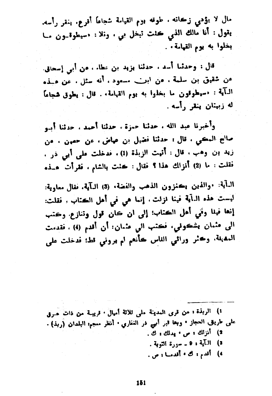 مَالٌ لَا يُؤَدِّي زَكَاتَهُ طَوَّقَهُ يَوْمَ الْقِيَامَةِ شُجَاعًا أَقْرَعَ يَنْقُرُ رَأْسَهُ يَقُولُ أَنَا مَالُكَ الَّذِي كُنْتَ تَبْخَلُ بِي وَتَلَا سَيُطَوَّقُونَ مَا بَخِلُوا بِهِ يَوْمَ الْقِيَامَةِ قَالَ وَحَدَّثَنَا أَسَدٌ حَدَّثَنَا يَزِيدُ بْنُ عَطَاءٍ عَنْ أَبِي إِسْحَاقَ عَنْ شَقِيقِ بْنِ سَلَمَةَ عَنِ ابْنِ مَسْعُودٍ أَنَّهُ سُئِلَ عَنْ هَذِهِ الْآيَةِ سَيُطَوَّقُونَ مَا بَخِلُوا بِهِ يَوْمَ الْقِيَامَةِ قَالَ يُطَوَّقُ شُجَاعًا لَهُ زَبِيبَتَانِ يَنْقُرُ رَأْسَهُ وَأَخْبَرَنَا عَبْدُ اللَّهِ حَدَّثَنَا حَمْزَةُ حَدَّثَنَا أَحْمَدُ حَدَّثَنَا أَبُو صَالِحٍ المكي قال حدثنا فضيل بن عياض عن حُصَيْنٍ عَنْ زَيْدِ بْنِ وَهْبٍ قَالَ أَتَيْتُ الرَّبَذَةَ فَدَخَلْتُ عَلَى أَبِي ذَرٍّ فَقُلْتُ مَا أَنْزَلَكَ هَذَا فَقَالَ كُنْتُ بِالشَّامِ فَقَرَأْتُ هَذِهِ الْآيَةَ وَالَّذِينَ يَكْنِزُونَ الذَّهَبَ وَالْفِضَّةَ الْآيَةَ فَقَالَ مُعَاوِيَةُ لَيْسَتْ هَذِهِ الْآيَةُ فِينَا نَزَلَتْ إِنَّمَا هِيَ فِي أَهْلِ الْكِتَابِ فَقُلْتُ إِنَّهَا فِينَا وَفِي أَهْلِ الْكِتَابِ إِلَى أَنْ كَانَ قَوْلٌ وَتَنَازُعٌ وَكَتَبَ إِلَى عُثْمَانَ يَشْكُونِي فَكَتَبَ إِلَيَّ عُثْمَانُ أَنْ أَقْدِمْ فَقَدِمْتُ الْمَدِينَةَ وَكَثُرَ وَرَائِيَ النَّاسُ كَأَنَّهُمْ لَمْ يَرَوْنِي قَطُّ فَدَخَلْتُ عَلَى