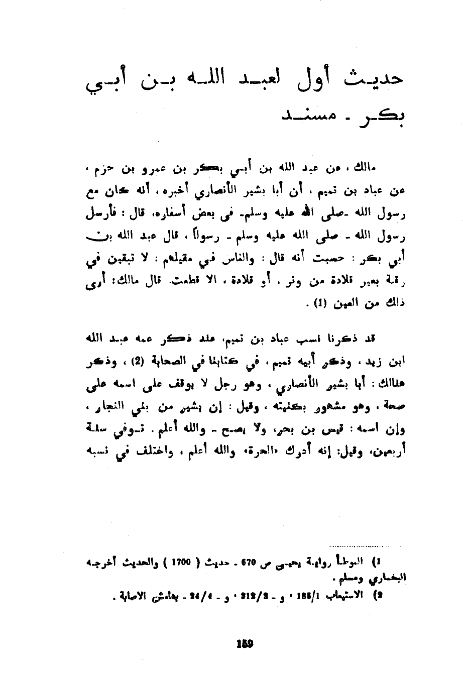 حَدِيثٌ أَوَّلُ لِعَبْدِ اللَّهِ بْنِ أَبِي بَكْرٍ مُسْنَدٌ مَالِكٌ عَنْ عَبْدِ اللَّهِ بْنِ أَبِي بَكْرٍ بْنِ عَمْرِو بْنِ حَزْمٍ عَنْ عَبَّادِ بْنِ تَمِيمٍ أَنَّ أَبَا بَشِيرٍ الْأَنْصَارِيَّ أَخْبَرَهُ أَنَّهُ كَانَ مَعَ رَسُولِ اللَّهِ صَلَّى اللَّهُ عَلَيْهِ وَسَلَّمَ فِي بَعْضِ أَسْفَارِهِ قَالَ فَأَرْسَلَ رَسُولُ اللَّهِ صَلَّى اللَّهُ عَلَيْهِ وَسَلَّمَ رَسُولًا قَالَ عَبْدُ اللَّهِ بْنُ أَبِي بَكْرٍ حَسِبْتُ أَنَّهُ قَالَ وَالنَّاسُ فِي مَقِيلِهِمْ لَا تَبْقَيَنَّ فِي رَقَبَةِ بَعِيرٍ قِلَادَةٌ مِنْ وَتَرٍ أَوْ قِلَادَةٌ إِلَّا قُطِعَتْ قَالَ مَالِكٌ أَرَى ذَلِكَ مِنَ الْعَيْنِ قَدْ ذَكَرْنَا نَسَبَ عَبَّادِ بْنِ تَمِيمٍ عِنْدَ ذِكْرِ عَمِّهِ عَبْدِ اللَّهِ بْنِ زَيْدٍ وَذِكْرِ أَبِيهِ تَمِيمٍ فِي كِتَابِنَا فِي الصَّحَابَةِ وَذَكَرَ هُنَالِكَ أَبَا بَشِيرٍ الْأَنْصَارِيَّ وَهُوَ رَجُلٌ لَا يُوقَفُ عَلَى اسْمِهِ عَلَى صِحَّةٍ وَهُوَ مَشْهُورٌ بِكُنْيَتِهِ وَقِيلَ إِنَّ بَشِيرَ مِنْ بَنِي النَّجَّارِ وَإِنَّ اسْمَهُ قَيْسُ بْنُ بَحْرٍ وَلَا يَصِحُّ وَاللَّهُ أَعْلَمُ تُوُفِّيَ سَنَةَ أَرْبَعِينَ وَقِيلَ إِنَّهُ أَدْرَكَ الْحَرَّةَ وَاللَّهُ أَعْلَمُ وَاخْتُلِفَ في نسبه