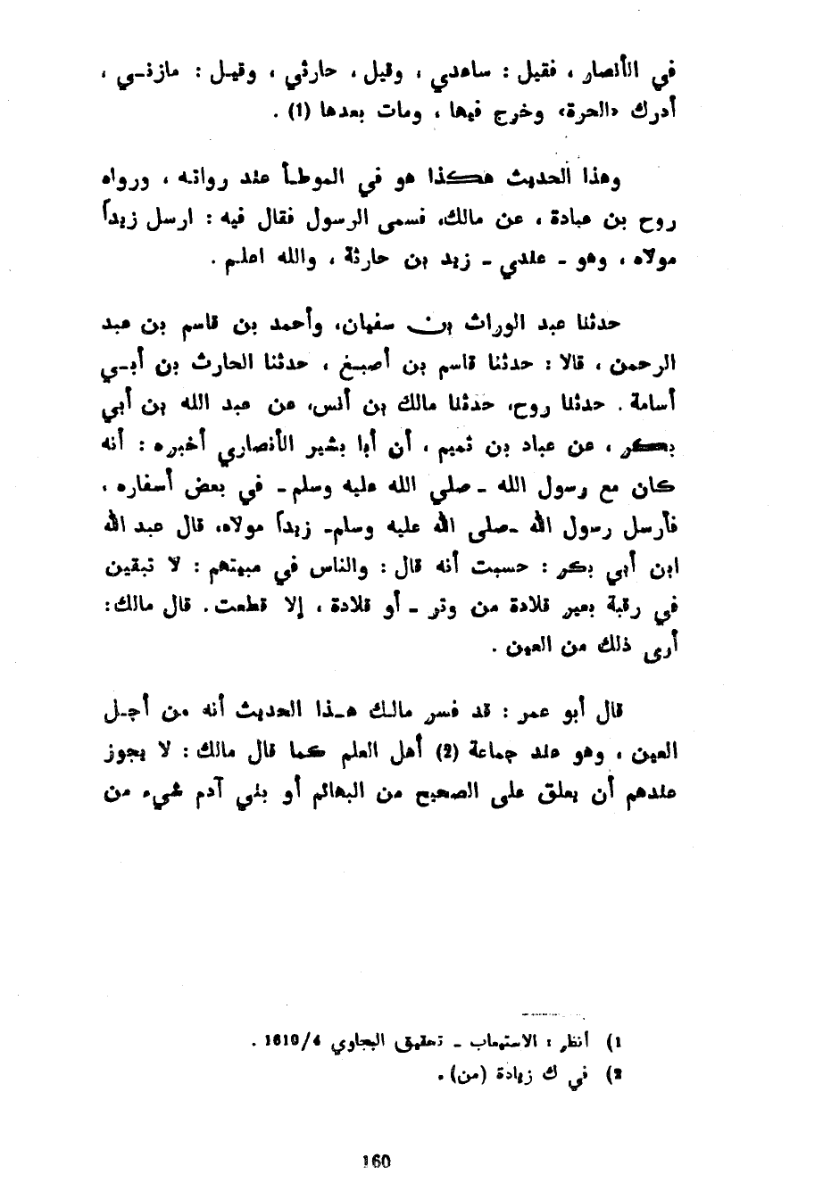 فِي الْأَنْصَارِ فَقِيلَ سَاعِدِيٌّ وَقِيلَ حَارِثِيٌّ وَقِيلَ مَازِنِيٌّ أَدْرَكَ الْحَرَّةَ وَخَرَجَ فِيهَا وَمَاتَ بَعْدَهَا وَهَذَا الْحَدِيثُ هَكَذَا هُوَ فِي الْمُوَطَّأِ عِنْدَ رُوَاتِهِ وَرَوَاهُ رَوْحُ بْنُ عُبَادَةَ عَنْ مَالِكٍ فَسَمَّى الرَّسُولَ فَقَالَ فِيهِ أَرْسَلَ زَيْدًا مَوْلَاهُ وَهُوَ عِنْدِي زَيْدُ بْنُ حَارِثَةَ وَاللَّهُ أَعْلَمُ حَدَّثَنَا عَبْدُ الْوَارِثِ بْنُ سُفْيَانَ وَأَحْمَدُ بْنُ قَاسِمٍ بْنِ عَبْدِ الرَّحْمَنِ قَالَا حَدَّثَنَا قَاسِمُ بن أصبغ حدثناالحارث بْنُ أَبِي أُسَامَةَ حَدَّثَنَا رَوْحٌ حَدَّثَنَا مَالِكِ بْنِ أَنَسٍ عَنْ عَبْدِ اللَّهِ بْنِ أَبِي بَكْرٍ عَنْ عَبَّادِ بْنِ تَمِيمٍ أَنَّ أَبَا بَشِيرٍ الْأَنْصَارِيَّ أَخْبَرَهُ أَنَّهُ كَانَ مَعَ رَسُولِ اللَّهِ صَلَّى اللَّهُ عَلَيْهِ وَسَلَّمَ فِي بَعْضِ أَسْفَارِهِ فَأَرْسَلَ رَسُولُ اللَّهِ صَلَّى اللَّهُ عَلَيْهِ وَسَلَّمَ زَيْدًا مَوْلَاهُ قَالَ عَبْدُ اللَّهِ بْنُ أَبِي بَكْرٍ حَسِبْتُ أَنَّهُ قَالَ وَالنَّاسُ فِي مَبِيتِهِمْ لَا تَبْقَيْنَ فِي رَقَبَةِ بَعِيرٍ قِلَادَةٌ مِنْ وَتَرٍ أَوْ قِلَادَةٌ إِلَّا قُطِعَتْ قَالَ مَالِكٌ أَرَى ذَلِكَ مِنَ الْعَيْنِ قَالَ أَبُو عُمَرَ قَدْ فَسَّرَ مَالِكٌ هَذَا الْحَدِيثَ أَنَّهُ مِنْ أَجْلِ الْعَيْنِ وَهُوَ عِنْدَ جَمَاعَةٍ مِنْ أَهْلِ الْعِلْمِ كَمَا قَالَ مَالِكٌ لَا يَجُوزُ عِنْدَهُمْ أَنْ يُعَلِّقَ عَلَى الصَّحِيحِ مِنَ الْبَهَائِمِ أَوْ بَنِي آدَمَ شَيْءٌ مِنَ