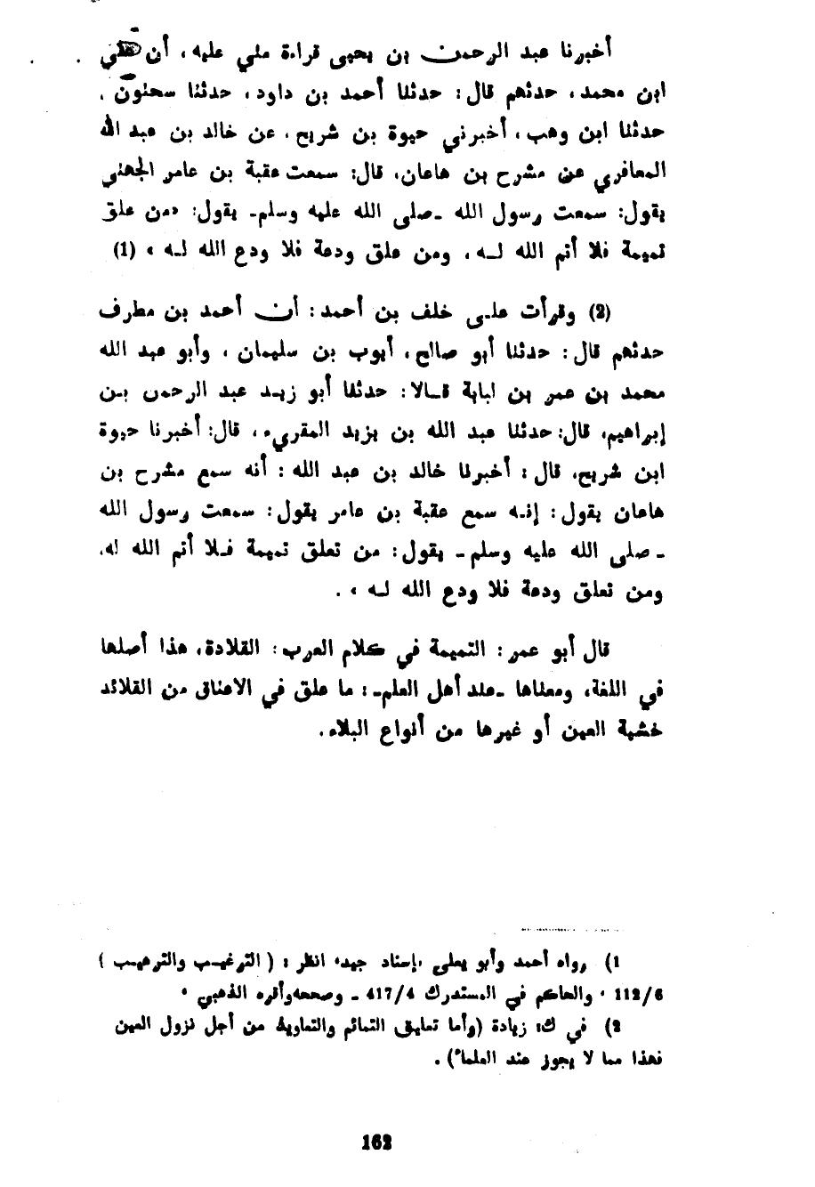 أَخْبَرَنَا عَبْدُ الرَّحْمَنِ بْنُ يَحْيَى قِرَاءَةً مِنِّي عَلَيْهِ أَنَّ عَلِيَّ بْنَ مُحَمَّدٍ حَدَّثَهُمْ قَالَ حَدَّثَنَا أَحْمَدُ بْنُ دَاوُدَ حَدَّثَنَا سَحْنُونُ حَدَّثَنَا وَهْبٍ أَخْبَرَنِي حَيْوَةُ بْنُ شُرَيْحٍ عَنْ خَالِدِ بْنِ عَبْدِ اللَّهِ الْمُعَافِرِيِّ عَنْ مِشْرَحِ بْنِ هَاعَانَ قَالَ سَمِعْتُ عُقْبَةَ بْنَ عَامِرٍ الْجُهَنِيَّ يَقُولُ سَمِعْتُ رَسُولَ اللَّهِ صَلَّى اللَّهُ عَلَيْهِ وَسَلَّمَ يَقُولُ مَنْ عَلَّقَ تَمِيمَةً فَلَا أَتَمَّ اللَّهُ لَهُ وَمَنْ عَلَّقَ وَدَعَةً فَلَا وَدَعَ اللَّهُ لَهُ وَقَرَأْتُ عَلَى خَلَفِ بْنِ أَحْمَدَ أَنَّ أَحْمَدَ بْنَ مُطَرِّفٍ حَدَّثَهُمْ قَالَ حَدَّثَنَا أَبُو صَالِحٍ أَيُّوبُ بْنُ سُلَيْمَانَ وَأَبُو عَبْدِ اللَّهِ مُحَمَّدُ بْنُ عُمَرَ بْنِ لُبَابَةَ قَالَا حَدَّثَنَا أَبُو زَيْدٍ عَبْدُ الرَّحْمَنِ بْنُ إِبْرَاهِيمَ قَالَ حَدَّثَنَا عَبْدُ اللَّهِ بْنُ يَزِيدَ الْمُقْرِئُ قَالَ أَخْبَرَنَا حَيْوَةُ بْنُ شُرَيْحٍ قَالَ أَخْبَرَنَا خَالِدُ بْنُ عَبْدِ اللَّهِ أَنَّهُ سَمِعَ مِشْرَحَ بْنَ هَاعَانَ يَقُولُ إِنَّهُ سَمِعَ عُقْبَةَ بْنَ عَامِرٍ يَقُولُ سَمِعْتُ رَسُولَ اللَّهِ صَلَّى اللَّهُ عَلَيْهِ وَسَلَّمَ يَقُولُ مَنْ تَعَلَّقَ تَمِيمَةً فَلَا أَتَمَّ اللَّهُ لَهُ وَمَنْ تَعَلَّقَ وَدَعَةً فَلَا ودع الله له قال أبوعمر التَّمِيمَةُ فِي كَلَامِ الْعَرَبِ الْقِلَادَةُ هَذَا أَصْلُهَا فِي اللُّغَةِ وَمَعْنَاهَا عِنْدَ أَهْلِ الْعِلْمِ مَا عُلِّقَ فِي الْأَعْنَاقِ مِنَ الْقَلَائِدِ خَشْيَةَ الْعَيْنِ أَوْ غَيْرِهَا مِنْ أَنْوَاعِ الْبَلَاءِ