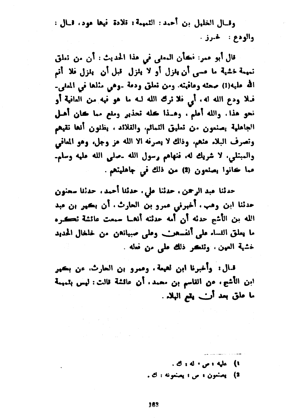 وَقَالَ الْخَلِيلُ بْنُ أَحْمَدَ التَّمِيمَةُ قِلَادَةٌ فِيهَا عُودٌ قَالَ وَالْوَدْعُ خَرَزٌ قَالَ أَبُو عُمَرَ فَكَأَنَّ الْمَعْنَى فِي هَذَا الْحَدِيثِ أَنَّ مَنْ تَعَلَّقَ تَمِيمَةً خَشْيَةَ مَا عَسَى أَنْ يَنْزِلَ أَوْ لَا يَنْزِلَ قَبْلَ أَنْ يَنْزِلَ فَلَا أَتَمَّ اللَّهُ عَلَيْهِ صِحَّتَهُ وَعَافِيَتَهُ وَمَنْ تَعَلَّقَ وَدَعَةً وَهِيَ مِثْلُهَا فِي الْمَعْنَى فَلَا وَدَعَ اللَّهُ لَهُ أَيْ فَلَا تَرَكَ اللَّهُ لَهُ مَا هُوَ فِيهِ مِنَ الْعَافِيَةِ أَوْ نَحْوِ هَذَا وَاللَّهُ أَعْلَمُ وَهَذَا كُلُّهُ تَحْذِيرٌ وَمَنْعٌ مِمَّا كَانَ أَهْلُ الْجَاهِلِيَّةِ يَصْنَعُونَ مِنْ تَعْلِيقِ التَّمَائِمِ وَالْقَلَائِدِ يَظُنُّونَ أَنَّهَا تَقِيهِمْ وَتَصْرِفُ الْبَلَاءَ عَنْهُمْ وَذَلِكَ لَا يَصْرِفُهُ إِلَّا اللَّهُ عَزَّ وَجَلَّ وَهُوَ الْمُعَافِي وَالْمُبْتَلِي لَا شَرِيكَ لَهُ فَنَهَاهُمْ رَسُولَ اللَّهِ صَلَّى اللَّهُ عَلَيْهِ وَسَلَّمَ عَمَّا كَانُوا يَصْنَعُونَ مِنْ ذَلِكَ فِي جَاهِلِيَّتِهِمْ حَدَّثَنَا عَبْدُ الرَّحْمَنِ حَدَّثَنَا عَلِيٌّ حَدَّثَنَا أَحْمَدُ حَدَّثَنَا سَحْنُونُ حَدَّثَنَا ابْنُ وَهْبٍ أَخْبَرَنِي عَمْرُو بْنُ الْحَارِثِ أَنَّ بُكَيْرَ بْنَ عَبْدِ اللَّهِ بْنِ الْأَشَجِّ حَدَّثَهُ أَنَّ أُمَّهُ حَدَّثَتْهُ أَنَّهَا سَمِعَتْ عَائِشَةَ تَكْرَهُ مَا يُعَلِّقُ النِّسَاءُ عَلَى أَنْفُسِهِنَّ وَعَلَى صِبْيَانِهِنَّ مِنْ خَلْخَالِ الْحَدِيدِ خَشْيَةَ الْعَيْنِ وَتُنْكِرُ ذَلِكَ عَلَى مَنْ فَعَلَهُ قَالَ وَأَخْبَرَنَا ابْنُ لَهِيعَةَ وَعَمْرُو بْنُ الْحَارِثِ عَنْ بُكَيْرِ بْنِ الْأَشَجِّ عَنِ الْقَاسِمِ بْنِ مُحَمَّدٍ أَنَّ عَائِشَةَ قَالَتْ لَيْسَ بِتَمِيمَةٍ مَا عُلِّقَ بَعْدَ أَنْ يَقَعَ الْبَلَاءُ