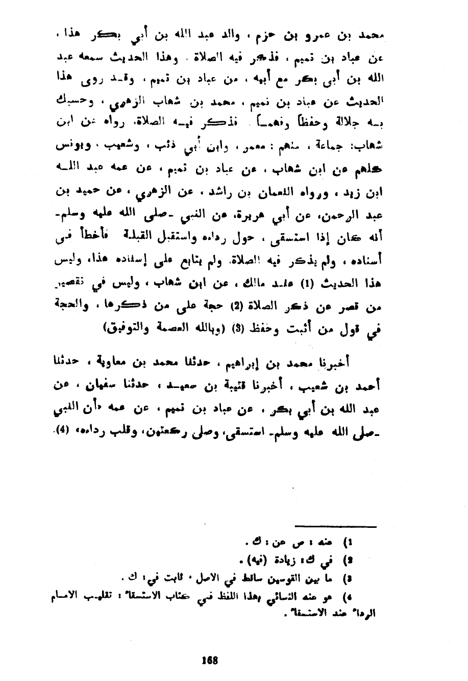 مُحَمَّدِ بْنِ عَمْرِو بْنِ حَزْمٍ وَالِدُ عَبْدِ اللَّهِ بْنِ أَبِي بَكْرٍ هَذَا عَنْ عَبَّادِ بْنِ تَمِيمٍ فَذَكَرَ فِيهِ الصَّلَاةَ وَهَذَا الْحَدِيثُ سَمِعَهُ عَبْدُ اللَّهِ بْنُ أَبِي بَكْرٍ مَعَ أَبِيهِ مِنْ عَبَّادِ بْنِ تَمِيمٍ وَقَدْ رَوَى هَذَا الْحَدِيثَ عَنْ عَبَّادِ بْنِ تَمِيمٍ مُحَمَّدُ بْنُ شِهَابٍ الزُّهْرِيُّ وَحَسْبُكَ بِهِ جَلَالَةً وَحِفْظًا وَفَهْمًا فَذَكَرَ فِيهِ الصَّلَاةَ رَوَاهُ عَنِ ابْنِ شِهَابٍ جَمَاعَةٌ مِنْهُمْ مَعْمَرٌ وَابْنُ أَبِي ذِئْبٍ وَشُعَيْبٌ وَيُونُسُ كُلُّهُمْ عَنِ ابْنِ شِهَابٍ عَنْ عَبَّادِ بْنُ تَمِيمٍ عَنْ عَمِّهِ عَبْدِ اللَّهِ بْنِ زَيْدٍ وَرَوَاهُ النُّعْمَانُ بْنُ رَاشِدٍ عَنِ الزُّهْرِيُّ عَنْ حُمَيْدِ بْنِ عَبْدِ الرَّحْمَنِ عَنْ أَبِي هُرَيْرَةَ عَنِ النَّبِيِّ صَلَّى اللَّهُ عَلَيْهِ وَسَلَّمَ أَنَّهُ كَانَ إِذَا اسْتَسْقَى حَوَّلَ رِدَاءَهُ وَاسْتَقْبَلَ الْقِبْلَةَ فَأَخْطَأَ فِي إِسْنَادِهِ وَلَمْ يَذْكُرْ فِيهِ الصَّلَاةَ وَلَمْ يُتَابَعْ عَلَى إِسْنَادِهِ هَذَا وَلَيْسَ هَذَا الْحَدِيثُ عِنْدَ مَالِكٍ عَنِ ابْنِ شِهَابٍ وَلَيْسَ فِي تَقْصِيرِ مَنْ قَصَرَ عَنْ ذِكْرِ الصَّلَاةِ حُجَّةٌ عَلَى مَنْ ذَكَرَهَا وَالْحُجَّةُ فِي قَوْلِ مَنْ أَثْبَتَ وَحَفِظَ (وَبِاللَّهِ الْعِصْمَةُ وَالتَّوْفِيقُ) أَخْبَرَنَا مُحَمَّدُ بْنُ إِبْرَاهِيمَ حَدَّثَنَا مُحَمَّدُ بْنُ مُعَاوِيَةَ حدثنا أحمد بن شعيب أخبرنا قُتَيْبَةُ بْنُ سَعِيدٍ حَدَّثَنَا سُفْيَانَ عَنْ عَبْدِ اللَّهِ بْنِ أَبِي بَكْرٍ عَنْ عباد بن تَمِيمٍ عَنْ عَمِّهِ أَنَّ النَّبِيَّ صَلَّى اللَّهُ عَلَيْهِ وسلم استسقى وصلى ركعتين وقلت رداءه