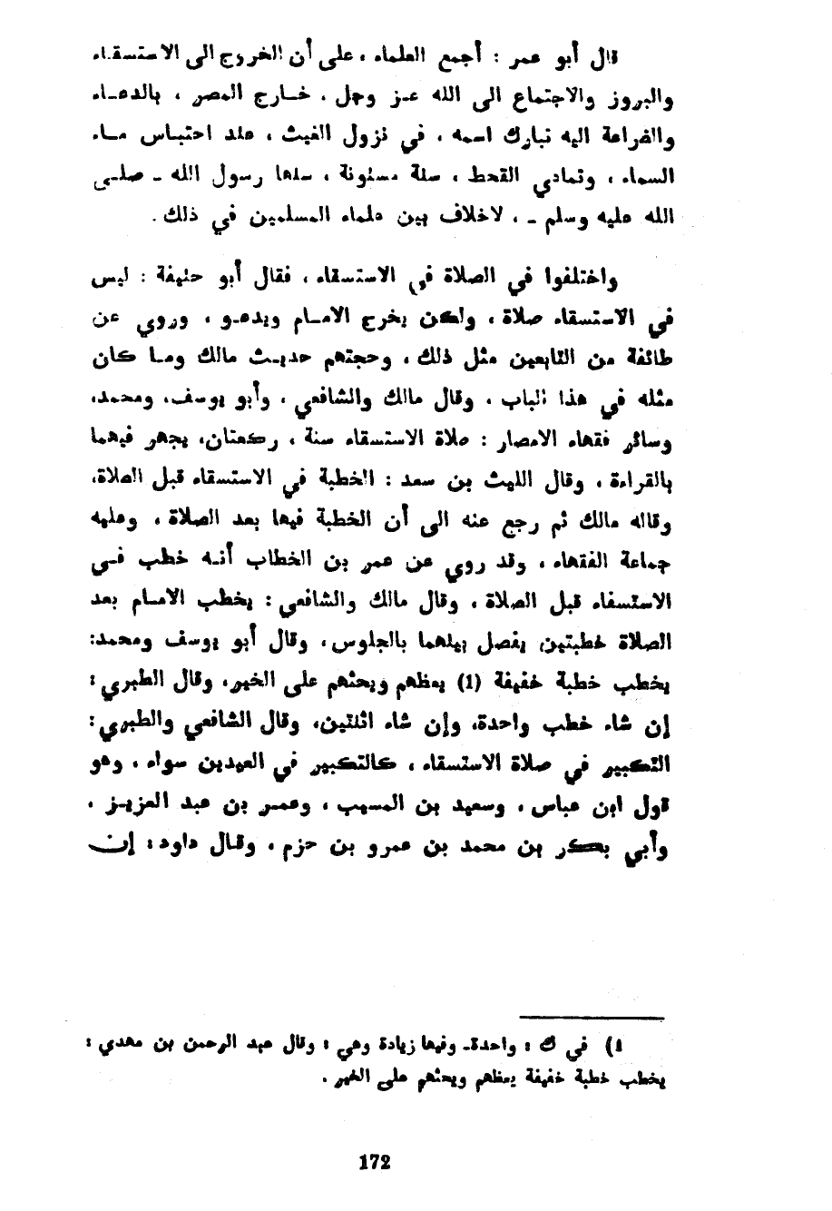 قَالَ أَبُو عُمَرَ أَجْمَعَ الْعُلَمَاءُ عَلَى أَنَّ الْخُرُوجَ إِلَى الِاسْتِسْقَاءِ وَالْبُرُوزَ وَالِاجْتِمَاعَ إِلَى اللَّهِ عَزَّ وَجَلَّ خَارِجَ الْمِصْرِ بِالدُّعَاءِ وَالضَّرَاعَةِ إِلَيْهِ تَبَارَكَ اسْمُهُ فِي نُزُولِ الْغَيْثِ عِنْدَ احْتِبَاسِ مَاءِ السَّمَاءِ وَتَمَادِي الْقَحْطِ سُنَّةٌ مَسْنُونَةٌ سَنَّهَا رَسُولُ اللَّهِ صَلَّى اللَّهُ عَلَيْهِ وَسَلَّمَ لا خِلَافَ بَيْنِ عُلَمَاءِ الْمُسْلِمِينَ فِي ذَلِكَ وَاخْتَلَفُوا فِي الصَّلَاةِ فِي الِاسْتِسْقَاءِ فَقَالَ أَبُو حَنِيفَةَ لَيْسَ فِي الِاسْتِسْقَاءِ صَلَاةٌ وَلَكِنْ يَخْرُجُ الْإِمَامُ وَيَدْعُو وَرُوِيَ عَنْ طَائِفَةٍ مِنَ التَّابِعَيْنِ مِثْلُ ذَلِكَ وَحُجَّتُهُمْ حَدِيثُ مَالِكٍ وَمَا كَانَ مِثْلَهُ فِي هَذَا الْبَابِ وَقَالَ مَالِكٌ وَالشَّافِعِيُّ وَأَبُو يُوسُفَ وَمُحَمَّدٌ وَسَائِرُ فُقَهَاءِ الْأَمْصَارِ صَلَاةُ الِاسْتِسْقَاءِ سُنَّةٌ رَكْعَتَانِ يَجْهَرُ فِيهِمَا بِالْقِرَاءَةِ وَقَالَ اللَّيْثُ بْنُ سَعْدٍ الْخُطْبَةُ فِي الِاسْتِسْقَاءِ قَبْلَ الصَّلَاةِ وَقَالَهُ مَالِكٌ ثُمَّ رَجَعَ عَنْهُ إِلَى أَنَّ الْخُطْبَةَ فِيهَا بَعْدَ الصَّلَاةِ وَعَلَيْهِ جَمَاعَةُ الْفُقَهَاءِ وَقَدْ رُوِيَ عَنْ عُمَرَ بْنِ الْخَطَّابِ أَنَّهُ خَطَبَ فِي الِاسْتِسْقَاءِ قَبْلَ الصَّلَاةِ وَقَالَ مَالِكٌ وَالشَّافِعِيُّ يَخْطُبُ الْإِمَامُ بَعْدَ الصَّلَاةِ خُطْبَتَيْنِ يَفْصِلُ بَيْنَهُمَا بِالْجُلُوسِ وَقَالَ أَبُو يُوسُفَ وَمُحَمَّدٌ يَخْطُبُ خُطْبَةً خَفِيفَةً يَعِظُهُمْ وَيَحُثُّهُمْ عَلَى الْخَيْرِ وَقَالَ الطَّبَرِيُّ إِنْ شَاءَ خَطَبَ وَاحِدَةً وَإِنْ شَاءَ اثْنَتَيْنِ وَقَالَ الشَّافِعِيُّ وَالطَّبَرِيُّ التَّكْبِيرُ فِي صَلَاةِ الِاسْتِسْقَاءِ كَالتَّكْبِيرِ فِي الْعِيدَيْنِ سَوَاءٌ وَهُوَ قَوْلُ ابْنِ عَبَّاسٍ وَسَعِيدِ بْنِ الْمُسَيَّبِ وَعُمَرَ بْنِ عَبْدِ الْعَزِيزِ وَأَبِي بَكْرِ بْنِ مُحَمَّدِ بْنِ عَمْرِو بْنِ حَزْمٍ وَقَالَ دَاوُدُ إِنْ