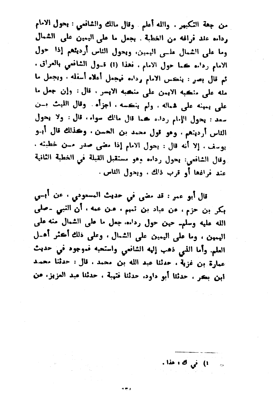 جِهَةِ التَّكْبِيرِ وَاللَّهُ أَعْلَمُ وَقَالَ مَالِكٌ وَالشَّافِعِيُّ يُحَوِّلُ الْإِمَامُ رِدَاءَهُ عِنْدَ فَرَاغِهِ مِنَ الْخُطْبَةِ يَجْعَلُ مَا عَلَى الْيَمِينِ عَلَى الشِّمَالِ وَمَا عَلَى الشِّمَالِ عَلَى الْيَمِينِ وَيُحَوِّلُ النَّاسُ أَرْدَيْتَهُمْ إِذَا حَوَّلَ الْإِمَامُ رِدَاءَهُ كَمَا حَوَّلَ الْإِمَامُ فهذا قول الشافعي بالعراق ثم قال بصر يُنَكِّسُ الْإِمَامُ رِدَاءَهُ فَيَجْعَلُ أَعْلَاهُ أَسْفَلَهُ وَيَجْعَلُ مَا مِنْهُ عَلَى مَنْكِبِهِ الْأَيْمَنِ عَلَى مَنْكِبِهِ الْأَيْسَرِ قَالَ وَإِنْ جَعْلَ مَا عَلَى يَمِينِهِ عَلَى شَمَالِهِ وَلَمْ يُنَكِّسْهُ أَجَزْأَهُ وَقَالَ اللَّيْثُ بْنُ سَعْدٍ يُحَوِّلُ الْإِمَامُ رِدَاءَهُ كَمَا قَالَ مَالِكٌ سَوَاءً قَالَ وَلَا يُحَوِّلُ النَّاسُ أَرْدَيْتَهُمْ وَهُوَ قَوْلُ مُحَمَّدِ بْنِ الْحَسَنِ وَكَذَلِكَ قَالَ أَبُو يُوسُفَ إِلَّا أَنَّهُ قَالَ يُحَوِّلُ الْإِمَامُ إِذَا مَضَى صَدْرٌ مِنْ خُطْبَتِهِ وَقَالَ الشَّافِعِيُّ يُحَوِّلُ رِدَاءَهُ وَهُوَ مُسْتَقْبِلٌ الْقِبْلَةَ فِي الْخُطْبَةِ الثَّانِيَةِ عِنْدَ فَرَاغِهَا أَوْ قُرْبَ ذَلِكَ وَيُحَوَّلُ النَّاسُ قَالَ أَبُو عُمَرَ قَدْ مَضَى فِي حَدِيثِ الْمَسْعُودِيِّ عَنْ أَبِي بَكْرِ بْنِ حَزْمٍ عَنْ عَبَّادِ بْنِ تَمِيمٍ عَنْ عَمِّهِ أَنَّ النَّبِيَّ صَلَّى اللَّهُ عَلَيْهِ وَسَلَّمَ حِينَ حَوَّلَ رِدَاءَهُ جَعَلَ مَا عَلَى الشِّمَالِ مِنْهُ عَلَى الْيَمِينِ وَمَا عَلَى الْيَمِينِ عَلَى الشِّمَالِ وَعَلَى ذَلِكَ أَكْثَرُ أَهْلِ الْعِلْمِ وَأَمَّا الَّذِي ذَهَبَ إِلَيْهِ الشَّافِعِيُّ وَاسْتَحَبَّهُ فَمَوْجُودٌ فِي حَدِيثِ عِمَارَةَ بْنِ غَزِيَّةَ حَدَّثَنَا عَبْدُ اللَّهِ بْنُ مُحَمَّدٍ قَالَ حَدَّثَنَا مُحَمَّدُ بْنُ بَكْرٍ قَالَ حَدَّثَنَا أَبُو دَاوُدَ حَدَّثَنَا قُتَيْبَةُ حَدَّثَنَا عَبْدُ الْعَزِيزِ عن