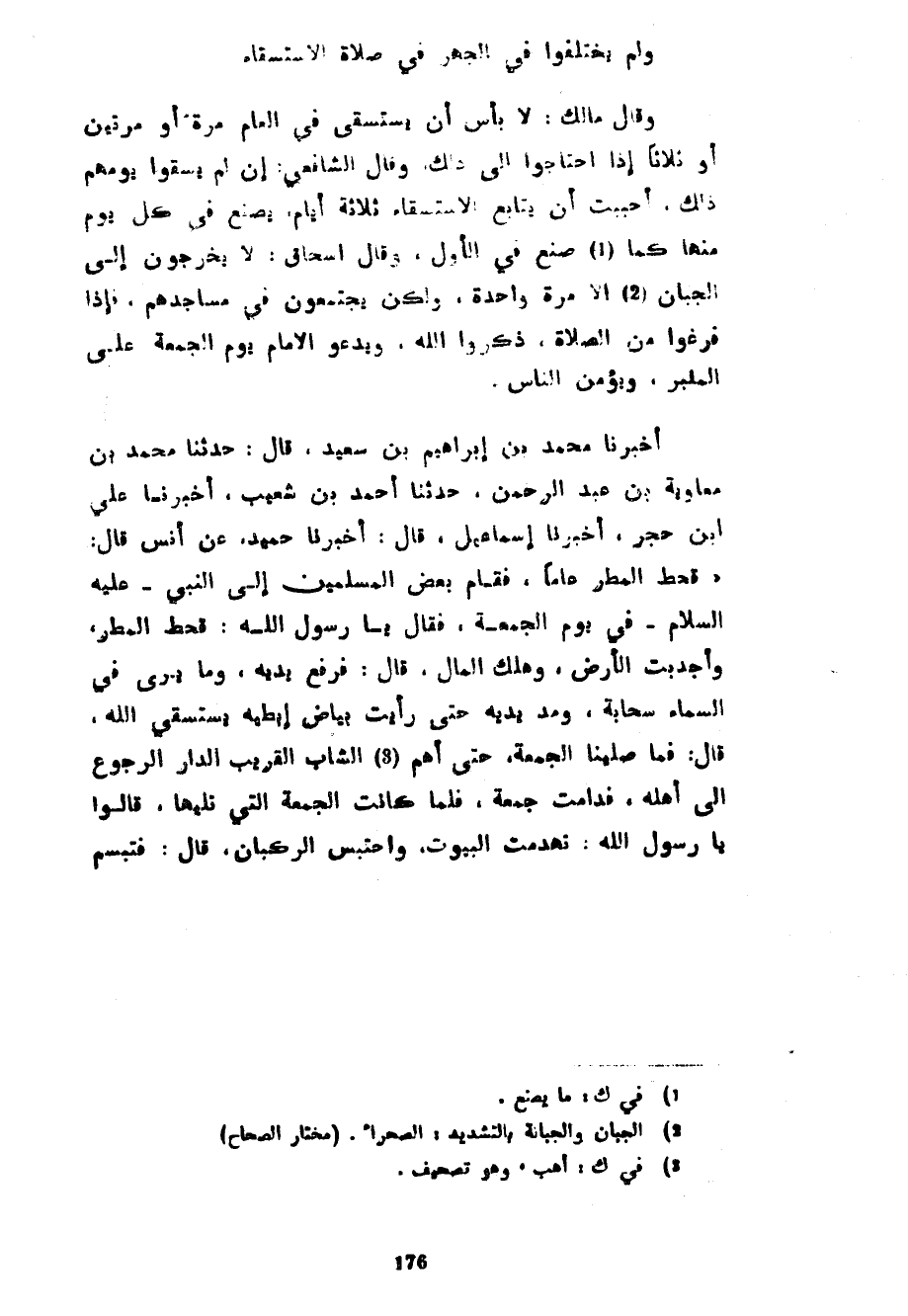 وَلَمْ يَخْتَلِفُوا فِي الْجَهْرِ فِي صَلَاةِ الِاسْتِسْقَاءِ وَقَالَ مَالِكٌ لَا بَأْسَ أَنْ يُسْتَسْقَى فِي الْعَامِ مَرَّةً أَوْ مَرَّتَيْنِ أَوْ ثَلَاثًا إِذَا احْتَاجُوا إِلَى ذَلِكَ وَقَالَ الشَّافِعِيُّ إِنْ لَمْ يُسْقَوْا يَوْمَهُمْ ذَلِكَ أَحْبَبْتُ أَنْ يُتَابَعَ الِاسْتِسْقَاءُ ثَلَاثَةَ أَيَّامٍ يُصْنَعُ فِي كُلِّ يَوْمٍ مِنْهَا كَمَا صُنِعَ فِي الْأَوَّلِ وَقَالَ إِسْحَاقُ لَا يَخْرُجُونَ إِلَى الْجَبَّانِ إِلَّا مَرَّةً وَاحِدَةً وَلَكِنْ يَجْتَمِعُونَ فِي مَسَاجِدِهِمْ فَإِذَا فَرَغُوا مِنَ الصَّلَاةِ ذَكَرُوا اللَّهَ وَيَدْعُو الْإِمَامُ يَوْمَ الْجُمُعَةِ عَلَى الْمِنْبَرِ وَيُؤَمِّنُ النَّاسُ أَخْبَرَنَا مُحَمَّدُ بْنُ إِبْرَاهِيمَ بْنِ سَعِيدٍ قَالَ حَدَّثَنَا مُحَمَّدُ بْنُ مُعَاوِيَةَ بْنِ عَبْدِ الرَّحْمَنِ حَدَّثَنَا أَحْمَدُ بْنُ شُعَيْبٍ أَخْبَرَنَا عَلِيُّ بْنُ حُجْرٍ أَخْبَرَنَا إِسْمَاعِيلُ قَالَ أَخْبَرَنَا حُمَيْدٌ عَنْ أَنَسٍ قَالَ قَحَطَ الْمَطَرُ عَامًا فَقَامَ بَعْضُ الْمُسْلِمِينَ إِلَى النَّبِيِّ عَلَيْهِ السَّلَامُ فِي يَوْمِ الْجُمُعَةِ فَقَالَ يَا رَسُولَ اللَّهِ قَحَطَ الْمَطَرُ وَأَجْدَبَتِ الْأَرْضُ وَهَلَكَ الْمَالُ قَالَ فَرَفَعَ يَدَيْهِ وَمَا يُرَى فِي السَّمَاءِ سَحَابَةٌ وَمَدَّ يَدَيْهِ حَتَّى رَأَيْتُ بَيَاضَ إِبِطَيْهِ يَسْتَسْقِي اللَّهَ قَالَ فَمَا صَلَّيْنَا الْجُمُعَةَ حَتَّى أَهَمَّ الشَّابُّ الْقَرِيبُ الدَّارَ الرُّجُوعَ إِلَى أَهْلِهِ فَدَامَتْ جُمُعَةً فَلَمَّا كَانَتِ الْجُمُعَةُ الَّتِي تَلِيهَا قَالُوا يَا رَسُولَ اللَّهِ تَهَدَّمَتِ الْبُيُوتُ وَاحْتَبَسَ الرُّكْبَانُ قَالَ فَتَبَسَّمَ