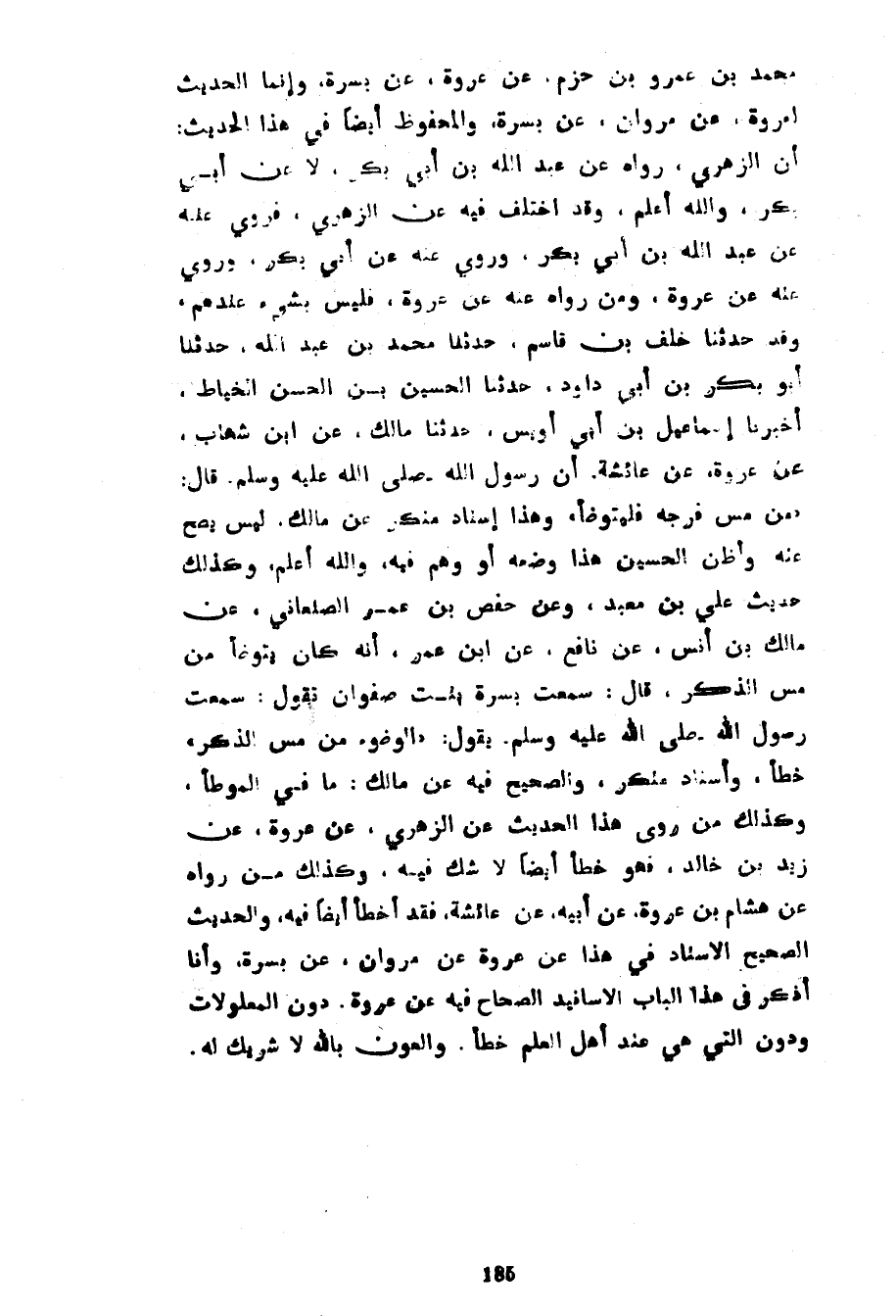 مُحَمَّدِ بْنِ عَمْرِو بْنِ حَزْمٍ عَنْ عُرْوَةَ عَنْ بُسْرَةَ وَإِنَّمَا الْحَدِيثُ لِعُرْوَةَ عَنْ مَرْوَانَ عَنْ بُسْرَةَ وَالْمَحْفُوظُ أَيْضًا فِي هَذَا الْحَدِيثِ أَنَّ الزُّهْرِيَّ رَوَاهُ عَنْ عَبْدِ اللَّهِ بْنِ أَبِي بَكْرٍ لَا عَنْ أَبِي بَكْرٍ وَاللَّهُ أَعْلَمُ وَقَدِ اخْتُلِفَ فِيهِ عَنِ الزُّهْرِيِّ فَرُوِيَ عَنْهُ عَنْ عَبْدِ اللَّهِ بْنِ أَبِي بَكْرٍ وَرُوِيَ عَنْهُ عَنْ أَبِي بَكْرٍ وَرُوِيَ عَنْهُ عَنْ عُرْوَةَ وَمَنْ رَوَاهُ عَنْهُ عَنْ عُرْوَةَ فَلَيْسَ بِشَيْءٍ عِنْدَهُمْ وَقَدْ حَدَّثَنَا خَلَفُ بْنُ قَاسِمٍ حَدَّثَنَا مُحَمَّدُ بْنُ عَبْدِ اللَّهِ حَدَّثَنَا أَبُو بَكْرِ بْنُ أَبِي دَاوُدَ حَدَّثَنَا الْحُسَيْنُ بْنُ الْحَسَنِ الْخَيَّاطُ أَخْبَرَنَا إِسْمَاعِيلُ بْنُ أَبِي أُوَيْسٍ حَدَّثَنَا مَالِكٌ عَنِ ابْنِ شِهَابٍ عَنْ عُرْوَةَ عَنْ عَائِشَةَ أَنَّ رسول اله صَلَّى اللَّهُ عَلَيْهِ وَسَلَّمَ قَالَ مَنْ مَسَّ فَرْجَهُ فَلْيَتَوَضَّأْ وَهَذَا إِسْنَادٌ مُنْكَرٌ عَنْ مَالِكٍ لَيْسَ يَصِحُّ عَنْهُ وَأَظُنُّ الْحُسَيْنَ هَذَا وَضَعَهُ أَوْ وَهِمَ فِيهِ وَاللَّهُ أَعْلَمُ وَكَذَلِكَ حَدِيثُ عَلِيِّ بْنِ مَعْبَدٍ وَعَنْ حَفْصِ بْنِ عُمَرَ الصَّنْعَانِيِّ عَنْ مَالِكِ بْنُ أَنَسٍ عَنْ نَافِعٍ عَنِ ابْنِ عُمَرَ أَنَّهُ كَانَ يَتَوَضَّأُ مِنْ مَسِّ الذَّكَرِ قَالَ سَمِعْتُ بُسْرَةَ بِنْتَ صَفْوَانَ تَقُولُ سَمِعْتُ رَسُولَ اللَّهِ صَلَّى اللَّهُ عَلَيْهِ وَسَلَّمَ يَقُولُ الْوُضُوءُ مِنْ مَسِّ الذَّكَرِ خَطَأٌ وإسناد مُنْكَرٌ وَالصَّحِيحُ فِيهِ عَنْ مَالِكٍ مَا فِي الْمُوَطَّأِ وَكَذَلِكَ مَنْ رَوَى هَذَا الْحَدِيثَ عَنِ الزُّهْرِيِّ عَنْ عُرْوَةَ عَنْ زَيْدِ بْنِ خَالِدٍ فَهُوَ خَطَأٌ أَيْضًا لَا شَكَّ فِيهِ وَكَذَلِكَ مَنْ رَوَاهُ عَنْ هِشَامِ بْنِ عُرْوَةَ عَنْ أَبِيهِ عَنْ عَائِشَةَ فَقَدْ أَخْطَأَ أَيْضًا فِيهِ وَالْحَدِيثُ الصَّحِيحُ الْإِسْنَادِ فِي هَذَا عَنْ عُرْوَةَ عَنْ مَرْوَانَ عَنْ بُسْرَةَ وَأَنَا أَذْكُرُ فِي هَذَا الْبَابِ الْأَسَانِيدَ الصِّحَاحَ فِيهِ عَنْ عُرْوَةَ دُونَ الْمَعْلُولَاتِ وَدُونَ الَّتِي هِيَ عِنْدَ أَهْلِ الْعِلْمِ خَطَأٌ وَالْعَوْنُ بِاللَّهِ لَا شَرِيكَ لَهُ