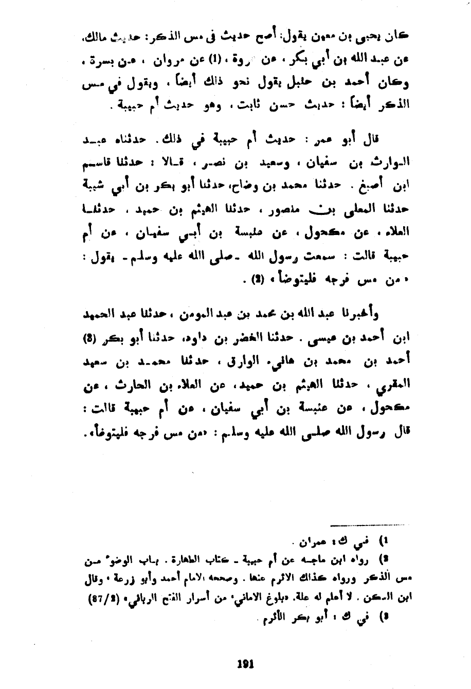 كَانَ يَحْيَى بْنُ مَعِينٍ يَقُولُ أَصَحُّ حَدِيثٍ فِي مَسِّ الذَّكَرِ حَدِيثُ مَالِكٌ عَنْ عَبْدِ اللَّهِ بْنِ أَبِي بَكْرٍ عَنْ عُرْوَةَ عَنْ مَرْوَانَ عَنْ بُسْرَةَ وَكَانَ أَحْمَدُ بْنُ حَنْبَلٍ يَقُولُ نَحْوَ ذَلِكَ أَيْضًا وَيَقُولُ فِي مَسِّ الذَّكَرِ أَيْضًا حَدِيثٌ حَسَنٌ ثَابِتٌ وَهُوَ حَدِيثُ أم حبيبة قال أبوعمر حَدِيثُ أُمِّ حَبِيبَةَ فِي ذَلِكَ حَدَّثَنَاهُ عَبْدُ الْوَارِثِ بْنُ سُفْيَانَ وَسَعِيدُ بْنُ نَصْرٍ قَالَا حَدَّثَنَا قَاسِمُ بْنُ أَصْبَغَ حَدَّثَنَا مُحَمَّدُ بْنُ وَضَّاحٍ حَدَّثَنَا أَبُو بَكْرِ بْنُ أَبِي شَيْبَةَ حَدَّثَنَا الْمُعَلَّى بْنُ مَنْصُورٍ حَدَّثَنَا الْهَيْثَمُ بْنُ حُمَيْدٍ حَدَّثَنَا الْعَلَاءُ عَنْ مَكْحُولٍ عَنْ عَنْبَسَةَ بْنِ أَبِي سُفْيَانَ عَنْ أُمِّ حَبِيبَةَ قَالَتْ سَمِعْتُ رَسُولَ اللَّهِ صَلَّى اللَّهُ عَلَيْهِ وسلم يَقُولُ مَنْ مَسَّ فَرْجَهُ فَلْيَتَوَضَّأْ وَأَخْبَرَنَا عَبْدُ اللَّهِ بْنُ مُحَمَّدِ بْنِ عَبْدِ الْمُؤْمِنِ حَدَّثَنَا عَبْدُ الْحَمِيدِ بْنُ أَحْمَدَ بْنِ عِيسَى حَدَّثَنَا الْخَضِرُ بْنُ دَاوُدَ حَدَّثَنَا أَبُو بَكْرٍ أَحْمَدُ بْنُ مُحَمَّدِ بْنِ هَانِئٍ الْوَارَّقُ حَدَّثَنَا مُحَمَّدُ بْنُ سَعِيدٍ الْمُقْرِيُّ حَدَّثَنَا الْهَيْثَمُ بْنُ حُمَيْدٍ عَنِ الْعَلَاءِ بْنِ الْحَارِثِ عَنْ مَكْحُولٍ عَنْ عَنْبَسَةَ بْنِ أَبِي سُفْيَانَ عَنْ أُمِّ حَبِيبَةَ قَالَتْ قَالَ رَسُولُ اللَّهِ صَلَّى اللَّهُ عَلَيْهِ وَسَلَّمَ مَنْ مَسَّ فَرْجَهُ فَلْيَتَوَضَّأْ