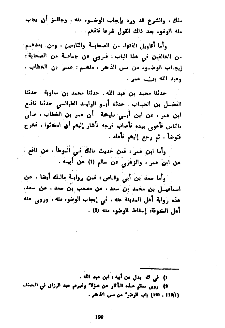 مِنْكَ وَالشَّرْعُ قَدْ وَرَدَ بِإِيجَابِ الْوُضُوءِ مِنْهُ وَجَائِزٌ أَنْ يَجِبَ مِنْهُ الْوُضُوءُ بَعْدَ ذَلِكَ الْقَوْلِ شَرْعًا فَتَفَهَّمْ وَأَمَّا أَقَاوِيلُ الْفُقَهَاءِ مِنَ الصَّحَابَةِ وَالتَّابِعِينَ وَمَنْ بَعْدَهُمْ مِنَ الْخَالِفِينَ فِي هَذَا الْبَابِ فَرُوِيَ عَنْ جَمَاعَةٍ مِنَ الصَّحَابَةِ إِيجَابُ الْوُضُوءِ مِنْ مَسِّ الذَّكَرِ مِنْهُمْ عُمَرُ بْنُ الْخَطَّابِ وَعَبْدُ اللَّهِ بْنُ عُمَرَ حَدَّثَنَا مُحَمَّدُ بْنُ عَبْدِ اللَّهِ حَدَّثَنَا مُحَمَّدُ بْنُ مُعَاوِيَةَ حَدَّثَنَا الْفَضْلُ بْنُ الْحُبَابِ حَدَّثَنَا أَبُو الْوَلِيدِ الطَّيَالِسِيُّ حَدَّثَنَا نَافِعُ بْنُ عُمَرَ عَنِ ابْنِ أَبِي مُلَيْكَةَ أَنَّ عُمَرَ بْنَ الْخَطَّابِ صَلَّى بِالنَّاسِ فَأَهْوَى بِيَدِهِ فَأَصَابَ فَرْجَهُ فَأَشَارَ إِلَيْهِمْ أَنْ امْكُثُوا فَخَرَجَ فَتَوَضَّأَ ثُمَّ رَجَعَ إِلَيْهِمْ فَأَعَادَ وَأَمَّا ابْنُ عُمَرَ فَمِنْ حَدِيثِ مَالِكٌ فِي الْمُوَطَّأِ عَنْ نَافِعٍ عَنِ ابْنِ عُمَرَ وَالزُّهْرِيُّ عَنْ سَالِمٍ عَنِ أَبِيهِ وَأَمَّا سَعْدُ بْنُ أَبِي وَقَّاصٍ فَمِنْ رِوَايَةِ مَالِكٍ أَيْضًا عَنْ إِسْمَاعِيلَ بْنِ مُحَمَّدِ بْنِ سَعْدٍ عَنْ مُصْعَبِ بْنِ سَعْدٍ عَنْ سَعْدٍ هَذِهِ رِوَايَةُ أَهْلِ الْمَدِينَةِ عَنْهُ فِي إِيجَابِ الْوُضُوءِ مِنْهُ وَرَوَى عَنْهُ أَهْلُ الْكُوفَةِ إِسْقَاطَ الْوُضُوءِ منه