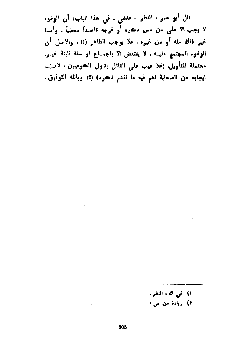 قَالَ أَبُو عُمَرَ النَّظَرُ عِنْدِي فِي هَذَا الباب أن االوضوء لَا يَجِبُ إِلَّا عَلَى مَنْ مَسَّ ذَكَرَهُ أَوْ فَرْجَهُ قَاصِدًا مُفْضِيًا وَأَمَّا غَيْرُ ذَلِكَ مِنْهُ أَوْ مِنْ غَيْرِهِ فَلَا يُوجِبُ الظَّاهِرَ والأصل أن الوضوء الجتمع عَلَيْهِ لَا يَنْتَقِضُ إِلَّا بِإِجْمَاعٍ أَوْ سُنَّةٍ ثَابِتَةٍ غَيْرِ مُحْتَمِلَةٍ لِلتَّأْوِيلِ (فَلَا عَيْبَ عَلَى القائل يقول الْكُوفِيِّينَ لِأَنَّ إِيجَابَهُ عَنِ الصَّحَابَةِ لَهُمْ فِيهِ ما تقدم ذكره) وبالله التوفيق