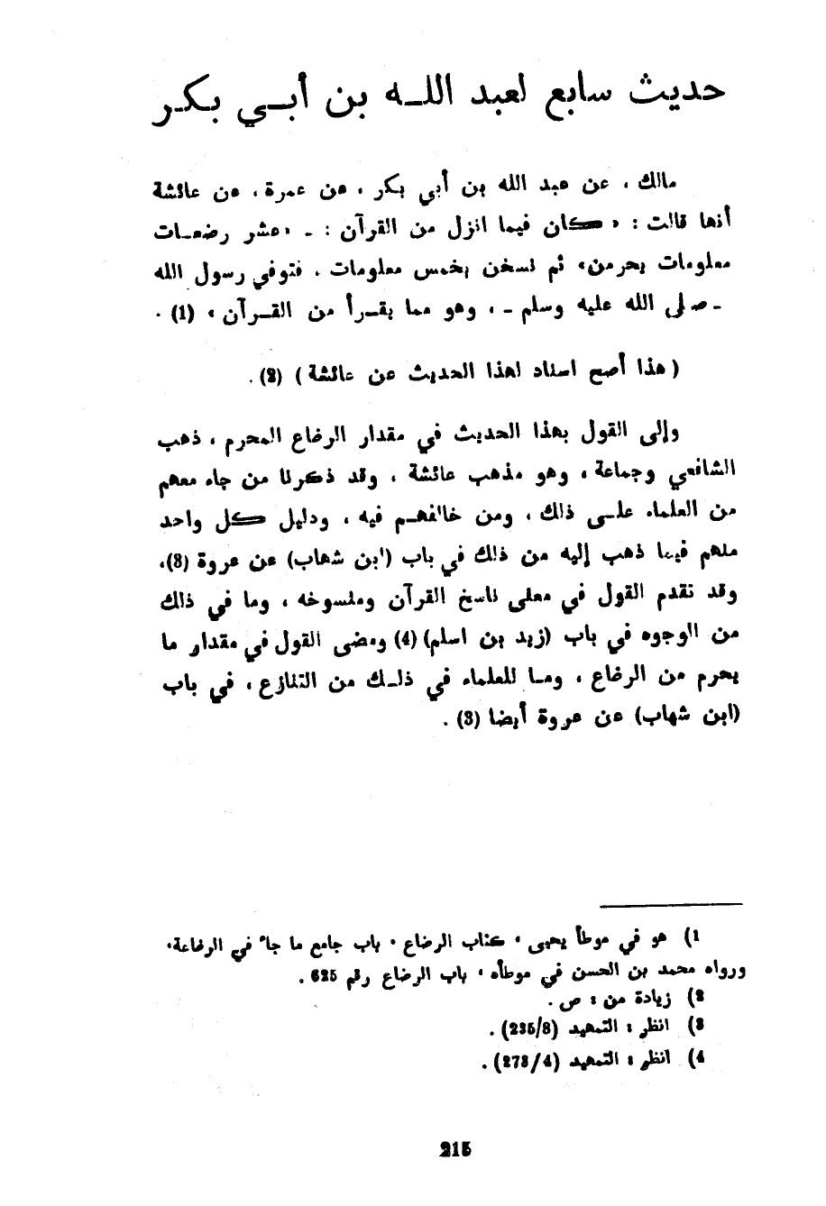 حَدِيثٌ سَابِعٌ لِعَبْدِ اللَّهِ بْنِ أَبِي بَكْرٍ مَالِكٌ عَنْ عَبْدِ اللَّهِ بْنِ أَبِي بَكْرٍ عَنْ عَمْرَةَ عَنْ عَائِشَةَ أَنَّهَا قَالَتْ كَانَ فِيمَا أُنْزِلَ مِنَ الْقُرْآنِ عَشْرَ رَضَعَاتٍ مَعْلُومَاتٍ يُحَرِّمْنَ ثُمَّ نُسِخْنَ بِخَمْسٍ مَعْلُومَاتٍ فَتُوُفِّي رَسُولُ اللَّهِ صَلَّى اللَّهُ عَلَيْهِ وَسَلَّمَ وَهُوَ مِمَّا يُقْرَأُ مِنَ الْقُرْآنِ (هَذَا أَصَحُّ إِسْنَادٍ لِهَذَا الْحَدِيثِ عَنْ عَائِشَةَ) وَإِلَى الْقَوْلِ بِهَذَا الْحَدِيثِ فِي مِقْدَارِ الرَّضَاعِ الْمُحَرِّمِ ذَهَبَ الشَّافِعِيُّ وَجَمَاعَةٌ وَهُوَ مَذْهَبُ عَائِشَةَ وَقَدْ ذَكَرْنَا مَنْ جَاءَ معهم من العلماء ذَلِكَ وَمَنْ خَالَفَهُمْ فِيهِ وَدَلِيلُ كُلِّ وَاحِدٍ مِنْهُمْ فِيمَا ذَهَبَ إِلَيْهِ مِنْ ذَلِكَ فِي بَابِ (ابْنِ شِهَابٍ) عَنْ عُرْوَةَ وَقَدْ تَقَدَّمَ الْقَوْلُ فِي مَعْنَى نَاسِخِ الْقُرْآنِ وَمَنْسُوخِهِ وَمَا فِي ذَلِكَ مِنَ الْوُجُوهِ فِي بَابِ (زَيْدِ بْنِ أَسْلَمَ) وَمَضَى الْقَوْلُ فِي مِقْدَارِ مَا يُحَرِّمُ مِنَ الرَّضَاعِ وَمَا لِلْعُلَمَاءِ فِي ذَلِكَ مِنَ التَّنَازُعِ فِي بَابِ (ابْنِ شِهَابٍ) عَنِ عروة أيضا