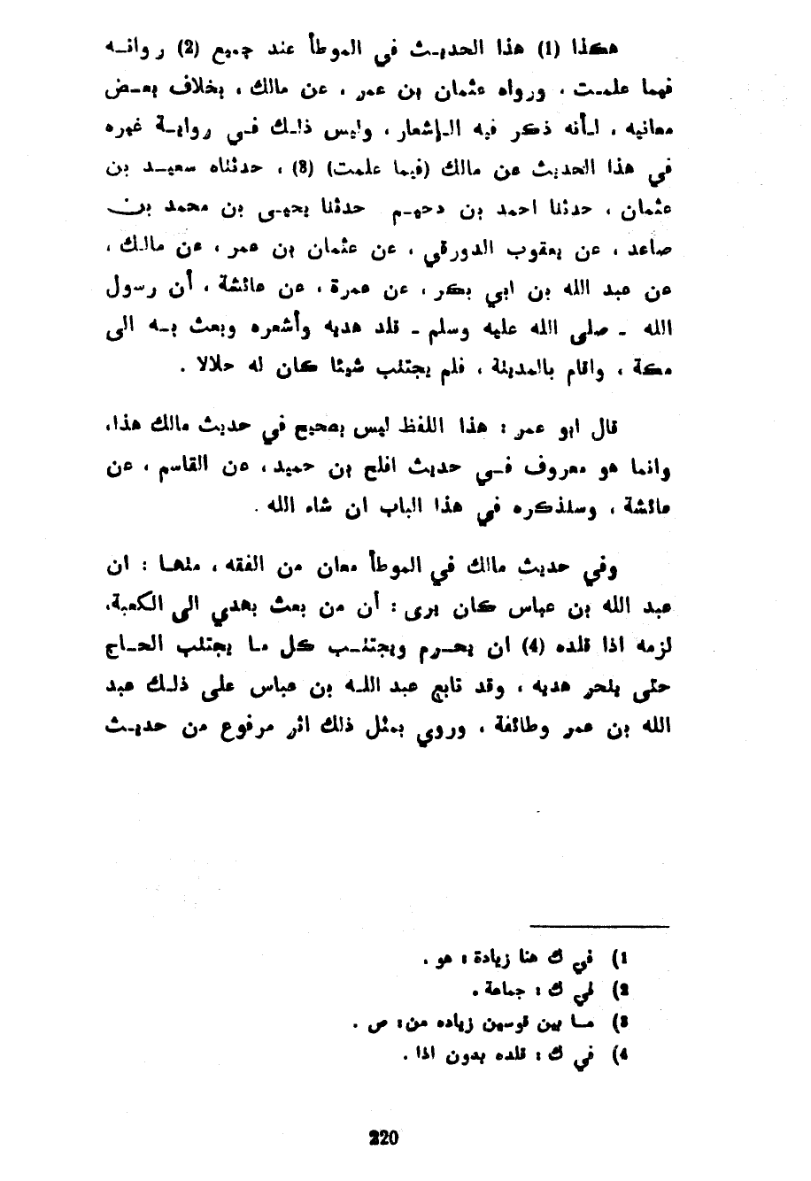هَكَذَا هَذَا الْحَدِيثُ فِي الْمُوَطَّأِ عِنْدَ جَمِيعِ رُوَاتِهِ فِيمَا عَلِمْتُ وَرَوَاهُ عُثْمَانُ بْنُ عُمَرَ عَنْ مَالِكٍ بِخِلَافِ بَعْضِ مَعَانِيهِ لِأَنَّهُ ذَكَرَ فِيهِ الْإِشْعَارَ وَلَيْسَ ذَلِكَ فِي رِوَايَةِ غَيْرِهِ فِي هَذَا الْحَدِيثِ عَنْ مَالِكٍ (فِيمَا عَلِمْتُ) حَدَّثَنَاهُ سَعِيدُ بْنُ عُثْمَانَ حَدَّثَنَا أَحْمَدُ بْنُ دُحَيْمٍ حَدَّثَنَا يَحْيَى بْنُ مُحَمَّدِ بْنِ صَاعِدٍ عَنْ يَعْقُوبَ الدَّوْرَقِيِّ عَنْ عُثْمَانَ بْنِ عُمَرَ عَنْ مَالِكٌ عَنْ عَبْدِ اللَّهِ بْنِ أَبِي بَكْرٍ عَنْ عَمْرَةَ عَنْ عَائِشَةَ أَنَّ رَسُولَ اللَّهِ صَلَّى اللَّهُ عَلَيْهِ وَسَلَّمَ قَلَّدَ هَدْيَهُ وَأَشْعَرَهُ وَبَعَثَ بِهِ إِلَى مَكَّةَ وَأَقَامَ بِالْمَدِينَةِ فَلَمْ يَجْتَنِبْ شَيْئًا كَانَ لَهُ حَلَالًا قَالَ أَبُو عُمَرَ هَذَا اللَّفْظُ لَيْسَ بِصَحِيحٍ فِي حَدِيثِ مَالِكٍ هَذَا وَإِنَّمَا هُوَ مَعْرُوفٌ فِي حَدِيثِ أَفْلَحُ بْنُ حُمَيْدٍ عَنِ الْقَاسِمِ عَنْ عَائِشَةَ وَسَنَذْكُرُهُ فِي هَذَا الْبَابِ إِنْ شَاءَ اللَّهُ وَفِي حَدِيثِ مَالِكٍ فِي الْمُوَطَّأِ مَعَانٍ مِنَ الْفِقْهِ مِنْهَا أَنَّ عَبْدَ اللَّهِ بْنَ عَبَّاسٍ كَانَ يَرَى أَنَّ مَنْ بَعَثَ بِهَدْيٍ إِلَى الْكَعْبَةِ لَزِمَهُ إِذَا قَلَّدَهُ أَنْ يُحْرِمَ وَيَجْتَنِبَ كُلَّ مَا يَجْتَنِبُ الْحَاجُّ حَتَّى يَنْحَرَ هَدْيَهُ وَقَدْ تَابَعَ عَبْدَ اللَّهِ بْنَ عَبَّاسٍ عَلَى ذَلِكَ عَبْدُ اللَّهِ بْنُ عُمَرَ وَطَائِفَةٌ وَرُوِيَ بِمِثْلِ ذَلِكَ أَثَرٌ مَرْفُوعٌ مِنْ حَدِيثِ