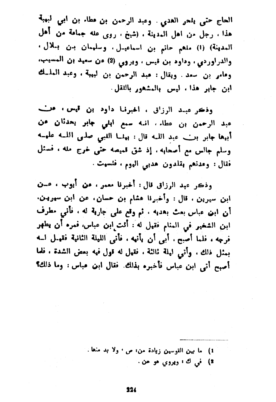 الْحَاجِّ حَتَّى يَنْحَرَ الْهَدْيَ وَعَبْدُ الرَّحْمَنِ بْنُ عَطَاءِ بْنِ أَبِي لَبِيبَةَ هَذَا رَجُلٌ مِنْ أَهْلِ الْمَدِينَةِ (شَيْخٌ رَوَى عَنْهُ جَمَاعَةٌ مِنْ أَهْلِ الْمَدِينَةِ) مِنْهُمْ حَاتِمُ بْنُ إِسْمَاعِيلَ وَسُلَيْمَانُ بْنُ بِلَالٍ وَالدَّرَاوَرْدِيُّ وَدَاوُدُ بْنُ قَيْسٍ وَيَرْوِي عَنْ سَعِيدِ بْنِ الْمُسَيَّبِ وَعَامِرِ بْنِ سَعْدٍ وَيُقَالُ عَبْدُ الرَّحْمَنِ بْنُ لَبِيبَةَ وَعَبْدُ الْمَلِكِ بْنُ جَابِرٍ هَذَا لَيْسَ بِالْمَشْهُورِ بِالنَّقْلِ وَذَكَرَ عَبْدُ الرَّزَّاقِ أَخْبَرَنَا دَاوُدَ بْنِ قَيْسٍ عَنْ عَبْدِ الرَّحْمَنِ بْنِ عَطَاءٍ أَنَّهُ سَمِعَ ابْنَيْ جَابِرٍ يُحَدِّثَانِ عَنْ أَبِيهِمَا جَابِرِ بْنِ عَبْدِ اللَّهِ قَالَ بَيْنَا النَّبِيُّ صَلَّى اللَّهُ عَلَيْهِ وَسَلَّمَ جَالِسٌ مَعَ أَصْحَابِهِ إِذْ شَقَّ قَمِيصَهُ حَتَّى خَرَجَ مِنْهُ فَسُئِلَ فَقَالَ وَعَدْتُهُمْ يُقَلِّدُونَ هَدْيِي الْيَوْمَ فَنَسِيتُ وَذَكَرَ عَبْدُ الرَّزَّاقِ قَالَ أَخْبَرَنَا مَعْمَرٌ عَنِ أَيُّوبَ عَنِ ابْنِ سِيرِينَ قَالَ وَأَخْبَرَنَا هِشَامُ بْنُ حَسَّانَ عَنِ ابْنِ سِيرِينَ أَنَّ ابْنَ عَبَّاسٍ بَعَثَ بِهَدْيِهِ ثُمَّ وَقَعَ عَلَى جَارِيَةٍ لَهُ فَأَتَى مُطَرِّفَ بْنَ الشِّخِّيرِ فِي الْمَنَامِ فَقِيلَ لَهُ ائْتِ ابْنَ عَبَّاسٍ فَمُرْهُ أَنْ يُطَهِّرَ فَرْجَهُ فَلَمَّا أَصْبَحَ أَبَى أَنْ يَأْتِيَهُ فَأَتَى اللَّيْلَةَ الثَّانِيَةَ فَقِيلَ لَهُ بِمِثْلِ ذَلِكَ وَأَتَى لَيْلَةً ثَالِثَةً فَقِيلَ لَهُ قَوْلٌ فِيهِ بَعْضُ الشِّدَّةِ فَلَمَّا أَصْبَحَ أَتَى ابْنَ عَبَّاسٍ فَأَخْبَرَهُ بِذَلِكَ فَقَالَ ابْنُ عَبَّاسٍ وَمَا ذَلِكَ