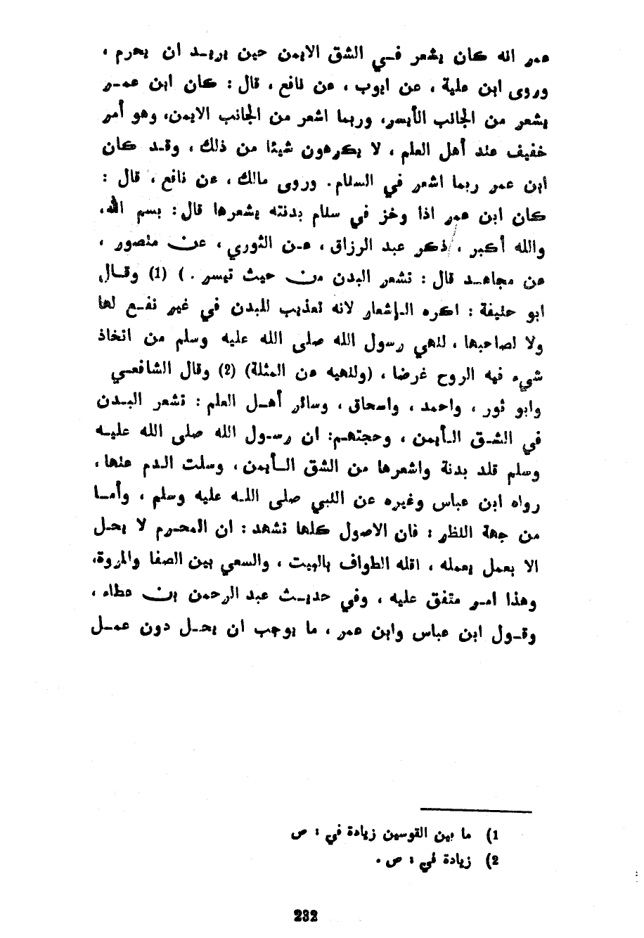 عُمَرَ أَنَّهُ كَانَ يُشْعِرُ فِي الشِّقِّ الْأَيْمَنِ حِينَ يُرِيدُ أَنْ يُحْرِمَ وَرَوَى ابْنُ عُلَيَّةَ عَنْ أَيُّوبُ عَنْ نَافِعٍ قَالَ كَانَ ابْنُ عُمَرَ يُشْعِرُ مِنَ الْجَانِبِ الْأَيْسَرِ وَرُبَّمَا أَشْعَرَ مِنَ الْجَانِبِ الْأَيْمَنِ وَهُوَ أَمْرٌ خَفِيفٌ عِنْدَ أَهْلِ الْعِلْمِ لَا يَكْرَهُونَ شَيْئًا مِنْ ذَلِكَ وَقَدْ كَانَ ابْنُ عُمَرَ رُبَّمَا أَشْعَرَ فِي السَّنَامِ وَرَوَى مَالِكٌ عَنْ نَافِعٍ قَالَ كَانَ ابْنُ عُمَرَ إِذَا وَخَزَ فِي سَنَامِ بَدَنَتِهِ يُشْعِرُهَا قَالَ بِسْمِ اللَّهِ وَاللَّهُ أَكْبَرُ ذَكَرَ عَبْدُ الرَّزَّاقِ عَنِ الثَّوْرِيِّ عَنْ مَنْصُورٍ عَنْ مُجَاهِدٍ قَالَ تُشْعَرُ الْبُدْنُ مِنْ حَيْثُ تَيَسَّرَ) وَقَالَ أَبُو حَنِيفَةَ أَكْرَهُ الْإِشْعَارَ لِأَنَّهُ تَعْذِيبٌ لِلْبُدْنِ فِي غَيْرِ نَفْعٍ لَهَا وَلَا لِصَاحِبِهَا لِنَهْيِ رَسُولِ اللَّهِ صَلَّى اللَّهُ عَلَيْهِ وَسَلَّمَ من اتِّخَاذِ شَيْءٍ فِيهِ الرُّوحُ غَرَضًا (وَلِنَهْيِهِ عَنِ الْمُثْلَةِ) وَقَالَ الشَّافِعِيُّ وَأَبُو ثَوْرٍ وَأَحْمَدُ وَإِسْحَاقُ وَسَائِرُ أَهْلِ الْعِلْمِ تُشْعَرُ الْبُدْنُ فِي الشِّقِّ الأيمن وحجتهم أن رسول اله صَلَّى اللَّهُ عَلَيْهِ وَسَلَّمَ قَلَّدَ بَدَنَةً وَأَشْعَرَهَا مِنَ الشِّقِّ الْأَيْمَنِ وَسَلَتَ الدَّمَ عَنْهَا رَوَاهُ ابْنُ عَبَّاسٍ وَغَيْرُهُ عَنِ النَّبِيِّ صَلَّى اللَّهُ عَلَيْهِ وَسَلَّمَ وَأَمَّا مِنْ جِهَةِ النَّظَرِ فَإِنَّ الْأُصُولَ كُلَّهَا تَشْهَدُ أَنَّ الْمُحْرِمَ لَا يَحِلُّ إِلَّا بِعَمَلٍ يَعْمَلُهُ أَقَلُّهُ الطَّوَافُ بِالْبَيْتِ وَالسَّعْيُ بَيْنَ الصَّفَا وَالْمَرْوَةِ وَهَذَا أَمْرٌ مُتَّفَقٌ عَلَيْهِ وَفِي حَدِيثِ عَبْدِ الرَّحْمَنِ بْنِ عَطَاءٍ وَقَوْلِ ابْنِ عَبَّاسٍ وَابْنِ عُمَرَ مَا يُوجِبُ أَنْ يَحِلَّ دُونَ عَمَلٍ