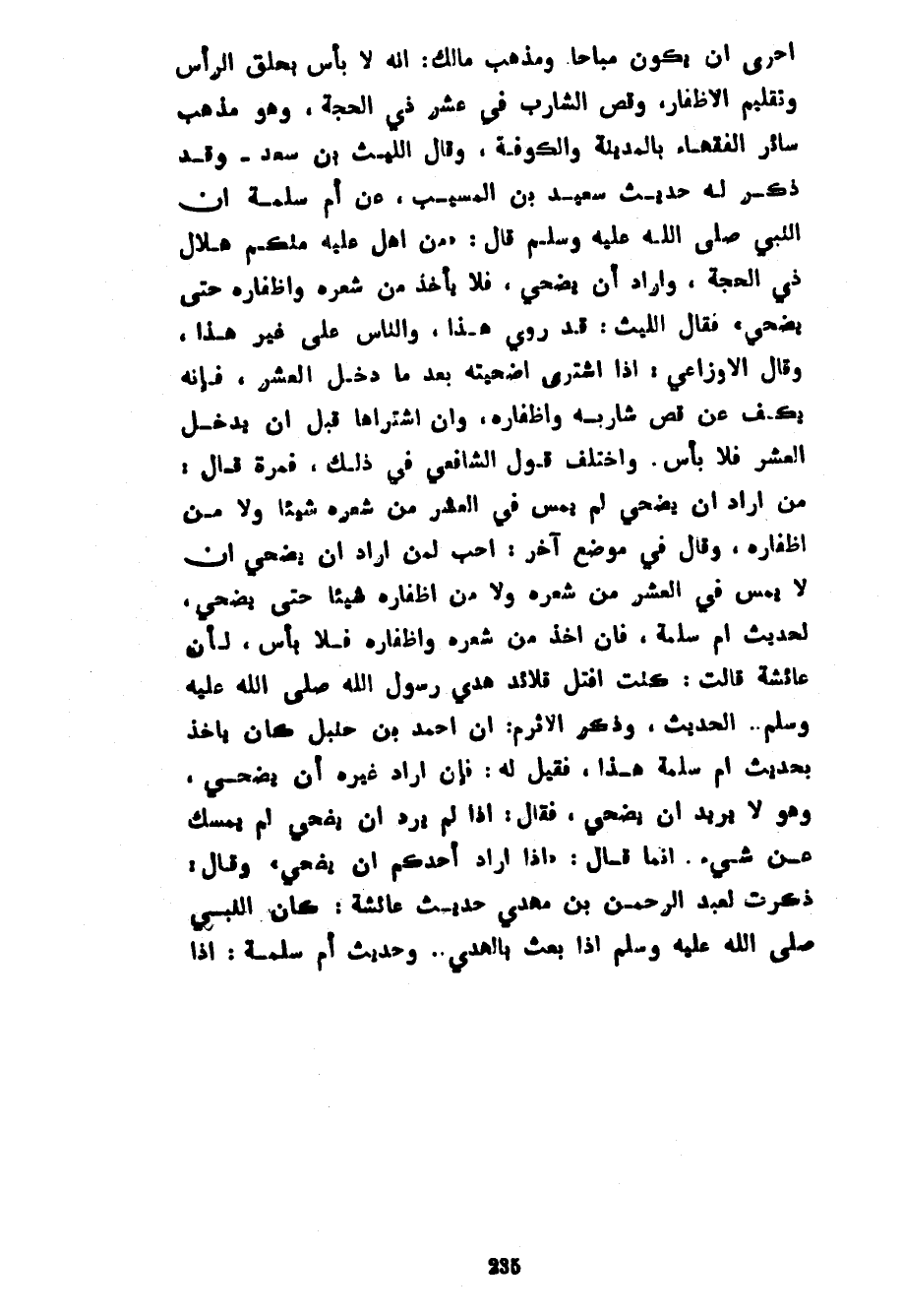 أَحْرَى أَنْ يَكُونَ مُبَاحًا وَمَذْهَبُ مَالِكٍ أَنَّهُ لَا بَأْسَ بِحَلْقِ الرَّأْسِ وَتَقْلِيمِ الْأَظْفَارِ وَقَصِّ الشَّارِبِ فِي عَشْرِ ذِي الْحِجَّةِ وَهُوَ مَذْهَبُ سَائِرِ الْفُقَهَاءِ بِالْمَدِينَةِ وَالْكُوفَةِ وَقَالَ اللَّيْثُ بْنُ سَعْدٍ وَقَدْ ذُكِرَ لَهُ حَدِيثُ سَعِيدِ بْنِ الْمُسَيَّبِ عَنْ أُمِّ سَلَمَةَ أَنَّ النَّبِيَّ صَلَّى اللَّهُ عَلَيْهِ وَسَلَّمَ قَالَ مَنْ أَهَلَّ عَلَيْهِ مِنْكُمْ هِلَالُ ذِي الْحِجَّةِ وَأَرَادَ أَنْ يُضَحِّيَ فَلَا يَأْخُذْ مِنْ شَعْرِهِ وَأَظْفَارِهِ حَتَّى يُضَحِّيَ فَقَالَ اللَّيْثُ قَدْ رُوِيَ هَذَا وَالنَّاسُ عَلَى غير هذا وقال الأوزاعي إذا اشترى أضحتيه بَعْدَ مَا دَخَلَ الْعَشْرُ فَإِنَّهُ يَكُفُّ عَنْ قَصِّ شَارِبِهِ وَأَظْفَارِهِ وَإِنِ اشْتَرَاهَا قَبْلَ أَنْ يَدْخُلَ الْعَشْرُ فَلَا بَأْسَ وَاخْتَلَفَ قَوْلُ الشَّافِعِيِّ فِي ذَلِكَ فَمَرَّةً قَالَ مَنْ أَرَادَ أَنْ يُضَحِّيَ لَمْ يَمَسَّ فِي الْعَشْرِ مِنْ شَعَرِهِ شَيْئًا وَلَا مِنْ أَظْفَارِهِ وَقَالَ فِي مَوْضِعٍ آخَرَ أُحِبُّ لِمَنْ أَرَادَ أَنْ يُضَحِّيَ أَنْ لَا يَمَسَّ فِي الْعَشْرِ مِنْ شَعَرِهِ وَلَا مِنْ أَظْفَارِهِ شَيْئًا حَتَّى يُضَحِّيَ لِحَدِيثِ أُمِّ سَلَمَةَ فَإِنْ أَخَذَ مِنْ شَعْرِهِ وَأَظْفَارِهِ فَلَا بأس لأن عائشة قالت كنت أفلت قَلَائِدَ هَدْيِ رَسُولِ اللَّهِ صَلَّى اللَّهُ عَلَيْهِ وَسَلَّمَ الْحَدِيثَ وَذَكَرَ الْأَثْرَمُ أَنَّ أَحْمَدَ بْنَ حَنْبَلٍ كَانَ يَأْخُذُ بِحَدِيثِ أُمِّ سَلَمَةَ هَذَا فَقِيلَ لَهُ فَإِنْ أَرَادَ غَيْرُهُ أَنْ يُضَحِّيَ وَهُوَ لَا يُرِيدُ أَنْ يُضَحِّيَ فَقَالَ إِذَا لَمْ يُرِدْ أَنْ يُضَحِّيَ لَمْ يُمْسِكْ عَنْ شَيْءٍ إِنَّمَا قَالَ إِذَا أَرَادَ أَحَدُكُمْ أَنْ يُضَحِّيَ وَقَالَ ذَكَرْتُ لِعَبْدِ الرَّحْمَنِ بْنِ مَهْدِيٍّ حَدِيثَ عَائِشَةَ كَانَ النَّبِيُّ صَلَّى اللَّهُ عَلَيْهِ وَسَلَّمَ إِذَا بَعَثَ بِالْهَدْيِ وَحَدِيثَ أُمِّ سَلَمَةَ إذا