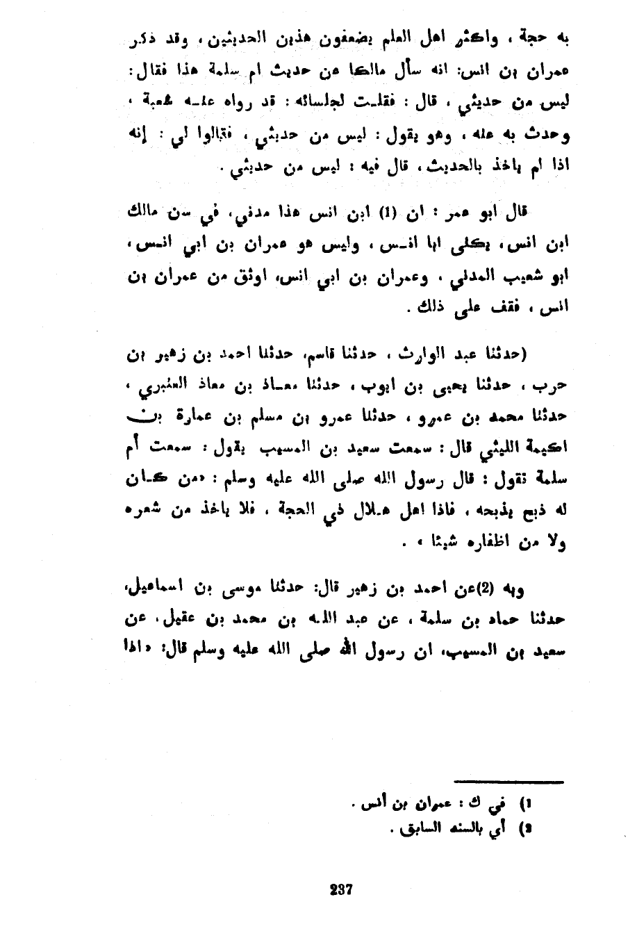 بِهِ حُجَّةٌ وَأَكْثَرُ أَهْلِ الْعِلْمِ يُضَعِّفُونَ هَذَيْنِ الْحَدِيثَيْنِ وَقَدْ ذَكَرَ عِمْرَانُ بْنُ أَنَسٍ أَنَّهُ سَأَلَ مَالِكًا عَنْ حَدِيثِ أُمِّ سَلَمَةَ هَذَا فَقَالَ لَيْسَ مِنْ حَدِيثِي قَالَ فَقُلْتُ لِجُلَسَائِهِ قَدْ رَوَاهُ عَنْهُ شُعْبَةُ وَحَدَّثَ بِهِ عَنْهُ وَهُوَ يَقُولُ لَيْسَ مِنْ حَدِيثِي فَقَالُوا لِي إِنَّهُ إِذَا لَمْ يَأْخُذْ بِالْحَدِيثِ قَالَ فِيهِ لَيْسَ مِنْ حَدِيثِي قَالَ أَبُو عُمَرَ إِنَّ ابْنَ أَنَسٍ هَذَا مَدَنِيٌّ فِي سِنِّ مَالِكِ بْنِ أَنَسٍ يُكَنَّى أَبَا أَنَسٍ وَلَيْسَ هُوَ عمران بن ابي أنس أبو شُعَيْبٍ الْمَدَنِيَّ وَعِمْرَانُ بْنُ أَبِي أَنَسٍ أَوْثَقُ مِنْ عِمْرَانَ بْنِ أَنَسٍ فَقِفْ عَلَى ذَلِكَ (حَدَّثَنَا عَبْدُ الْوَارِثِ حَدَّثَنَا قَاسِمٌ حَدَّثَنَا أَحْمَدُ بْنُ زُهَيْرِ بْنِ حَرْبٍ حَدَّثَنَا يَحْيَى بْنُ أَيُّوبَ حَدَّثَنَا مُعَاذُ بْنُ مُعَاذٍ الْعَنْبَرِيُّ حَدَّثَنَا مُحَمَّدُ بْنُ عَمْرٍو حَدَّثَنَا عَمْرُو بْنُ مُسْلِمِ بْنِ عُمَارَةَ بْنِ أُكَيْمَةَ اللِّيثِيُّ قَالَ سَمِعْتُ سعيد بن المسيب يقول سمعت أم سلمةتقول قَالَ رَسُولُ اللَّهِ صَلَّى اللَّهُ عَلَيْهِ وَسَلَّمَ مَنْ كَانَ لَهُ ذَبْحٌ يَذْبَحُهُ فَإِذَا أَهَلَّ هِلَالُ ذِي الْحِجَّةِ فَلَا يَأْخُذُ مِنْ شَعْرِهِ وَلَا مِنْ أَظْفَارِهِ شَيْئًا وَبِهِ (2) عَنْ أَحْمَدُ بْنُ زُهَيْرٍ قَالَ حَدَّثَنَا مُوسَى بْنُ إسماعيل حَدَّثَنَا حَمَّادُ بْنُ سَلَمَةَ عَنْ عَبْدِ اللَّهِ بْنِ مُحَمَّدِ بْنِ عَقِيلٍ عَنْ سَعِيدِ بْنِ الْمُسَيَّبِ أَنَّ رَسُولَ اللَّهِ صَلَّى اللَّهُ عَلَيْهِ وَسَلَّمَ قَالَ إِذَا