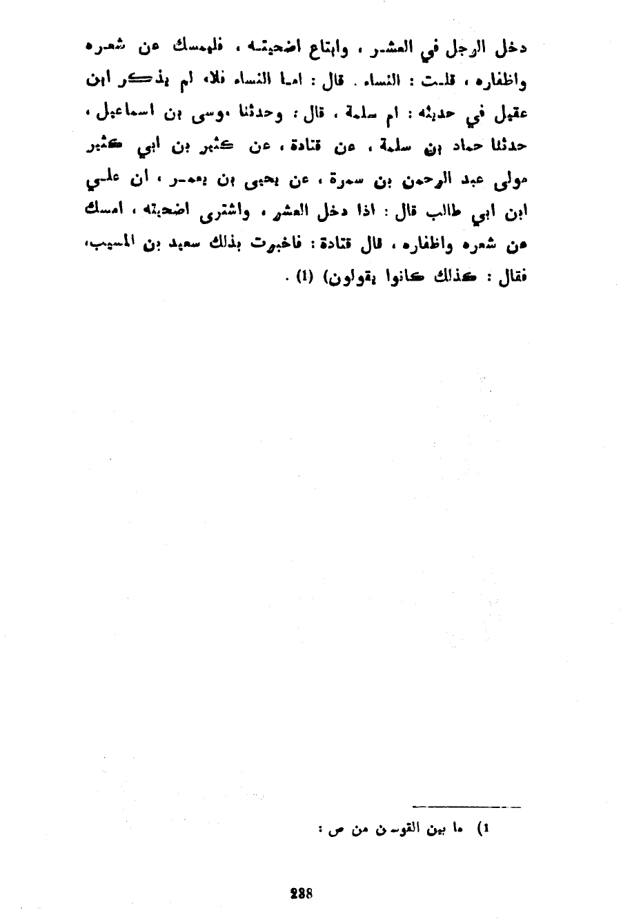 دَخَلَ الرَّجُلُ فِي الْعَشْرِ وَابْتَاعَ أُضْحِيَتَهُ فَلْيُمْسِكْ عَنْ شَعْرِهِ وَأَظْفَارِهِ قُلْتُ النِّسَاءُ قَالَ أَمَّا النِّسَاءُ فَلَا لَمْ يَذْكُرِ ابْنُ عَقِيلٍ فِي حَدِيثِهِ أُمَّ سَلَمَةَ قَالَ وَحَدَّثَنَا مُوسَى بْنُ إِسْمَاعِيلَ حَدَّثَنَا حَمَّادُ بْنُ سَلَمَةَ عَنْ قَتَادَةَ عَنِ كَثِيرِ بْنِ أَبِي كَثِيرٍ مَوْلَى عَبْدِ الرَّحْمَنِ بْنِ سَمُرَةَ عَنْ يَحْيَى بْنِ يَعْمُرَ أَنَّ عَلِيَّ بْنَ أَبِي طَالِبٍ قَالَ إِذَا دَخَلَ الْعَشْرُ وَاشْتَرَى أُضْحِيَتَهُ أَمْسَكَ عَنْ شَعْرِهِ وَأَظْفَارِهِ قَالَ قَتَادَةُ فَأَخْبَرْتُ بِذَلِكَ سَعِيدَ بْنَ الْمُسَيَّبِ فَقَالَ كَذَلِكَ كَانُوا يَقُولُونَ)