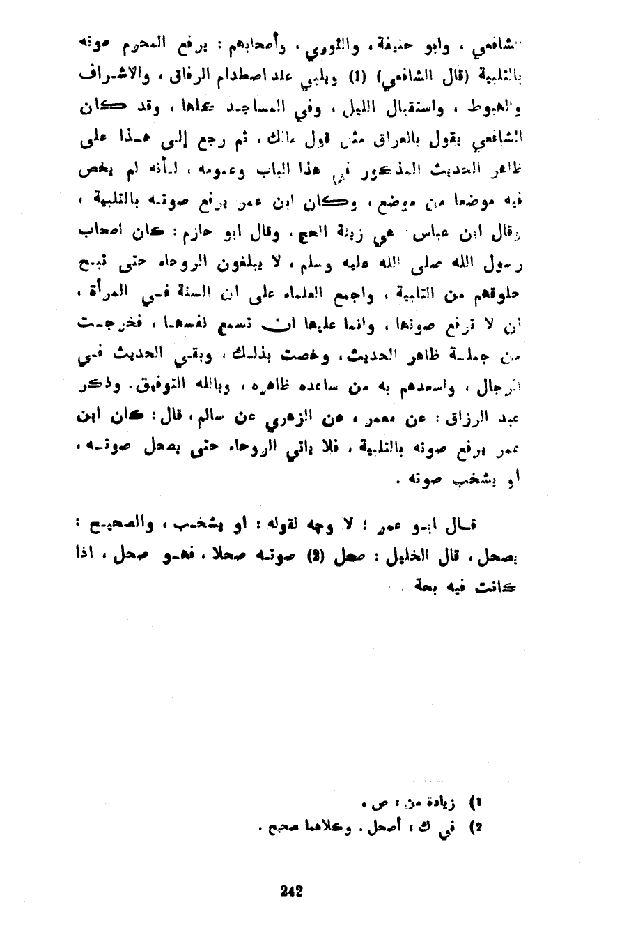 الشَّافِعِيُّ وَأَبُو حَنِيفَةَ وَالثَّوْرِيُّ وَأَصْحَابُهُمْ يَرْفَعُ الْمُحْرِمُ صَوْتَهُ بِالتَّلْبِيَةِ (قَالَ الشَّافِعِيُّ) وَيُلَبِّي عِنْدَ اصْطِدَامِ الرِّفَاقِ وَالْإِشْرَافِ وَالْهُبُوطِ وَاسْتِقْبَالِ اللَّيْلِ وَفِي الْمَسَاجِدِ كُلِّهَا وَقَدْ كَانَ الشَّافِعِيُّ يَقُولُ بِالْعِرَاقِ مِثْلَ قَوْلِ مَالِكٍ ثُمَّ رَجَعَ إِلَى هَذَا عَلَى ظَاهِرِ الْحَدِيثِ الْمَذْكُورِ فِي هَذَا الْبَابِ وَعُمُومِهِ لِأَنَّهُ لَمْ يَخُصَّ فِيهِ مَوْضِعًا مِنْ مَوْضِعٍ وَكَانَ ابْنُ عُمَرَ يَرْفَعُ صَوْتَهُ بِالتَّلْبِيَةِ وَقَالَ ابْنُ عَبَّاسٍ هِيَ زِينَةُ الْحَجِّ وَقَالَ أَبُو حَازِمٍ كَانَ أَصْحَابُ رَسُولِ اللَّهِ صَلَّى اللَّهُ عَلَيْهِ وَسَلَّمَ لَا يَبْلُغُونَ الرَّوْحَاءَ حَتَّى تُبَحَّ حُلُوقُهُمْ مِنَ التَّلْبِيَةِ وَأَجْمَعَ الْعُلَمَاءُ عَلَى أَنَّ السُّنَّةَ فِي الْمَرْأَةِ أَنْ لَا تَرْفَعَ صَوْتَهَا وَإِنَّمَا عَلَيْهَا أَنْ تُسْمِعَ نَفْسَهَا فَخَرَجَتْ مِنْ جُمْلَةِ ظَاهِرِ الْحَدِيثِ وَخُصَّتْ بِذَلِكَ وَبَقِيَ الْحَدِيثُ فِي الرِّجَالِ وَأَسْعَدُهُمْ بِهِ مِنْ سَاعَدَهُ ظَاهِرُهُ وَبِاللَّهِ التَّوْفِيقُ وَذَكَرَ عَبْدُ الرَّزَّاقِ عَنْ مَعْمَرٍ عَنِ الزُّهْرِيِّ عَنْ سَالِمٍ قَالَ كَانَ ابْنُ عُمَرَ يَرْفَعُ صَوْتَهُ بِالتَّلْبِيَةِ فَلَا يَأْتِي الرَّوْحَاءَ حَتَّى يَصْحَلَ صَوْتُهُ أَوْ يَشْخَبَ صَوْتُهُ قَالَ أَبُو عُمَرَ لَا وَجْهَ لِقَوْلِهِ أَوْ يَشْخَبُ وَالصَّحِيحُ يَصْحَلُ قَالَ الْخَلِيلُ صَحِلَ صَوْتُهُ صَحَلًا فَهُوَ صَحِلٌ إِذَا كَانَتْ فِيهِ بَحَّةٌ