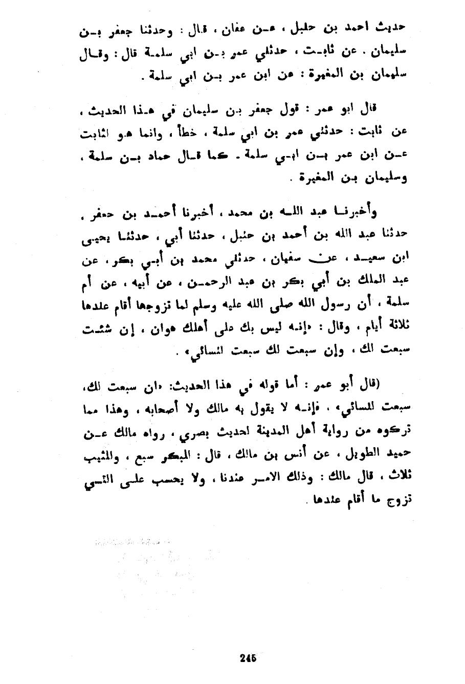 حَدِيثِ أَحْمَدَ بْنِ حَنْبَلٍ عَنْ عَفَّانَ قَالَ وَحَدَّثَنَا جَعْفَرُ بْنُ سُلَيْمَانَ عَنْ ثَابِتٍ حَدَّثَنِي عُمَرُ بْنُ أَبِي سَلَمَةَ قَالَ وَقَالَ سُلَيْمَانُ بْنُ الْمُغِيرَةِ عَنِ ابْنِ عُمَرَ بْنِ أَبِي سلمة قال أبوعمر قَوْلُ جَعْفَرِ بْنِ سُلَيْمَانَ فِي هَذَا الْحَدِيثِ عَنْ ثَابِتٍ حَدَّثَنِي عُمَرُ بْنُ أَبِي سَلَمَةَ خَطَأٌ وَإِنَّمَا هُوَ لِثَابِتٍ عَنِ ابْنِ عُمَرَ بْنِ أَبِي سَلَمَةَ كَمَا قَالَ حَمَّادُ بْنُ سَلَمَةَ وَسُلَيْمَانُ بْنُ الْمُغِيرَةِ وَأَخْبَرَنَا عَبْدُ اللَّهِ بْنُ مُحَمَّدٍ أَخْبَرَنَا أَحْمَدُ بْنُ جَعْفَرٍ حَدَّثَنَا عَبْدُ اللَّهِ بْنُ أَحْمَدَ بْنِ حَنْبَلٍ حَدَّثَنَا أَبِي حَدَّثَنَا يَحْيَى بْنُ سَعِيدٍ عَنْ سُفْيَانَ حَدَّثَنِي مُحَمَّدُ بْنُ أَبِي بَكْرٍ عَنْ عَبْدِ الْمَلِكِ بْنِ أَبِي بَكْرِ بْنِ عَبْدِ الرَّحْمَنِ عَنْ أَبِيهِ عَنْ أُمِّ سَلَمَةَ أَنَّ رَسُولَ اللَّهِ صَلَّى اللَّهُ عَلَيْهِ وَسَلَّمَ لَمَّا تَزَوَّجَهَا أَقَامَ عِنْدَهَا ثَلَاثَةَ أَيَّامٍ وَقَالَ إِنَّهُ لَيْسَ بِكِ عَلَى أَهْلِكِ هَوَانٌ إِنْ شِئْتِ سَبَّعْتُ لَكِ وَإِنْ سَبَّعْتُ لَكِ سَبَّعْتُ لِنِسَائِي (قَالَ أَبُو عُمَرَ أَمَّا قَوْلُهُ فِي هَذَا الْحَدِيثِ إِنْ سَبَّعْتُ لَكِ سَبَّعْتُ لِنِسَائِي فَإِنَّهُ لَا يَقُولُ بِهِ مَالِكٌ وَلَا أَصْحَابُهُ وَهَذَا مِمَّا تَرَكُوهُ مِنْ رِوَايَةِ أَهْلِ الْمَدِينَةِ لِحَدِيثٍ بَصْرِيٍّ رَوَاهُ مَالِكٌ عَنْ حُمَيْدٍ الطَّوِيلِ عَنْ أَنَسِ بْنِ مَالِكٍ قَالَ لِلْبِكْرِ سَبْعٌ وَلِلثَّيِّبِ ثَلَاثٌ قَالَ مَالِكٌ وَذَلِكَ الْأَمْرُ عِنْدَنَا وَلَا يُحْسَبُ عَلَى الَّتِي تَزَوَّجَ مَا أَقَامَ عِنْدَهَا