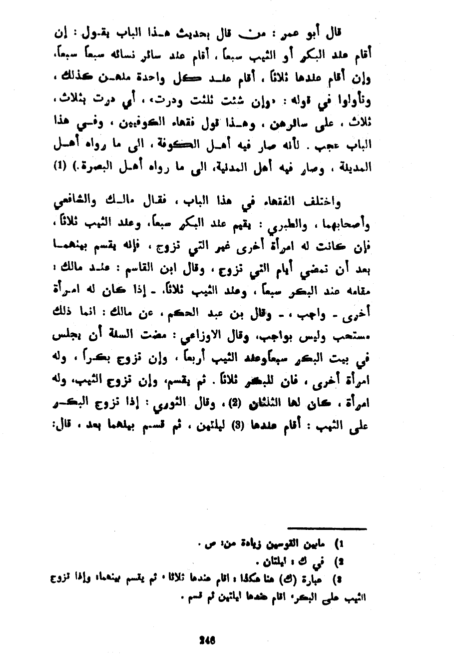 قَالَ أَبُو عُمَرَ مَنْ قَالَ بِحَدِيثِ هَذَا الْبَابِ يَقُولُ إِنْ أَقَامَ عِنْدَ الْبِكْرِ أَوِ الثَّيِّبِ سَبْعًا أَقَامَ عِنْدَ سَائِرِ نِسَائِهِ سَبْعًا سَبْعًا وَإِنْ أَقَامَ عِنْدَهَا ثَلَاثًا أَقَامَ عِنْدَ كُلِّ وَاحِدَةٍ مِنْهُنَّ كَذَلِكَ وَتَأَوَّلُوا فِي قَوْلِهِ وَإِنْ شِئْتِ ثَلَّثْتُ وَدُرْتُ أَيْ دُرْتُ بِثَلَاثٍ ثَلَاثٍ عَلَى سَائِرِهِنَّ وَهَذَا قَوْلُ فُقَهَاءِ الْكُوفِيِّينَ وَفِي هَذَا الْبَابِ عَجَبٌ لِأَنَّهُ صَارَ فِيهِ أَهْلُ الْكُوفَةِ إِلَى مَا رَوَاهُ أَهْلُ الْمَدِينَةِ وصار فيه أهل المدنية إِلَى مَا رَوَاهُ أَهْلُ الْبَصْرَةِ) وَاخْتَلَفَ الْفُقَهَاءُ فِي هَذَا الْبَابِ فَقَالَ مَالِكٌ وَالشَّافِعِيُّ وَأَصْحَابُهُمَا وَالطَّبَرِيُّ يُقِيمُ عِنْدَ الْبِكْرِ سَبْعًا وَعِنْدَ الثَّيِّبِ ثَلَاثًا فَإِنْ كَانَتْ لَهُ امْرَأَةٌ أُخْرَى غَيْرَ الَّتِي تَزَوَّجَ فَإِنَّهُ يَقْسِمُ بَيْنَهُمَا بَعْدَ أَنْ تَمْضِيَ أَيَّامُ الَّتِي تَزَوَّجَ وَقَالَ ابْنُ الْقَاسِمِ عِنْدَ مَالِكٍ مَقَامُهُ عِنْدَ الْبِكْرِ سَبْعًا وَعِنْدَ الثَّيِّبِ ثَلَاثًا إِذَا كَانَ لَهُ امْرَأَةٌ أُخْرَى وَاجِبٌ وَقَالَ ابْنُ عَبْدِ الْحَكَمِ عَنْ مَالِكٍ إِنَّمَا ذَلِكَ مُسْتَحَبٌّ وَلَيْسَ بِوَاجِبٍ وَقَالَ الْأَوْزَاعِيُّ مَضَتِ السُّنَّةُ أَنْ يَجْلِسَ فِي بَيْتِ الْبِكْرِ سَبْعًا وَعِنْدَ الثَّيِّبِ أَرْبَعًا وَإِنْ تَزَوَّجَ بِكْرًا وَلَهُ امْرَأَةٌ أُخْرَى فَإِنَّ لِلْبِكْرِ ثَلَاثًا ثُمَّ يَقْسِمُ وَإِنْ تَزَوَّجَ الثَّيِّبَ وَلَهُ امْرَأَةٌ كَانَ لَهَا الثُّلُثَانِ وَقَالَ الثَّوْرِيُّ إِذَا تَزَوَّجَ الْبِكْرَ عَلَى الثَّيِّبِ أَقَامَ عِنْدَهَا لَيْلَتَيْنِ ثُمَّ قَسَمَ بَيْنَهُمَا بَعْدُ قَالَ