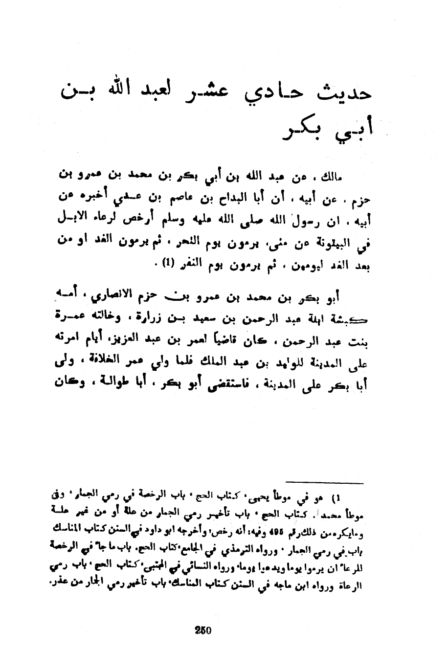 حَدِيثٌ حَادِيَ عَشَرَ لِعَبْدِ اللَّهِ بْنِ أَبِي بَكْرٍ مَالِكٌ عَنْ عَبْدِ اللَّهِ بْنِ أَبِي بَكْرٍ بْنِ مُحَمَّدِ بْنِ عَمْرِو بْنِ حَزْمٍ عَنْ أَبِيهِ أَنَّ أَبَا الْبَدَّاحِ بْنَ عَاصِمِ بْنِ عَدِيٍّ أَخْبَرَهُ عَنْ أَبِيهِ أَنَّ رَسُولَ اللَّهِ صَلَّى اللَّهُ عَلَيْهِ وَسَلَّمَ أَرْخَصَ لِرِعَاءِ الْإِبِلِ فِي الْبَيْتُوتَةِ عَنْ مَنًى يَرْمُونَ يَوْمَ النَّحْرِ ثُمَّ يَرْمُونَ الْغَدَ أَوْ مِنْ بَعْدِ الْغَدِ لِيَوْمَيْنِ ثُمَّ يَرْمُونَ يَوْمَ النَّفْرِ أَبُو بَكْرِ بْنِ مُحَمَّدِ بْنِ عَمْرِو بْنِ حَزْمٍ الْأَنْصَارِيُّ أُمُّهُ كَبْشَةُ ابْنَةُ عَبْدِ الرَّحْمَنِ بْنِ سَعِيدِ بْنِ زُرَارَةَ وَخَالَتُهُ عَمْرَةُ بِنْتُ عَبْدِ الرَّحْمَنِ كَانَ قَاضِيًا لِعُمَرَ بْنِ عَبْدِ الْعَزِيزِ أَيَّامَ إِمْرَتِهِ عَلَى الْمَدِينَةِ لِلْوَلِيدِ بْنِ عَبْدِ الْمَلِكِ فَلَمَّا وَلِيَ عُمَرُ الْخِلَافَةَ وَلَّى أَبَا بَكْرٍ عَلَى الْمَدِينَةِ فَاسْتَقْضَى أَبُو بَكْرٍ أَبَا طوالة وكان