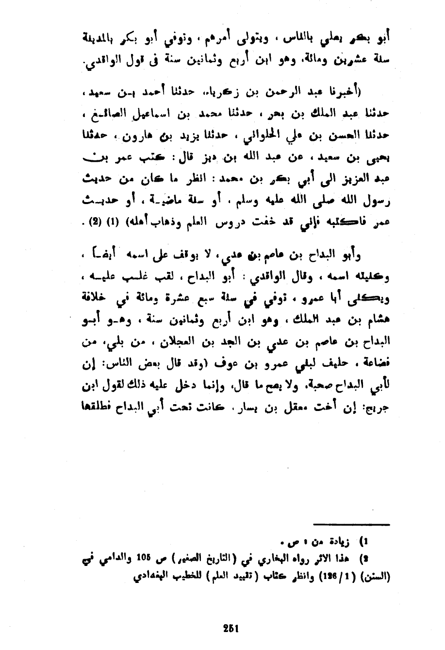 أَبُو بَكْرٍ يُصَلِّي بِالنَّاسِ وَيَتَوَلَّى أَمْرَهُمْ وَتُوُفِّيَ أبو بكر بالمدينة سنة عشرين ومائة وهوابن أَرْبَعٍ وَثَمَانِينَ سَنَةً فِي قَوْلِ الْوَاقِدِيِّ (أَخْبَرَنَا عَبْدُ الرَّحْمَنِ بْنُ زَكَرِيَّاءَ حَدَّثَنَا أَحْمَدُ بْنُ سَعِيدٍ حَدَّثَنَا عَبْدُ الْمَلِكِ بْنُ بَحْرٍ حَدَّثَنَا مُحَمَّدُ بْنُ إِسْمَاعِيلَ الصَّائِغُ حَدَّثَنَا الْحَسَنُ بْنُ عَلِيٍّ الْحُلْوَانِيُّ حَدَّثَنَا يَزِيدُ بْنُ هَارُونَ حَدَّثَنَا يَحْيَى بْنُ سَعِيدٍ عَنْ عَبْدِ اللَّهِ بْنِ دَيْزٍ قَالَ كَتَبَ عُمَرُ بْنُ عَبْدِ الْعَزِيزِ إِلَى أَبِي بَكْرِ بْنِ مُحَمَّدٍ انْظُرْ مَا كَانَ مِنْ حَدِيثِ رَسُولِ اللَّهِ صَلَّى اللَّهُ عَلَيْهِ وَسَلَّمَ أَوْ سُنَّةٍ مَاضِيَةٍ أَوْ حَدِيثِ عُمَرَ فَاكْتُبْهُ فَإِنِّي قَدْ خِفْتُ دُرُوسَ الْعِلْمِ وَذَهَابَ أَهْلِهِ) وَأَبُو الْبَدَّاحِ بْنُ عَاصِمِ بْنِ عَدِيٍّ لَا يُوقَفُ عَلَى اسْمِهِ أَيْضًا وَكُنْيَتُهُ اسْمُهُ وَقَالَ الْوَاقِدِيُّ أَبُو الْبَدَّاحِ لَقَبٌ غَلَبَ عَلَيْهِ وَيُكَنَّى أَبَا عَمْرٍو تُوُفِّيَ فِي سَنَةِ سبع عشرةومائة فِي خِلَافَةِ هِشَامِ بْنِ عَبْدِ الْمَلِكِ وَهُوَ ابْنُ أَرْبَعٍ وَثَمَانِينَ سَنَةً وَهُوَ أَبُو الْبَدَّاحِ بْنُ عَاصِمِ بْنِ عَدِيِّ بْنِ الْجِدِّ بْنِ العجلان من بلي من فضاعة حَلِيفٌ لِبَنِي عَمْرِو بْنِ عَوْفٍ (وَقَدْ قَالَ بَعْضُ النَّاسِ إِنَّ لِأَبِي الْبَدَّاحِ صُحْبَةً وَلَا يَصِحُّ مَا قَالَ وَإِنَّمَا دَخَلَ عَلَيْهِ ذَلِكَ لِقَوْلِ ابْنِ جُرَيْجٍ إِنَّ أُخْتَ مَعْقِلِ بْنِ يَسَارٍ كَانَتْ تَحْتَ أَبِي الْبَدَّاحِ فَطَلَّقَهَا