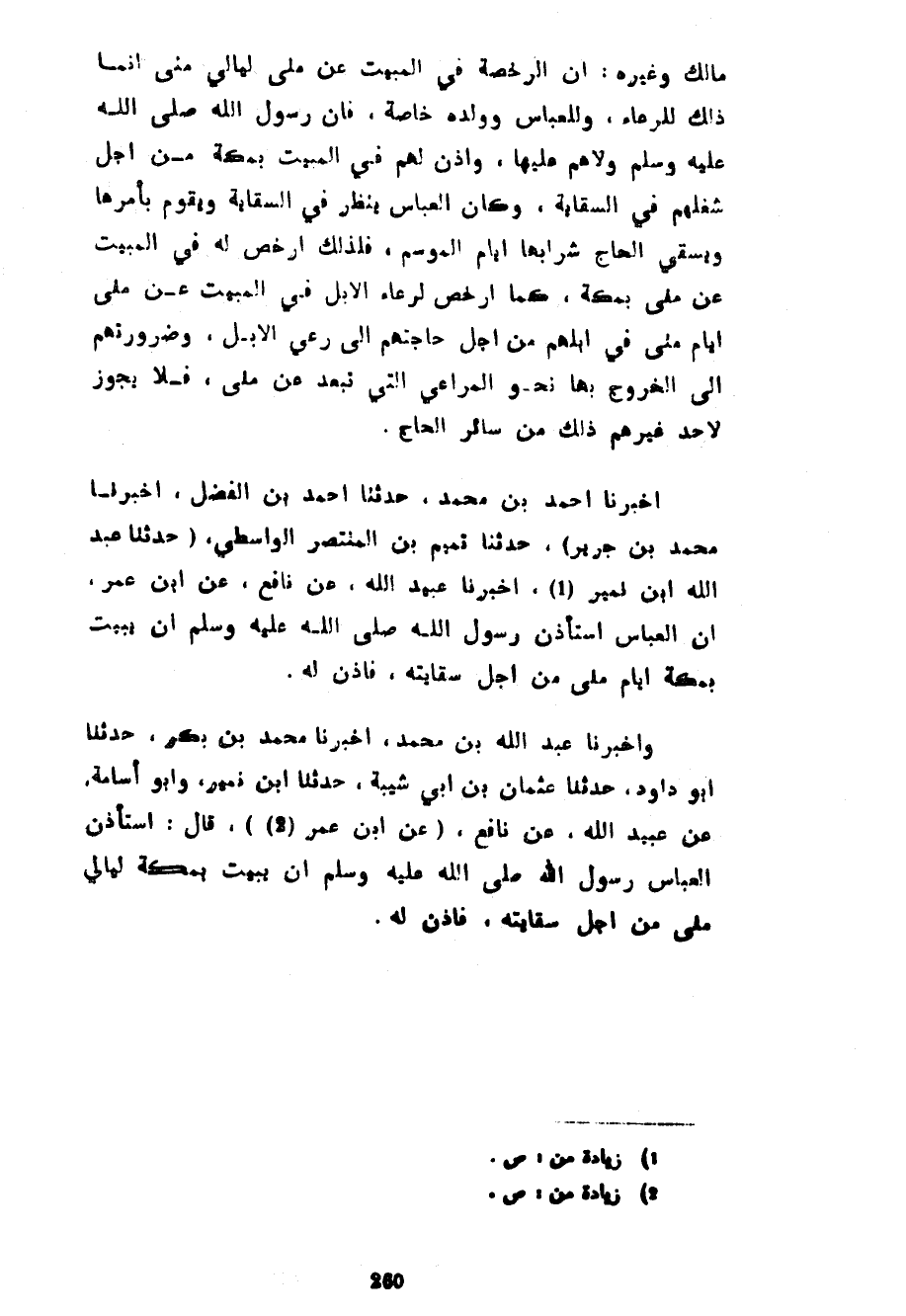 مَالِكٌ وَغَيْرُهُ أَنَّ الرُّخْصَةَ فِي الْمَبِيتِ عَنْ مِنًى لَيَالِيَ مِنًى إِنَّمَا ذَلِكَ لِلرِّعَاءِ وَلِلْعَبَّاسِ وَوَلَدِهِ خَاصَّةً فَإِنَّ رَسُولَ اللَّهِ صَلَّى اللَّهُ عَلَيْهِ وَسَلَّمَ وَلَّاهُمْ عَلَيْهَا وَأَذِنَ لَهُمْ فِي الْمَبِيتِ بِمَكَّةَ مِنْ أَجْلِ شُغْلِهِمْ فِي السِّقَايَةِ وَكَانَ الْعَبَّاسُ يَنْظُرُ فِي السِّقَايَةِ وَيَقُومُ بِأَمْرِهَا وَيَسْقِي الْحَاجَّ شَرَابَهَا أَيَّامَ الْمَوْسِمِ فَلِذَلِكَ أُرْخِصَ لَهُ فِي الْمَبِيتِ عَنْ مِنًى بِمَكَّةَ كَمَا أُرْخِصَ لِرِعَاءِ الْإِبِلِ فِي الْمَبِيتِ عَنْ مِنًى أَيَّامَ مِنًى فِي إِبِلِهِمْ مِنْ أَجْلِ حَاجَتِهِمْ إِلَى رَعْيِ الْإِبِلِ وَضَرُورَتِهِمْ إِلَى الْخُرُوجِ بِهَا نَحْوَ الْمَرَاعِي الَّتِي تَبْعُدُ عَنْ مِنًى فَلَا يَجُوزُ لِأَحَدٍ غَيْرِهِمْ ذَلِكَ مِنْ سَائِرِ الْحَاجِّ أَخْبَرَنَا أَحْمَدُ بْنُ مُحَمَّدٍ حَدَّثَنَا أَحْمَدُ بْنُ الْفَضْلِ أَخْبَرَنَا مُحَمَّدُ بْنُ جَرِيرٍ) حَدَّثَنَا تَمِيمُ بْنُ الْمُنْتَصِرِ الْوَاسِطِيُّ (حَدَّثَنَا عَبْدُ اللَّهِ بْنُ نُمَيْرٍ (1) أَخْبَرَنَا عُبَيْدُ اللَّهِ عَنْ نَافِعٍ عَنِ ابْنِ عُمَرَ أَنَّ الْعَبَّاسَ اسْتَأْذَنَ رَسُولَ اللَّهِ صَلَّى اللَّهُ عَلَيْهِ وَسَلَّمَ أَنْ يَبِيتَ بِمَكَّةَ أَيَّامَ مِنًى مِنْ أَجْلِ سِقَايَتِهِ فَأَذِنَ لَهُ وَأَخْبَرَنَا عَبْدُ اللَّهِ بْنُ مُحَمَّدٍ أَخْبَرَنَا مُحَمَّدُ بْنُ بَكْرٍ حَدَّثَنَا أَبُو دَاوُدَ حَدَّثَنَا عُثْمَانُ بن أبي شيبة حدثنا ابن نمير وأبوأسامة عَنْ عُبَيْدُ اللَّهِ عَنْ نَافِعٍ (عَنِ ابْنِ عُمَرَ (2) قَالَ اسْتَأْذَنَ الْعَبَّاسُ رَسُولَ اللَّهِ صَلَّى اللَّهُ عَلَيْهِ وَسَلَّمَ أَنْ يَبِيتَ بِمَكَّةَ لَيَالِيَ مِنًى مِنْ أَجْلِ سِقَايَتِهِ فَأَذِنَ لَهُ