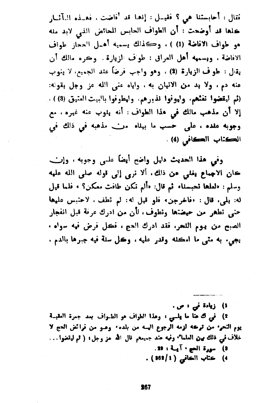 فَقَالَ أَحَابِسَتُنَا هِيَ فَقِيلَ إِنَّهَا قَدْ أَفَاضَتْ فَهَذِهِ الْآثَارُ كُلُّهَا قَدْ أَوْضَحَتْ أَنَّ الطَّوَافَ الْحَابِسَ لِلْحَائِضِ الَّذِي لَا بُدَّ مِنْهُ هُوَ طَوَافُ الْإِفَاضَةِ) وَكَذَلِكَ يُسَمِّيهِ أَهْلُ الْحِجَازِ طَوَافَ الْإِفَاضَةِ وَيُسَمِّيهِ أَهْلُ الْعِرَاقِ طَوَافَ الزِّيَارَةِ وَكَرِهَ مَالِكٌ أَنْ يُقَالَ طَوَافُ الزِّيَارَةِ وَهُوَ وَاجِبٌ فَرْضًا عِنْدَ الْجَمِيعِ لَا يَنُوبُ عَنْهُ دَمٌ وَلَا بُدَّ مِنَ الْإِتْيَانِ بِهِ وَإِيَّاهُ عَنَى اللَّهُ عَزَّ وَجَلَّ بِقَوْلِهِ ثُمَّ لْيَقْضُوا تَفَثَهُمْ وَلْيُوفُوا نُذُورَهُمْ وَلْيَطَّوَّفُوا بِالْبَيْتِ الْعَتِيقِ إِلَّا أَنَّ مَذْهَبَ مَالِكٍ فِي هَذَا الطَّوَافِ أَنَّهُ يَنُوبُ عَنْهُ غَيْرُهُ مَعَ وُجُوبِهِ عِنْدَهُ عَلَى حَسَبِ مَا بَيَّنَاهُ مِنْ مَذْهَبِهِ فِي ذَلِكَ فِي الْكِتَابِ الْكَافِي وَفِي هَذَا الْحَدِيثِ دَلِيلٌ وَاضِحٌ أَيْضًا عَلَى وُجُوبِهِ وَإِنْ كَانَ الْإِجْمَاعُ يُغْنِي عَنْ ذَلِكَ أَلَا تَرَى إِلَى قَوْلِهِ صَلَّى اللَّهُ عَلَيْهِ وَسَلَّمَ لَعَلَّهَا تَحْبِسُنَا ثُمَّ قَالَ أَلَمْ تَكُنْ طَافَتْ مَعَكُنَّ فَلَمَّا قِيلَ لَهُ بَلَى قَالَ فَاخْرُجْنَ فَلَوْ قِيلَ لَهُ لَمْ تَطُفْ لَاحْتَبَسَ عَلَيْهَا حَتَّى تَطْهُرَ مِنْ حَيْضَتِهَا وَتَطُوفَ لِأَنَّ مَنْ أَدْرَكَ عَرَفَةَ قَبْلَ انْفِجَارِ الصُّبْحِ مِنْ يَوْمِ النَّحْرِ فَقَدْ أَدْرَكَ الْحَجَّ فَكُلُّ فَرْضٍ فِيهِ سِوَاهُ يَجِيءُ بِهِ مَتَى مَا أَمْكَنَهُ وَقَدَرَ عَلَيْهِ وَكُلُّ سُنَّةٍ فِيهِ جبرها بالدم