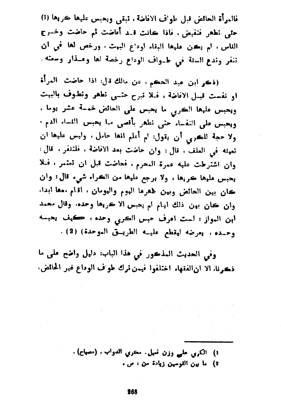 فَالْمَرْأَةُ الْحَائِضُ قَبْلَ طَوَافِ الْإِفَاضَةِ تَبْقَى وَيُحْبَسُ عَلَيْهَا كَرِيُّهَا حَتَّى تَطْهُرَ فَتَفِيضَ فَإِذَا كَانَتْ قَدْ أَفَاضَتْ ثُمَّ حَاضَتْ وَخَرَجَ النَّاسُ لَمْ يَكُنْ عَلَيْهَا الْبَقَاءُ لِوَدَاعِ الْبَيْتِ وَرُخِّصَ لَهَا فِي أَنْ تَنْفِرَ وَتَدَعَ السُّنَّةَ فِي طَوَافِ الوداع رخصة لها وعذار وَسَعَتُهُ (ذَكَرَ ابْنُ عَبْدِ الْحَكَمِ عَنْ مَالِكٍ قَالَ إِذَا حَاضَتِ الْمَرْأَةُ أَوْ نَفَسَتْ قَبْلَ الْإِفَاضَةِ فَلَا تَبْرَحُ حَتَّى تَطْهُرَ وَتَطُوفَ بِالْبَيْتِ وَيُحْبَسُ عَلَيْهَا الْكَرِيُّ مَا يَحْبِسُ عَلَى الْحَائِضِ خَمْسَةَ عَشَرَ يَوْمًا وَيَحْبِسُ عَلَى النُّفَسَاءِ حَتَّى تَطْهُرَ بِأَقْصَى مَا يَحْبِسُ النِّسَاءَ الدَّمُ وَلَا حُجَّةَ لِلْكَرِيِّ أَنْ يَقُولَ لَمْ أَعْلَمْ أَنَّهَا حَامِلٌ وَلَيْسَ عَلَيْهَا أَنْ تُعِيِنَهُ فِي الْعَلَفِ قَالَ وَإِنْ حَاضَتْ بَعْدَ الْإِفَاضَةِ فَلْتَنْفِرْ قَالَ وَإِنِ اشْتَرَطَتْ عَلَيْهِ عُمْرَةَ الْمُحْرِمِ فَحَاضَتْ قَبْلَ أَنْ تَعْتَمِرَ فَلَا يُحْبَسُ عَلَيْهَا كَرِيُّهَا وَلَا يرجع عليها من الكراء شَيْءٌ قَالَ وَإِنْ كَانَ بَيْنَ الْحَائِضِ وَبَيْنَ طُهْرِهَا الْيَوْمُ وَالْيَوْمَانِ أَقَامَ مَعَهَا أَبَدًا وَإِنْ كَانَ بَيْنَ ذَلِكَ أَيَّامٌ لَمْ يُحْبَسْ إِلَّا كَرِيُّهَا وَحْدَهُ وَقَالَ مُحَمَّدُ بْنُ الْمَوَّازِ لَسْتُ أَعْرِفُ حَبْسَ الْكَرِيِّ وَحْدَهُ كَيْفَ يَحْبِسُهُ وَحْدَهُ يُعَرِّضُهُ لِيُقْطَعَ عَلَيْهِ الطَّرِيقُ الْمُوَحَّدَةُ) وَفِي الْحَدِيثِ الْمَذْكُورِ فِي هَذَا الْبَابِ دَلِيلٌ وَاضِحٌ عَلَى مَا ذَكَرْنَا إِلَّا أَنَّ الْفُقَهَاءَ اخْتَلَفُوا فِيمَنْ تَرَكَ طَوَافَ الْوَدَاعِ غَيْرَ الْحَائِضِ
