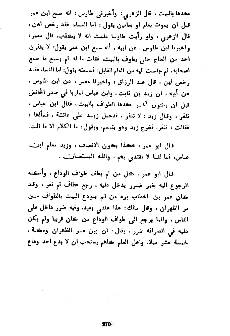 عَهْدِهَا بِالْبَيْتِ قَالَ الزُّهْرِيُّ وَأَخْبَرَنِي طَاوُسٌ أَنَّهُ سَمِعَ ابْنَ عُمَرَ قَبْلَ أَنْ يَمُوتَ بِعَامٍ أَوْ بِعَامَيْنِ يَقُولُ أَمَّا النِّسَاءُ فَقَدْ رُخِّصَ لَهُنَّ قَالَ الزُّهْرِيُّ وَلَوْ رَأَيْتُ طَاوُسًا عَلِمْتُ أَنَّهُ لَا يَكْذِبُ قَالَ مَعْمَرٌ وَأَخْبَرَنَا ابْنُ طَاوُسٍ عَنْ أَبِيهِ أَنَّهُ سَمِعَ ابْنَ عُمَرَ يَقُولُ لَا يَنْفِرَنَّ أَحَدٌ مِنَ الْحَاجِّ حَتَّى يَطُوفَ بِالْبَيْتِ فَقُلْتُ مَا لَهُ لَمْ يَسْمَعْ مَا سَمِعَ أَصْحَابُهُ ثُمَّ جَلَسْتُ إِلَيْهِ مِنَ الْعَامِ الْقَابِلِ فَسَمِعْتُهُ يَقُولُ أَمَّا النِّسَاءُ فَقَدْ رُخِّصَ لَهُنَّ قَالَ عَبْدُ الرَّزَّاقِ وَأَخْبَرَنَا مَعْمَرٌ عَنِ ابْنِ طَاوُسٍ عَنْ أَبِيهِ أَنَّ زَيْدَ بْنَ ثَابِتٍ وَابْنَ عَبَّاسٍ تَمَارَيَا فِي صَدَرِ الْحَائِضِ قَبْلَ أَنْ يَكُونَ آخِرُ عَهْدِهَا الطَّوَافَ بِالْبَيْتِ فَقَالَ ابْنُ عَبَّاسٍ تَنْفِرُ وَقَالَ زَيْدٌ لَا تَنْفِرُ فَدَخَلَ زَيْدٌ عَلَى عَائِشَةَ فَسَأَلَهَا فَقَالَتْ تَنْفِرُ فَخَرَجَ زَيْدٌ وَهُوَ يَتَبَسَّمُ وَيَقُولُ مَا الْكَلَامُ إِلَّا مَا قُلْتِ قَالَ أَبُو عُمَرَ هَكَذَا يَكُونُ الْإِنْصَافُ وَزَيْدٌ مُعَلِّمُ ابْنِ عَبَّاسٍ فَمَا لَنَا لَا نَقْتَدِي بِهِمْ وَاللَّهُ الْمُسْتَعَانُ قَالَ أَبُو عُمَرَ كُلُّ مَنْ لَمْ يَطُفْ طَوَافَ الْوَدَاعِ وَأَمْكَنَهُ الرُّجُوعُ إِلَيْهِ بِغَيْرِ ضَرَرٍ يَدْخُلُ عَلَيْهِ رَجَعَ فَطَافَ ثُمَّ نَفَرَ وَقَدْ كَانَ عُمَرُ بْنُ الْخَطَّابِ يَرُدُّ مَنْ لَمْ يُوَدِّعِ الْبَيْتَ بِالطَّوَافِ مِنْ مَرِّ الظَّهْرَانِ وَقَالَ مَالِكٌ هَذَا عِنْدِي بَعِيدٌ وَفِيهِ ضَرَرٌ دَاخِلٌ عَلَى النَّاسِ وَإِنَّمَا يَرْجِعُ إِلَى طَوَافِ الْوَدَاعِ مَنْ كَانَ قَرِيبًا وَلَمْ يَكُنْ عَلَيْهِ فِي انْصِرَافِهِ ضَرَرٌ يُقَالُ إِنَّ بَيْنَ مَرِّ الظَّهْرَانِ وَمَكَّةَ خَمْسَةَ عَشَرَ مِيلًا وَأَهْلُ الْعِلْمِ كُلُّهُمْ يَسْتَحِبُّ أَنْ لَا يَدَعَ أَحَدٌ وَدَاعَ