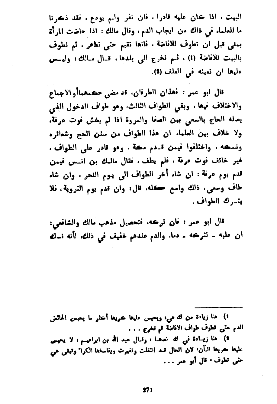 الْبَيْتِ إِذَا كَانَ عَلَيْهِ قَادِرًا فَإِنْ نَفَرَ وَلَمْ يُوَدِّعْ فَقَدْ ذَكَرْنَا مَا لِلْعُلَمَاءِ فِي ذَلِكَ مِنْ إِيجَابِ الدَّمِ وَقَالَ مَالِكٌ إِذَا حَاضَتِ الْمَرْأَةُ بِمِنًى قَبْلَ أَنْ تَطُوفَ لِلْإِفَاضَةِ فَإِنَّهَا تُقِيمُ حَتَّى تَطْهُرَ ثُمَّ تَطُوفُ بِالْبَيْتِ لِلْإِفَاضَةِ ثُمَّ تَخْرُجُ إِلَى بَلَدِهَا قَالَ مَالِكٌ وليس عليها أن تعينه في العلف قال أَبُو عُمَرَ فَهَذَانِ الطَّرَفَانِ قَدْ مَضَى حُكْمُهُمَا أَوِ الْإِجْمَاعُ وَالِاخْتِلَافُ فِيهِمَا وَبَقِيَ الطَّوَافُ الثَّالِثُ وَهُوَ طَوَافُ الدُّخُولِ الَّذِي يَصِلُهُ الْحَاجُّ بِالسَّعْيِ بَيْنَ الصَّفَا وَالْمَرْوَةِ إِذَا لَمْ يَخْشَ فَوْتَ عَرَفَةَ وَلَا خِلَافَ بَيْنَ الْعُلَمَاءِ أَنَّ هَذَا الطَّوَافَ مِنْ سُنَنِ الْحَجِّ وَشَعَائِرِهِ وَنُسُكِهِ وَاخْتَلَفُوا فِيمَنْ قَدِمَ مَكَّةَ وَهُوَ قَادِرٌ عَلَى الطَّوَافِ غَيْرُ خَائِفٍ فَوْتَ عَرَفَةَ فَلَمْ يَطُفْ فَقَالَ مَالِكُ بْنُ أَنَسٍ فِيمَنْ قَدِمَ يَوْمَ عَرَفَةَ إِنْ شَاءَ أَخَّرَ الطَّوَافَ إِلَى يَوْمِ النَّحْرِ وَإِنْ شَاءَ طَافَ وَسَعَى ذَلِكَ وَاسِعٌ كُلُّهُ قَالَ وَإِنْ قَدِمَ يَوْمَ التَّرْوِيَةِ فَلَا يَتْرُكِ الطَّوَافَ قَالَ أَبُو عُمَرَ فَإِنْ تَرَكَهُ فَتَحْصِيلُ مَذْهَبِ مَالِكٍ وَالشَّافِعِيِّ أَنَّ عَلَيْهِ لِتَرْكِهِ دَمًا وَالدَّمُ عِنْدَهُمْ خَفِيفٌ فِي ذَلِكَ لِأَنَّهُ نُسُكٌ